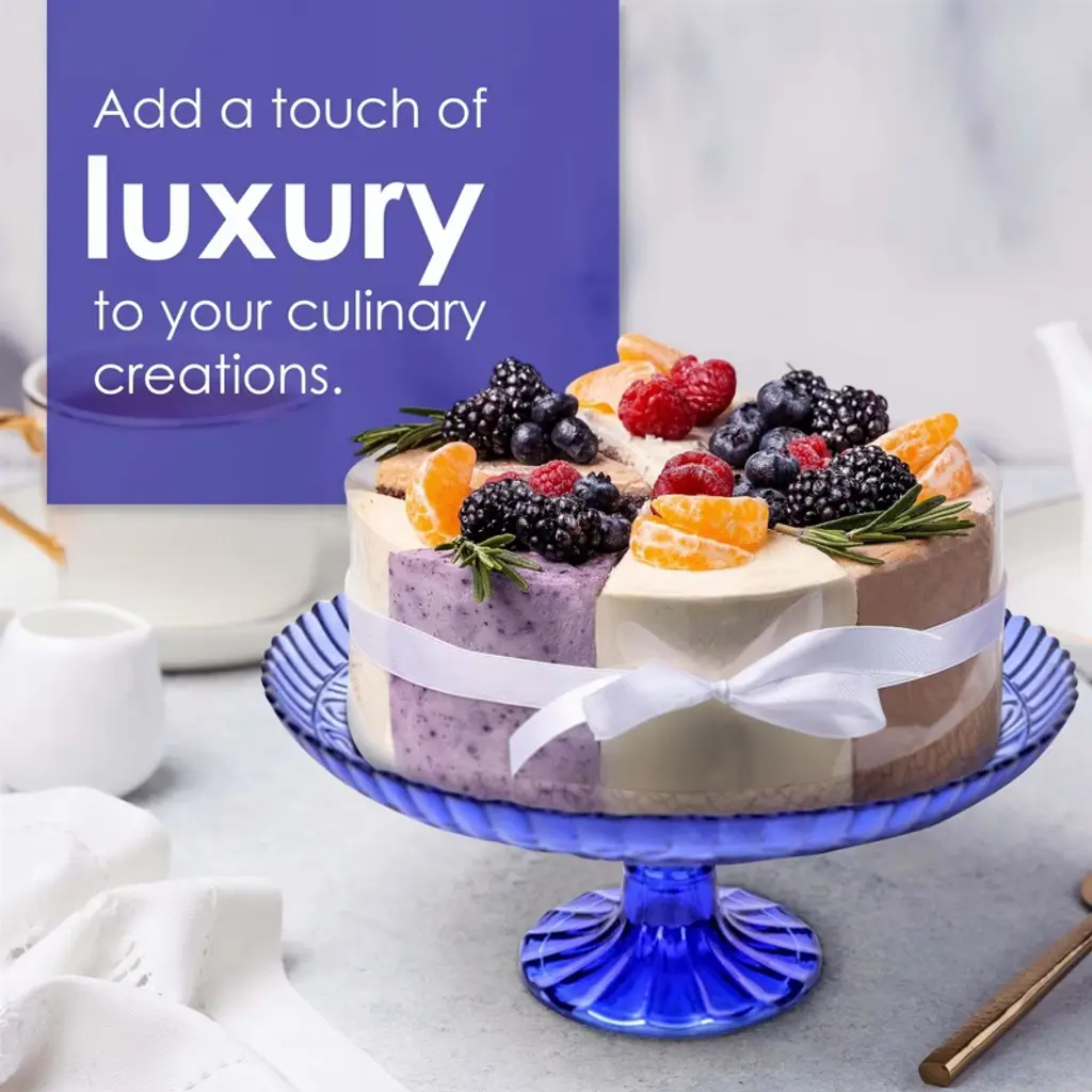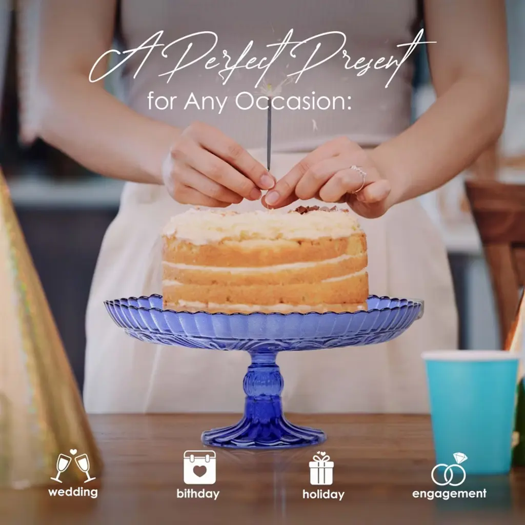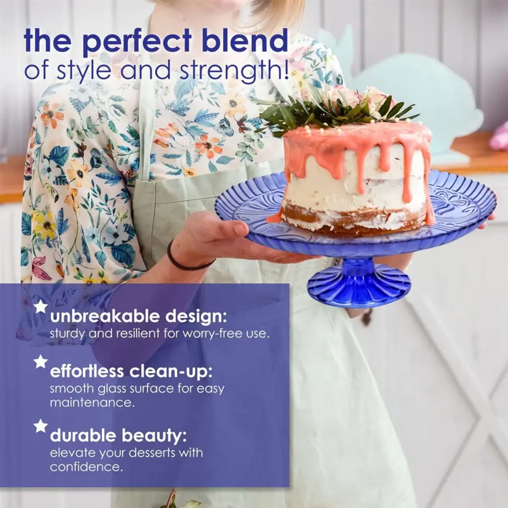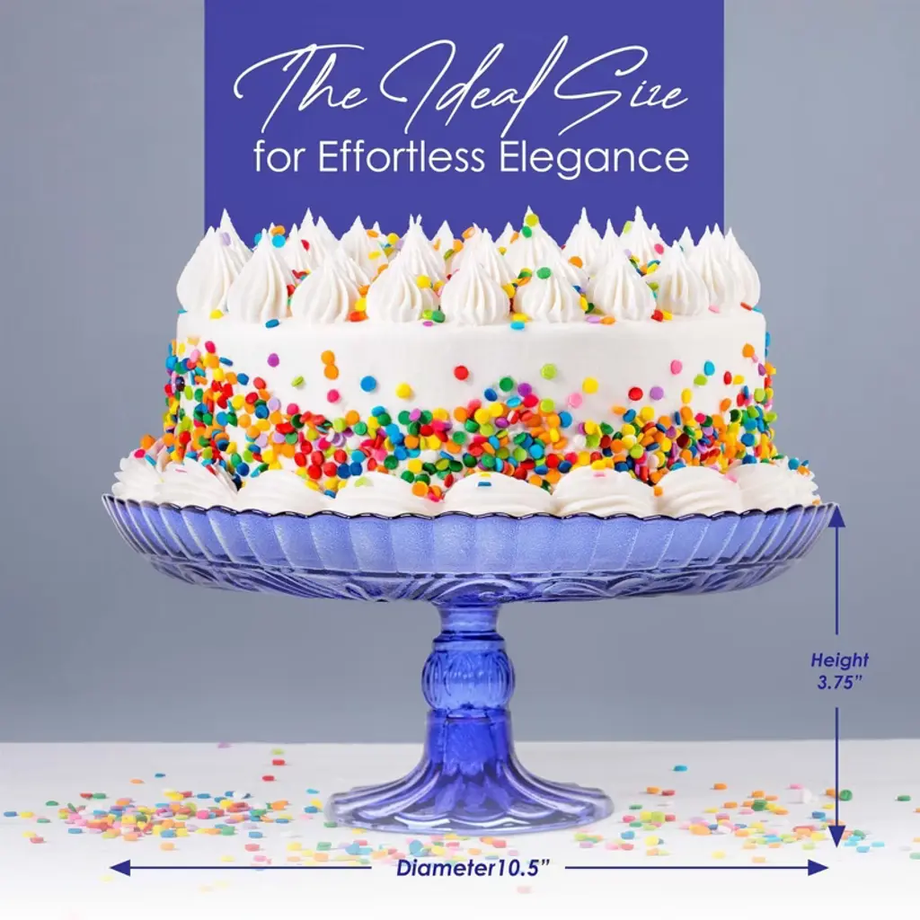 Elevate your dessert presentation with the Amici Home Flower Footed Glass Cake Stand, designed to bring vintage-inspired charm and sophisticated style to any event. Measuring 10.5 inches wide and 3.75 inches tall, this cobalt blue cake stand is the ideal centerpiece for weddings, birthdays, showers, holiday gatherings, and other celebrations. Crafted from durable soda lime glass, it features a raised floral design with lifted corners that enhances both texture and visual appeal, making it a decorative yet functional piece for your serving collection. The spacious surface accommodates cakes, cupcakes, pastries, cookies, or appetizers, allowing you to create stunning dessert tables for both casual gatherings and formal receptions. The rich cobalt finish catches the light beautifully, making it a standout accent for buffet spreads, dining room décor, or festive occasions. Unlike plain serving trays, this footed dessert stand provides height and dimension, drawing attention to your culinary creations while complementing a variety of event themes, from vintage to modern. Ideal as a decorative cake pedestal, this piece is perfect for hosts, entertainers, and event planners looking to create unforgettable displays. To maintain the clarity and brilliance of this glass stand, hand washing with mild soap and warm water is recommended. This ensures your floral cake stand remains a cherished serving accessory for every special event.