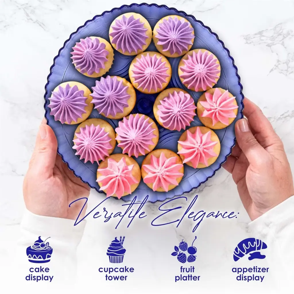 Amici Home Flower Footed Glass Cake Stand, Vintage Style Floral Design With Lifted Corners, Dessert Display - Cobalt Blue Soda Lime Glass