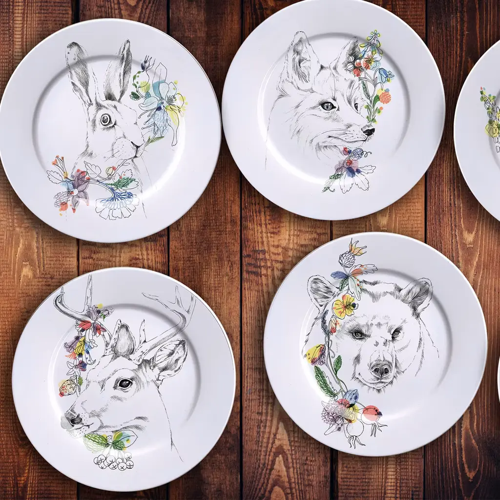 A black bear's face rendered in exquisite details and resembling a splendid freehand drawing is the decorative focus of this prized dinner plate in fine white porcelain. A garland of foliage and wildflowers painted with polychrome spots veils its profile, lending a feminine and lively character to the piece. Part of the An Ode To The Woods Collection, it is a one-of-a-kind artisan plate apt for safe oven and dishwasher use.