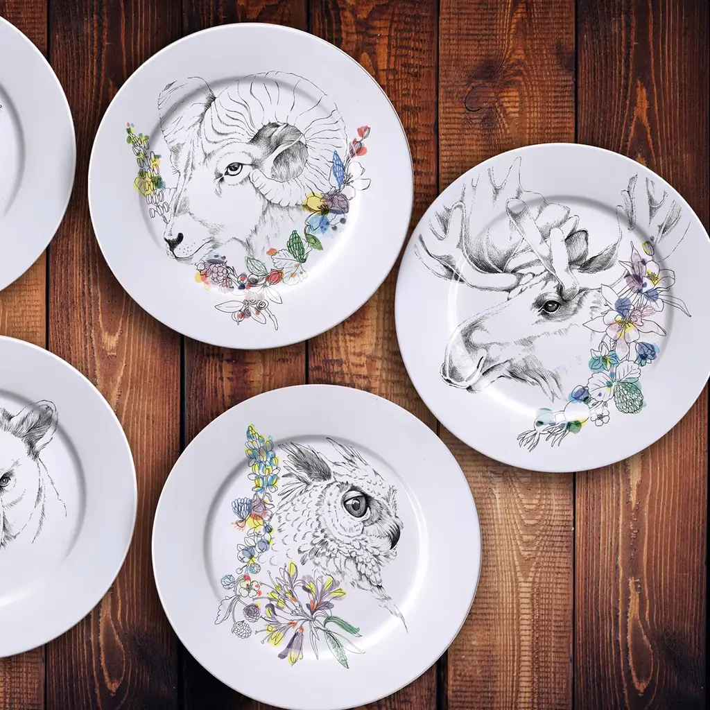 Artful and delicate, this prized porcelain dinner plate belongs to a tableware collection that was eloquently named An Ode To The Woods. A wildflower and leaves garland is handpainted in vibrant hues to flank a suggestive moose's face rendered in dainty black traits reminding of an authentic pencil drawing. Oven- and dishwasher-safe, this one-of-a-kind design comes in multiple options of animals from the woods.