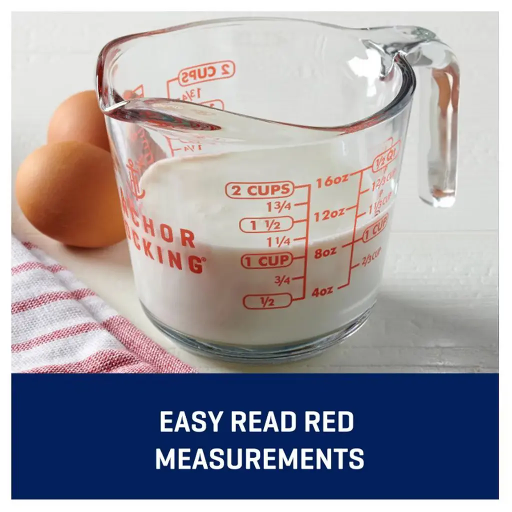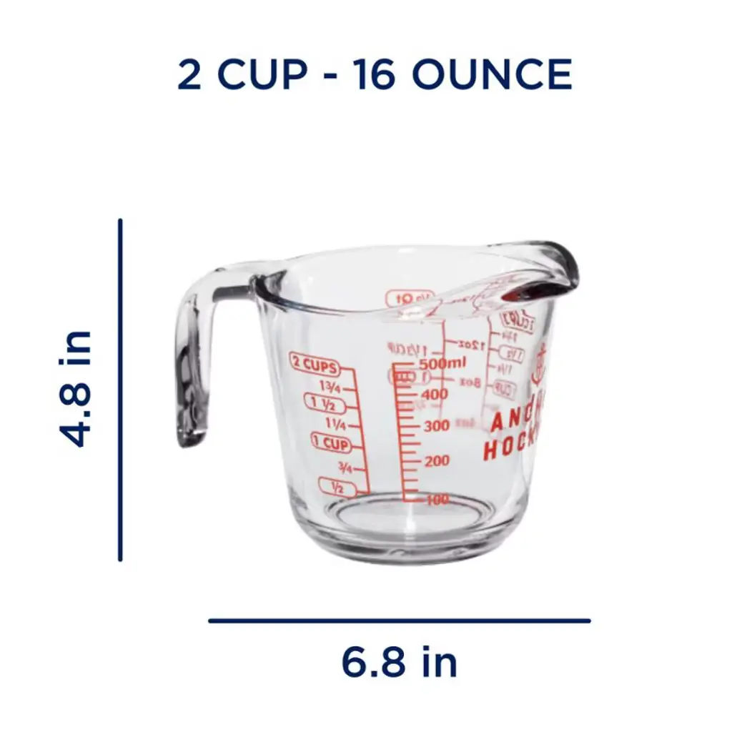 Anchor Hocking’s 16-ounce glass measuring cup has an easy-grip handle and a signature spout to ensure sturdy and reliable measuring, mixing, and pouring. Glass is tempered tough to handle the oven, microwave, dishwasher, fridge, and freezer. Red markings in imperial and metric units are etched on so they won't scratch or wash off. From whipped coffee to trendy mug cakes, our glass measuring cup promises to up your kitchen game with precision and perfection. INCLUDES: (1) Anchor Hocking 16-ounce glass measuring cup with a signature spout and handle for easy, clean pouring to reduce messes and ensure you can be as exact as possible in your cooking.EASY READ LINES: Our glass measuring cups have bright red markings in imperial and metric units. Because lines are fired on, they won’t scratch or wash off like other liquid measuring cups.MICROWAVE, DISHWASHER, FRIDGE/FREEZER SAFE: Measuring cups melt, mix, and reheat. Sturdy, solid glass ensures you can whisk, beat, and pour in the same cup you measure.