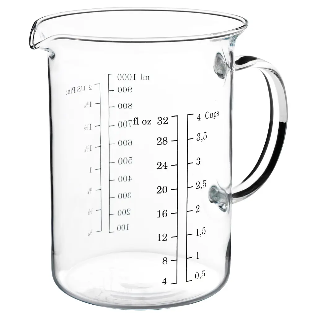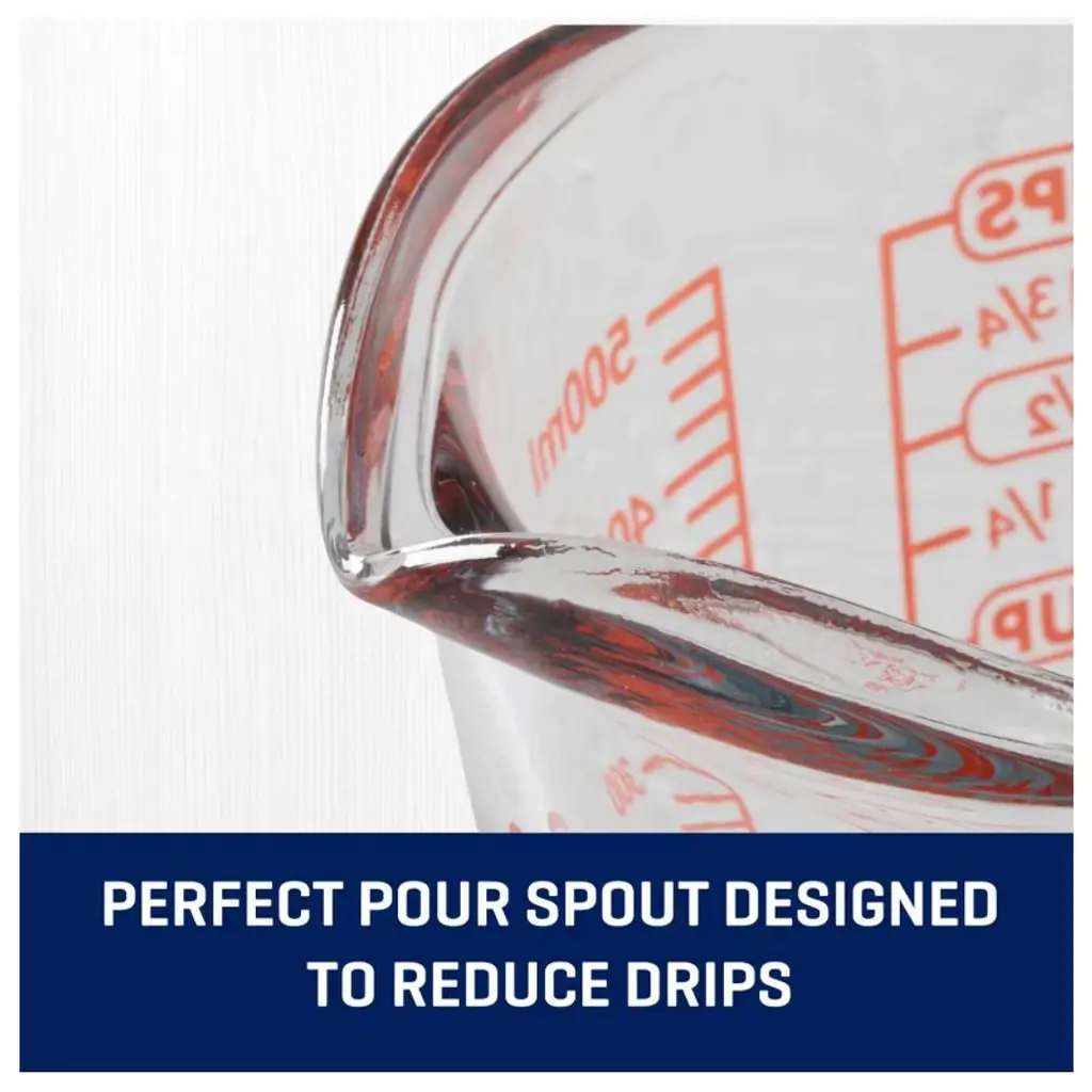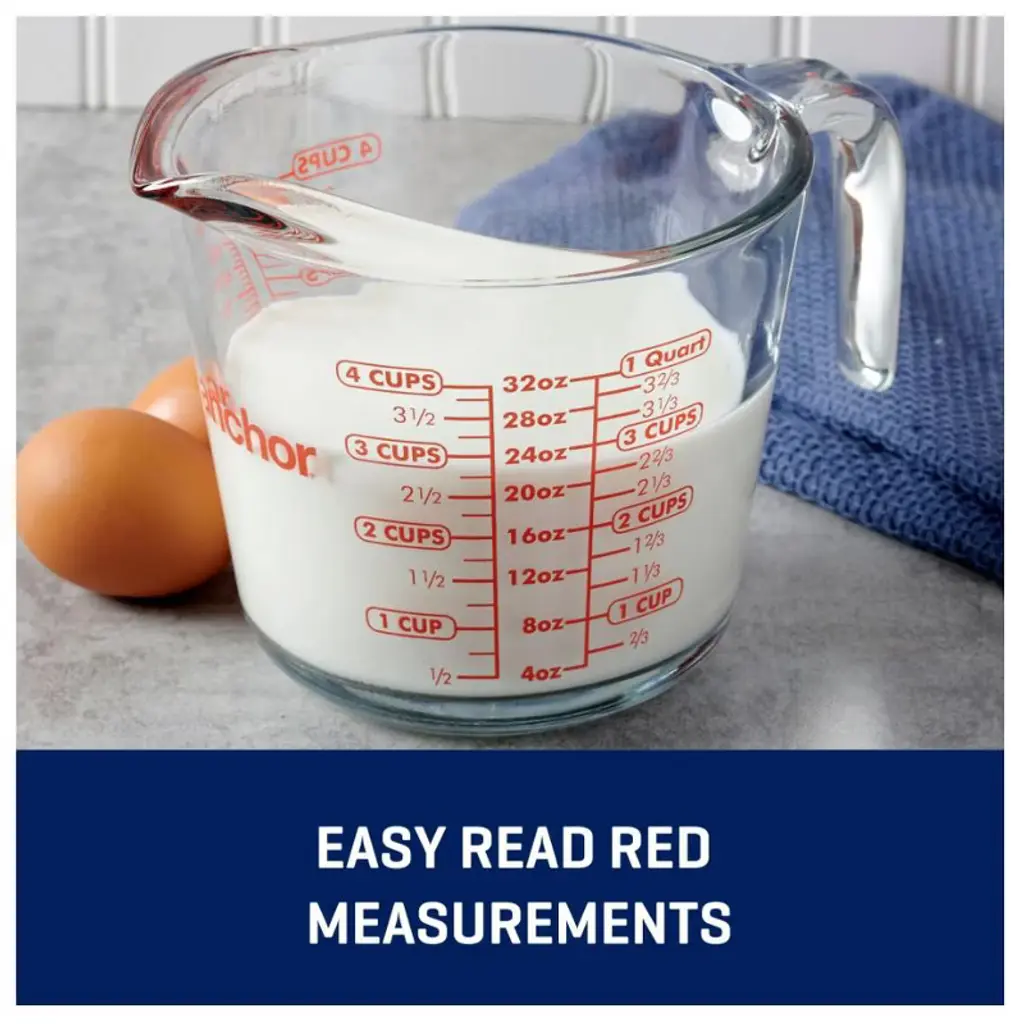 Anchor Hocking’s 32-ounce glass measuring cup has an easy-grip handle and a signature spout to ensure sturdy and reliable measuring, mixing, and pouring. Glass is built tough to handle the microwave, dishwasher, fridge, and freezer. Red markings in imperial and metric units are etched on so they won't scratch or wash off. From whipped coffee to trendy mug cakes, our glass measuring cup promises to up your kitchen game with precision and perfection. INCLUDES: (1) Anchor Hocking 32-ounce glass measuring cup with a signature spout and handle for easy, clean pouring to reduce messes and ensure you can be as exact as possible in your cooking.EASY READ LINES: Our glass measuring cups have bright red markings in imperial and metric units. Because lines are fired on, they won’t scratch or wash off like other liquid measuring cups.MICROWAVE, DISHWASHER, FRIDGE/FREEZER SAFE: Measuring cups melt, mix, and reheat. Sturdy, solid glass ensures you can whisk, beat, and pour in the same cup you measure.