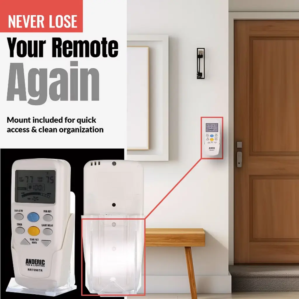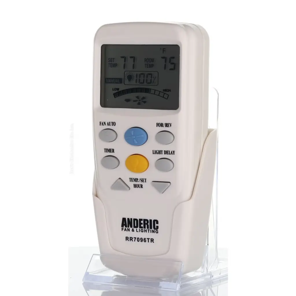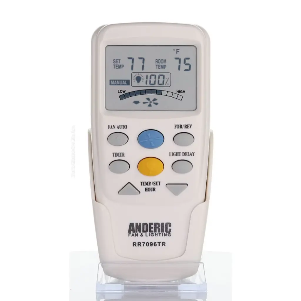 The Anderic RR7096TR thermostatic remote is a high-quality replacement for the original Hampton Bay CHQ7096T remote and is manufactured by the same factory that produced the original. Designed for seamless compatibility, this remote delivers full fan control with features such as Forward/Reverse (FOR/REV), fan speed settings, dimmable light control, and temperature-based automation. It also includes specialized functions like Light Delay, Fan Auto, and Light Timer for enhanced comfort and energy efficiency. Compatible with receivers such as UC7067FCRX, UC70960TX, and UC7067REVB, the RR7096TR is easy to install and includes a wall mount bracket and screws. Please note that this remote only supports down-light dimming and is not compatible with CHQ8BT7096T models that feature a red light button, nor is it fully compatible with Windward III fans. For optimal dimming performance, incandescent bulbs are required.