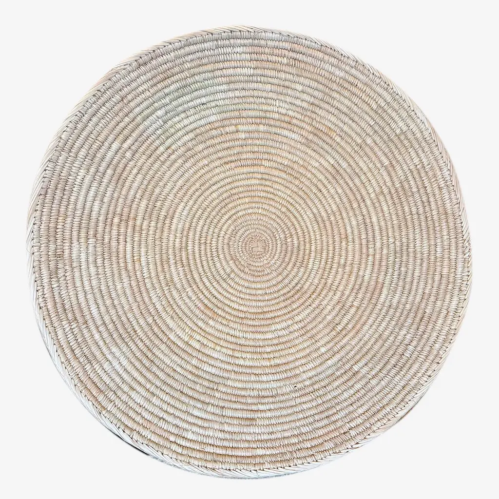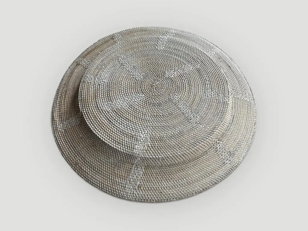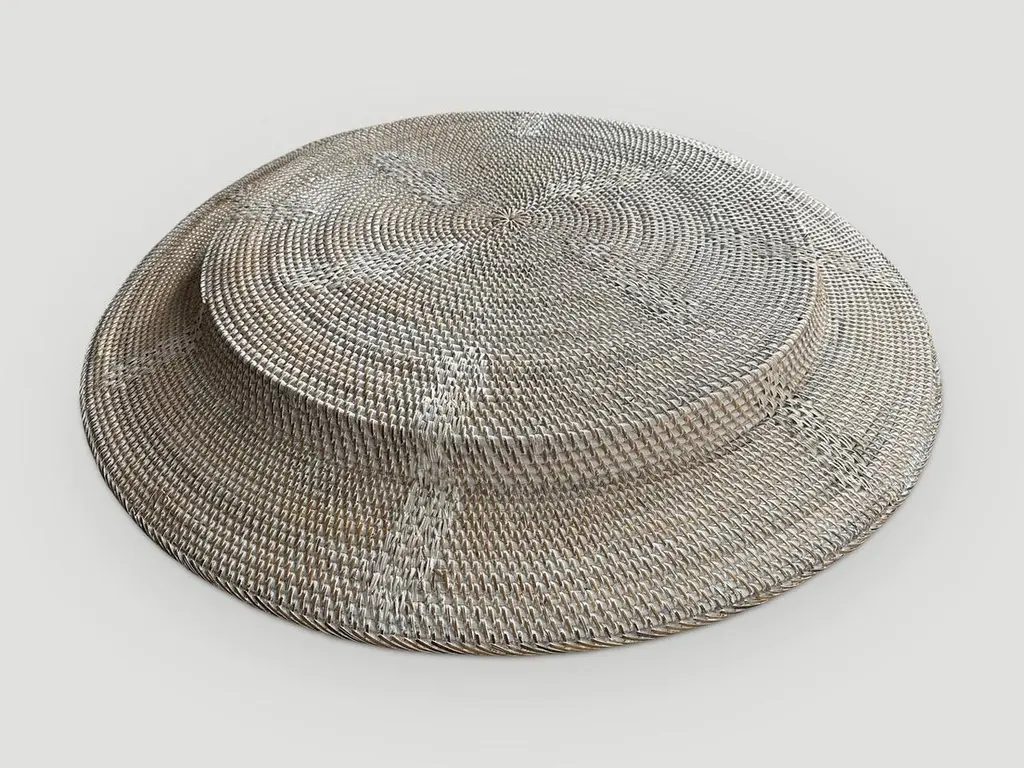 Beautiful oversized hand woven rattan platter. We added a white wash to this impressive piece. Fabulous hung on a wall, to hold towels by a pool, or to place magazines to name a few suggestions.Own an Andrianna Shamaris original.Andrianna Shamaris. The Leader In Modern Organic Design.