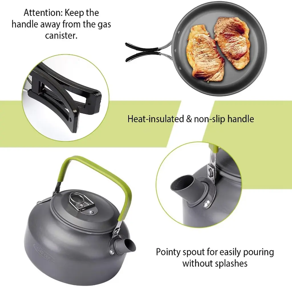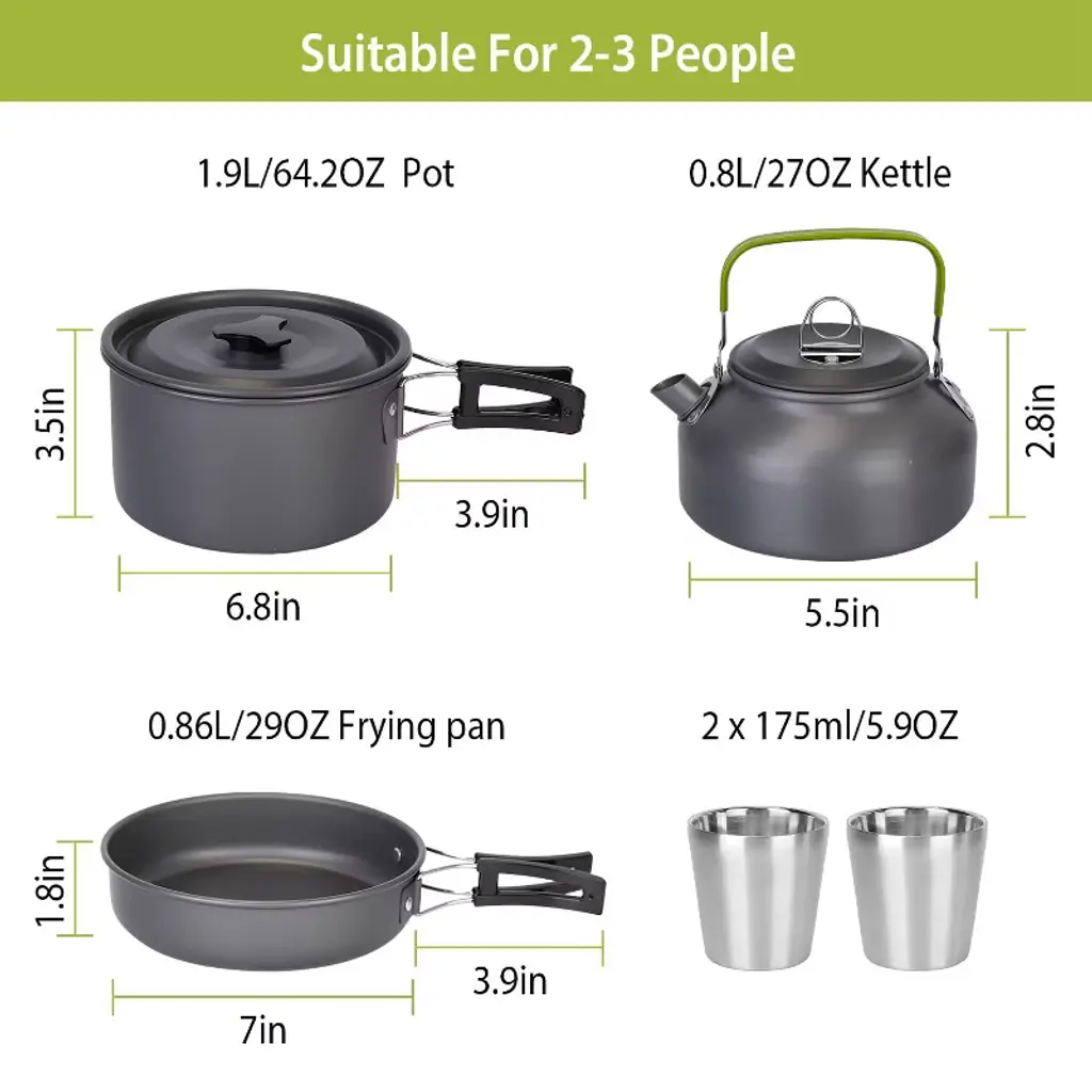 Pack light and cook well with Angel Sar’s 12-piece camping set. This lightweight aluminum cookware includes pots, pans, and utensils—all nesting compactly for easy outdoor adventures.