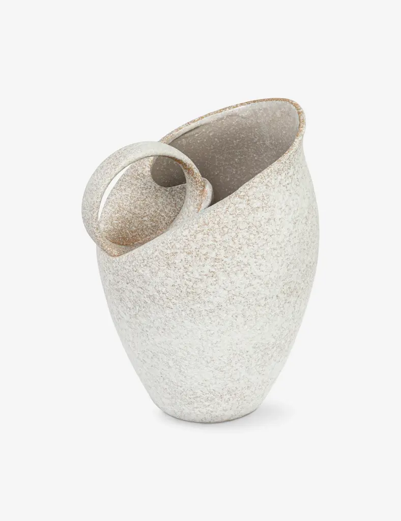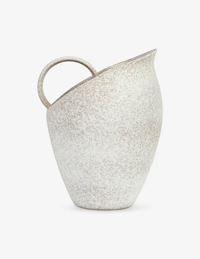 A sand-like finish brings a coastal charm to this modern stoneware pitcher. Its sleek silhouette is enhanced by a large looping handle and a reactive white glaze for a rich textural character.