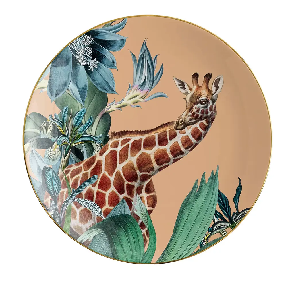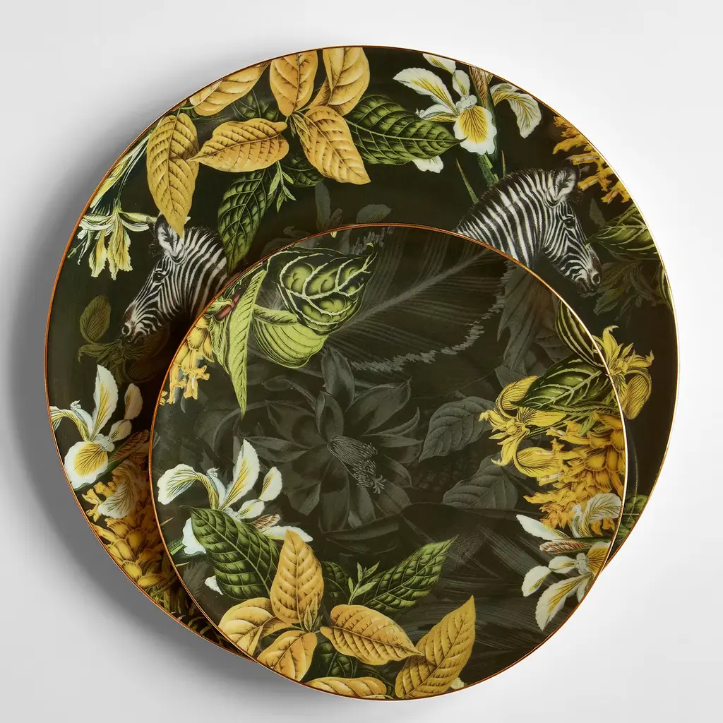 The Animalia Dinner Plate features a dynamic illustration of zebras with tropical flowers and foliage. Made from high quality porcelain and in striking tones of black, white, gold and green, this remarkable plate will bring an exotic look to any dining table.