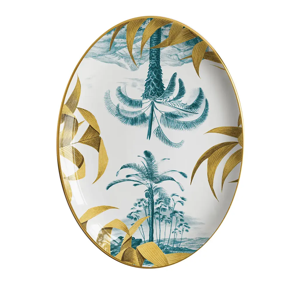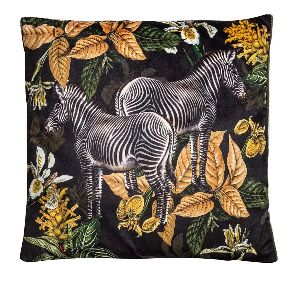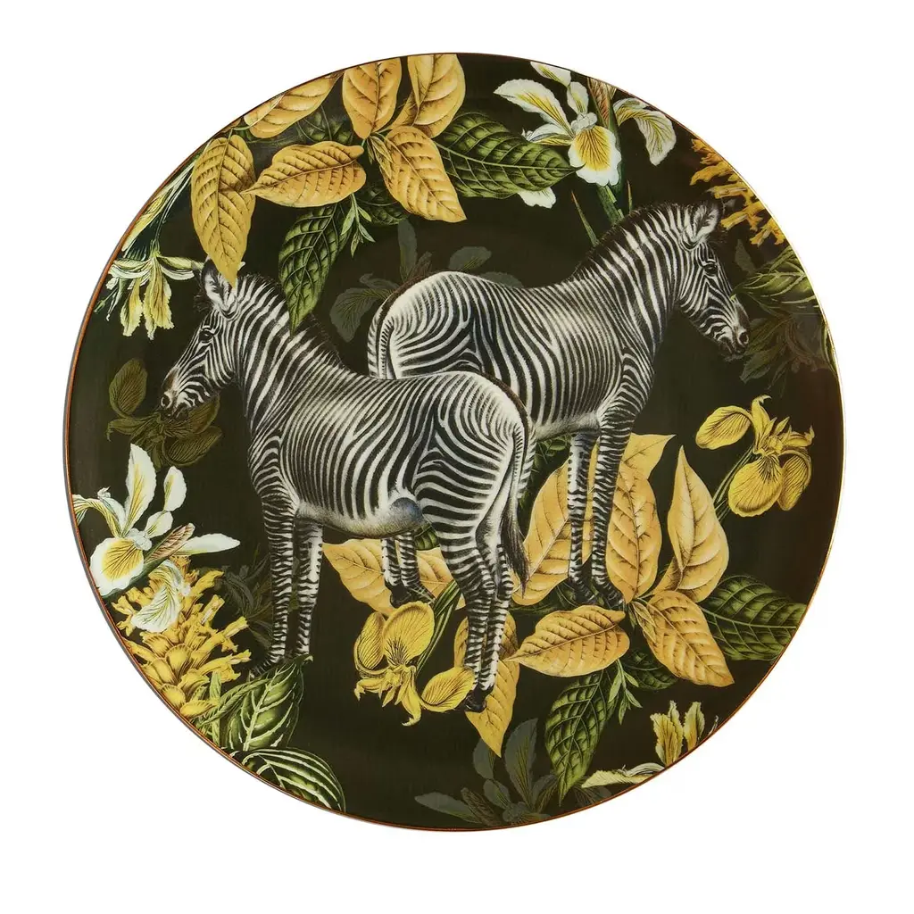 Part of an exquisite series inspired by tropical flora and fauna, this stunning fruit plate features a superb and realistic image of an elegant zebra standing on a black backdrop surrounded by a yellow foliage. Fashioned of fine porcelain, it will add an accent of modern sophistication to any decor.