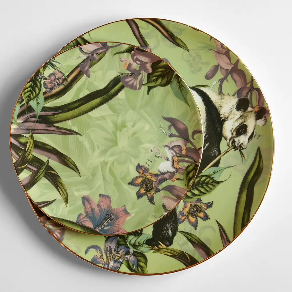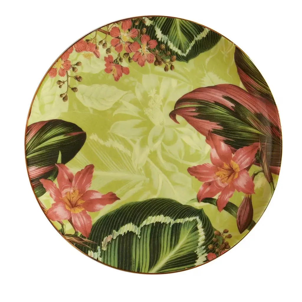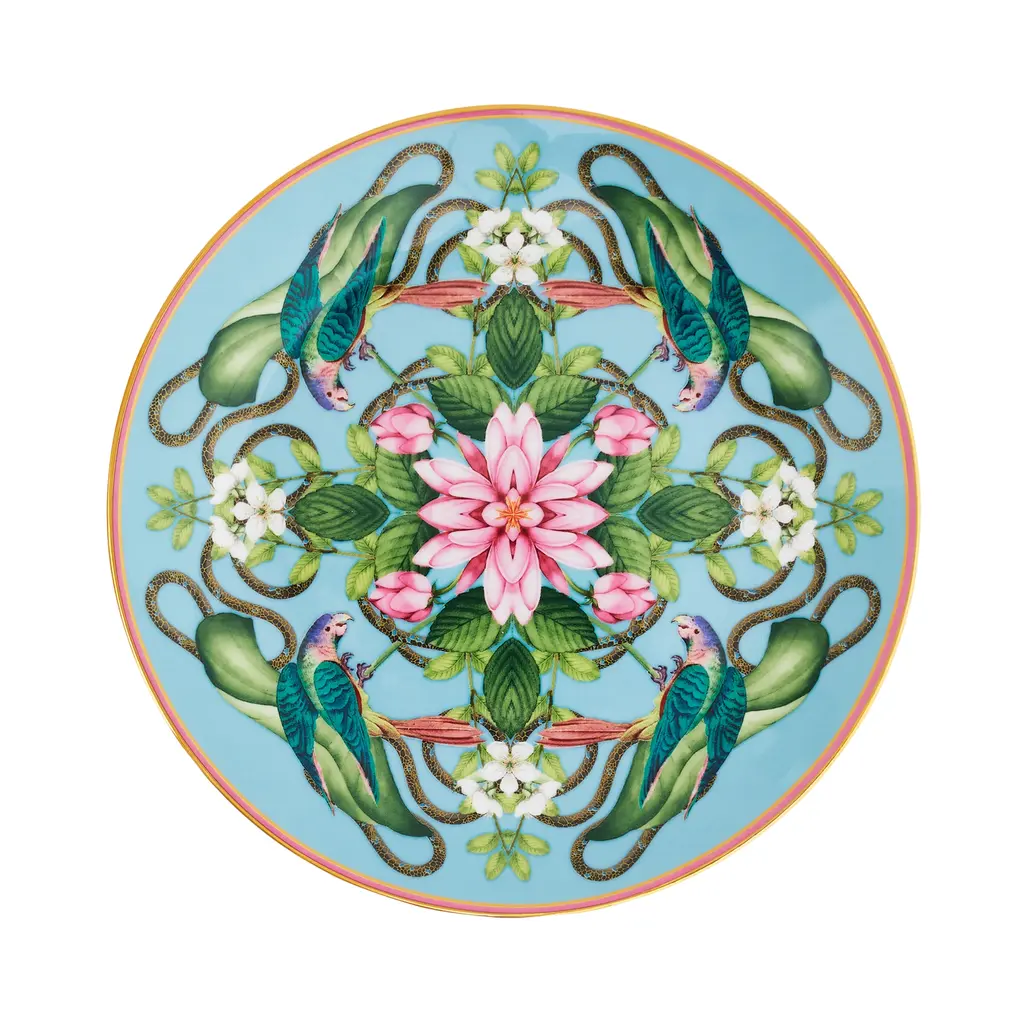 Featuring stunning illustration work of tropical lilies and foliage on a pastel green background, the Animalia Dessert Plate measures 21 cm in diameter and offers an understated exotic style to any contemporary table ware. Made from high quality porcelain.