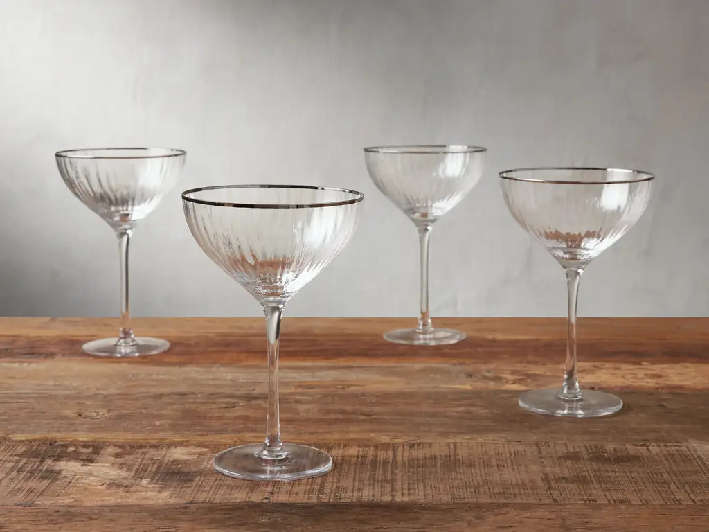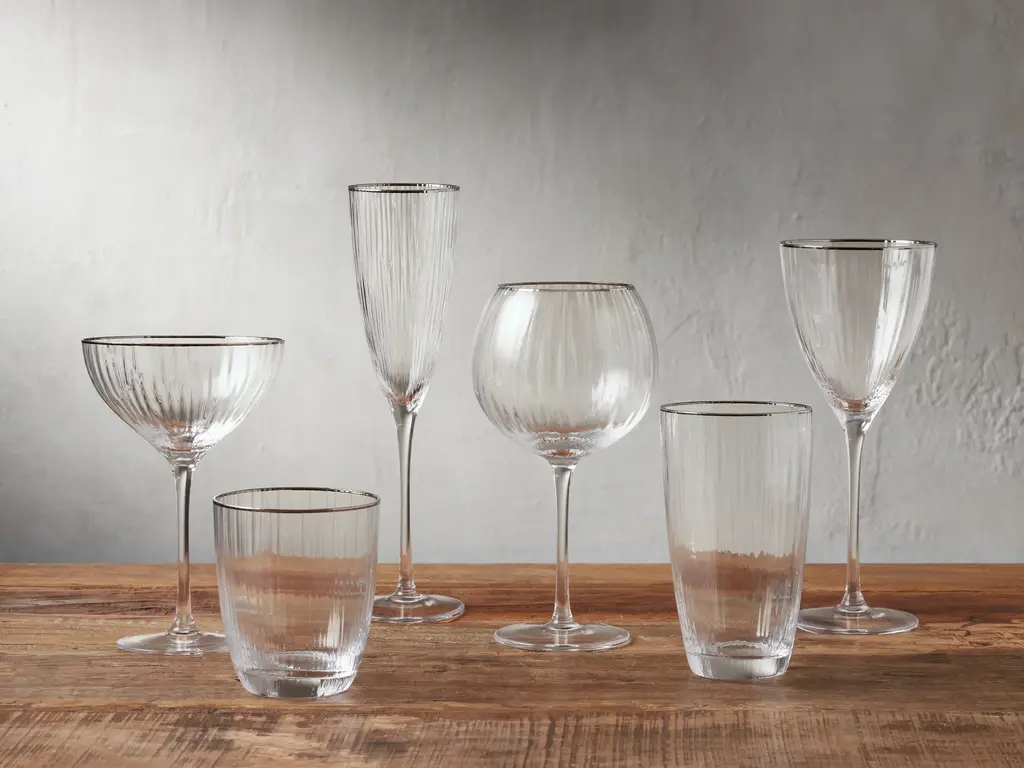 Designed with contemporary flare to complement any dinnerware collection, our Anisa Glassware is crafted from hand-blown glass with ribbed glass adorned with hand-painted rims. Set of four glasses; each with a 13.5 fl oz. capacity.