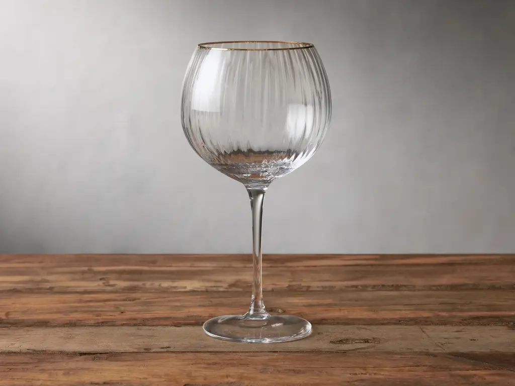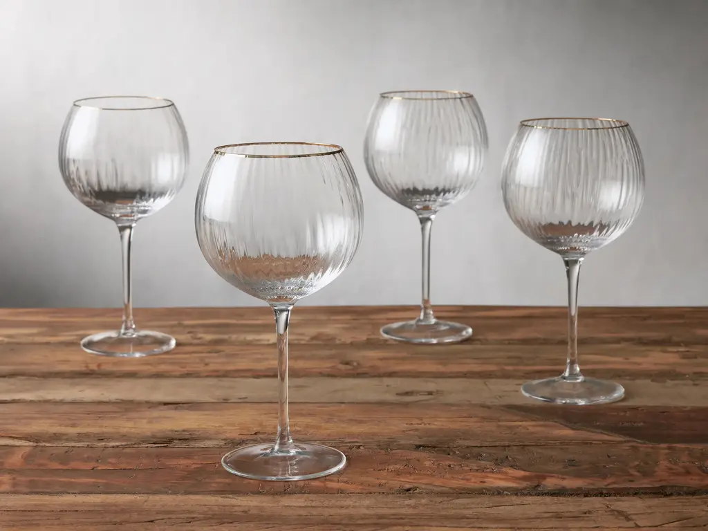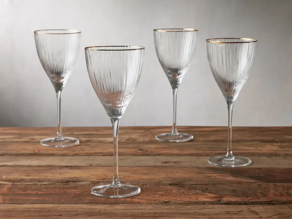 Designed with contemporary flare to complement any dinnerware collection, our Anisa Glassware features ribbed glass adorned with hand-painted rims. Set of four cocktail glasses; each with a 13.5 fl oz. capacity.