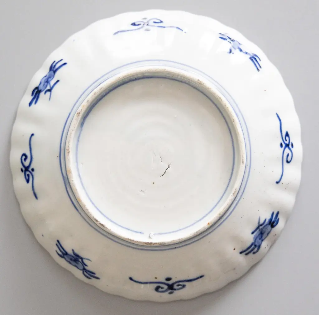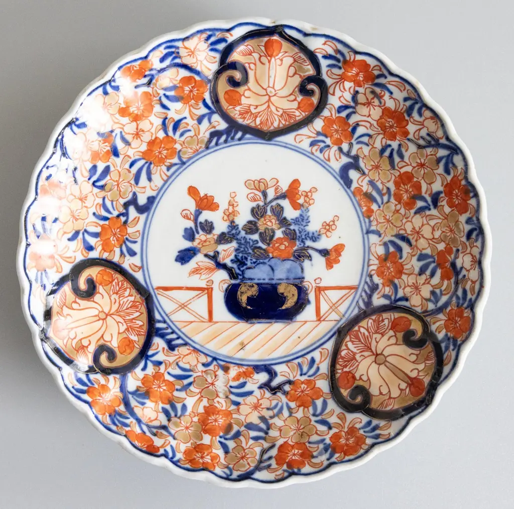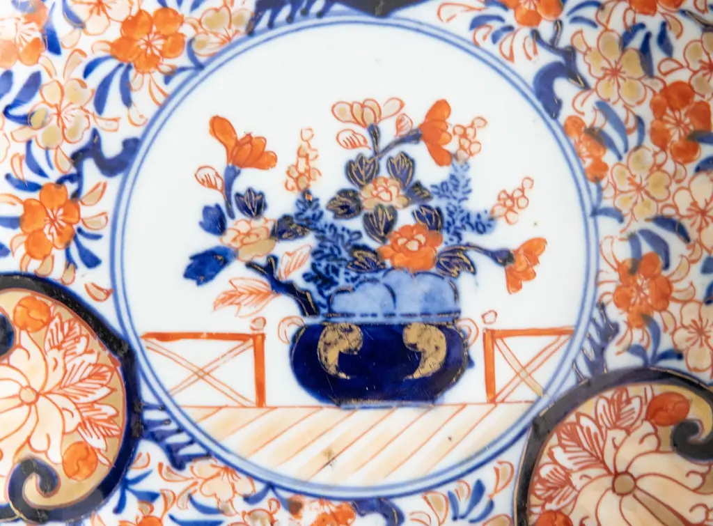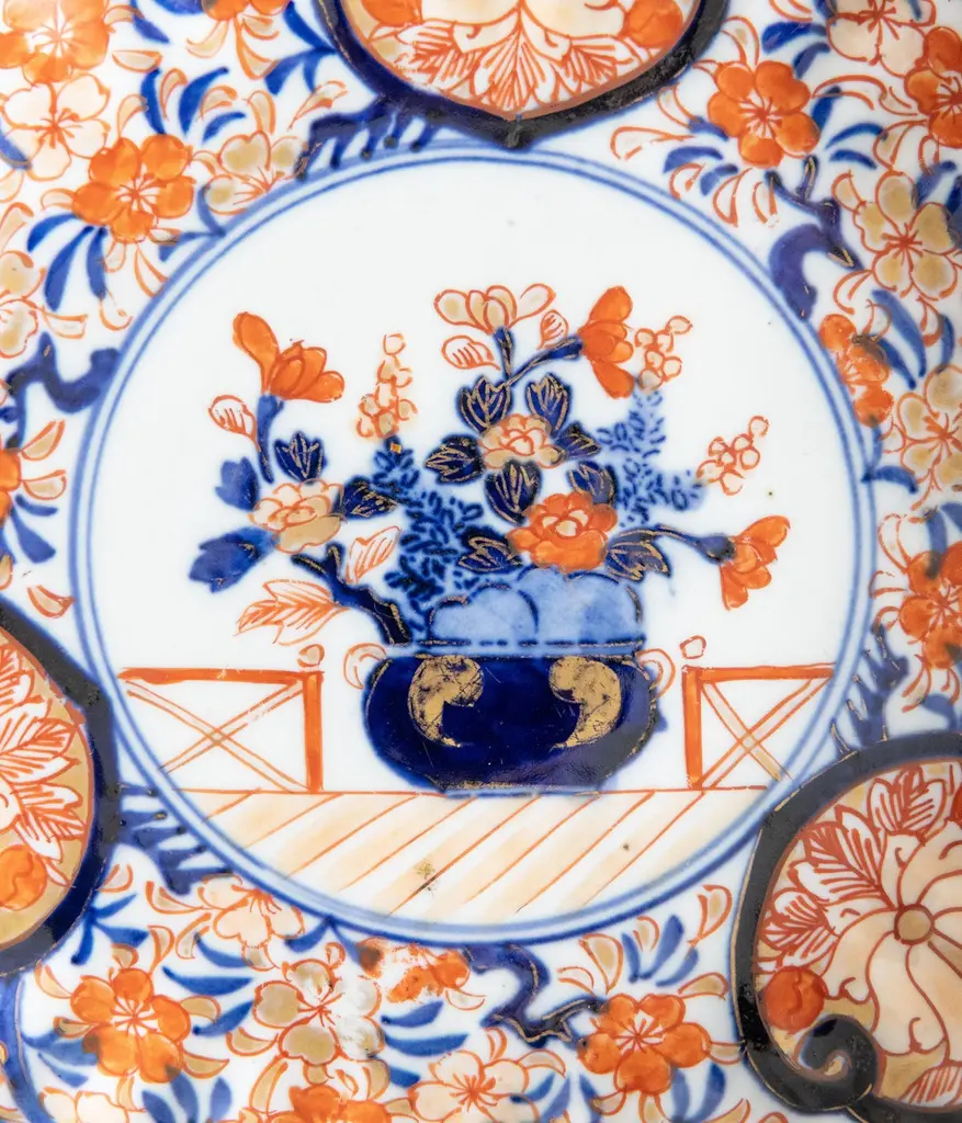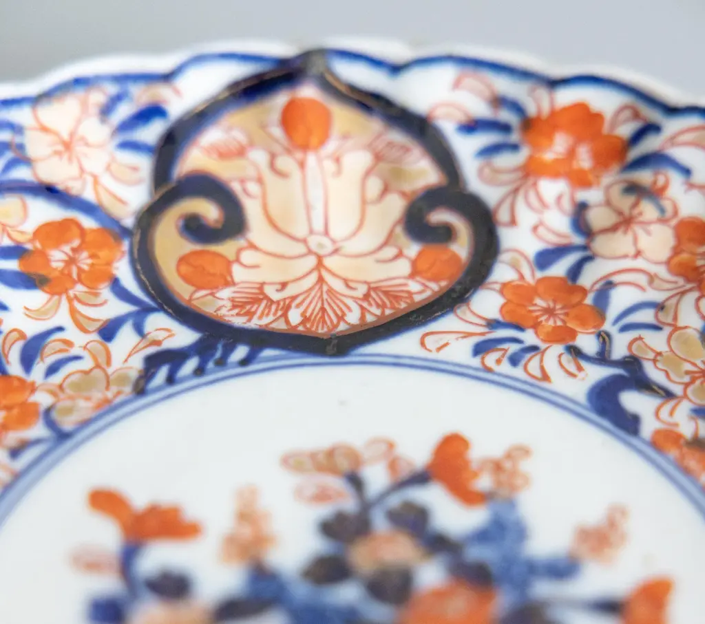 A striking 19th century antique Imari plate with a scalloped edge. Featuring vibrant oranges, blues, and green. The multi-color design depicts traditional Japanese motifs, showcasing the intricate craftsmanship of the era. Originating from Japan, this antique original plate is a collector's item that reflects the rich cultural history and artistry of the region.
