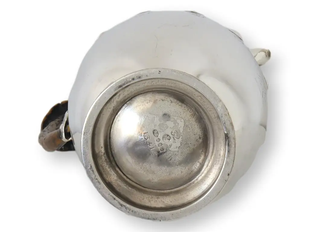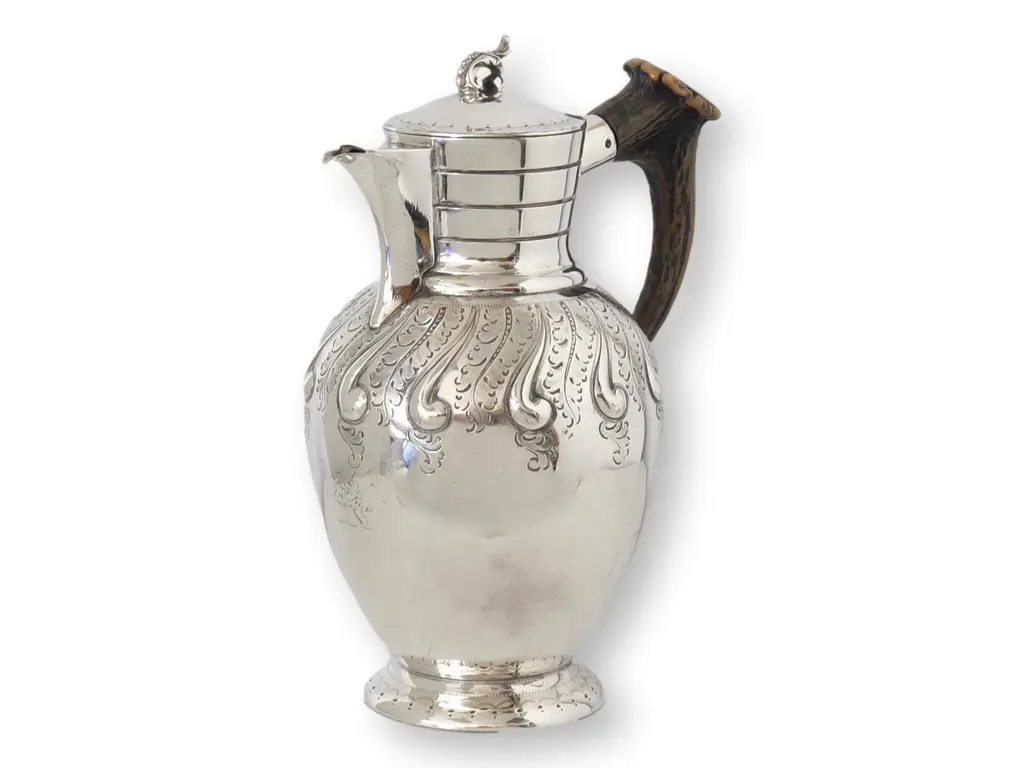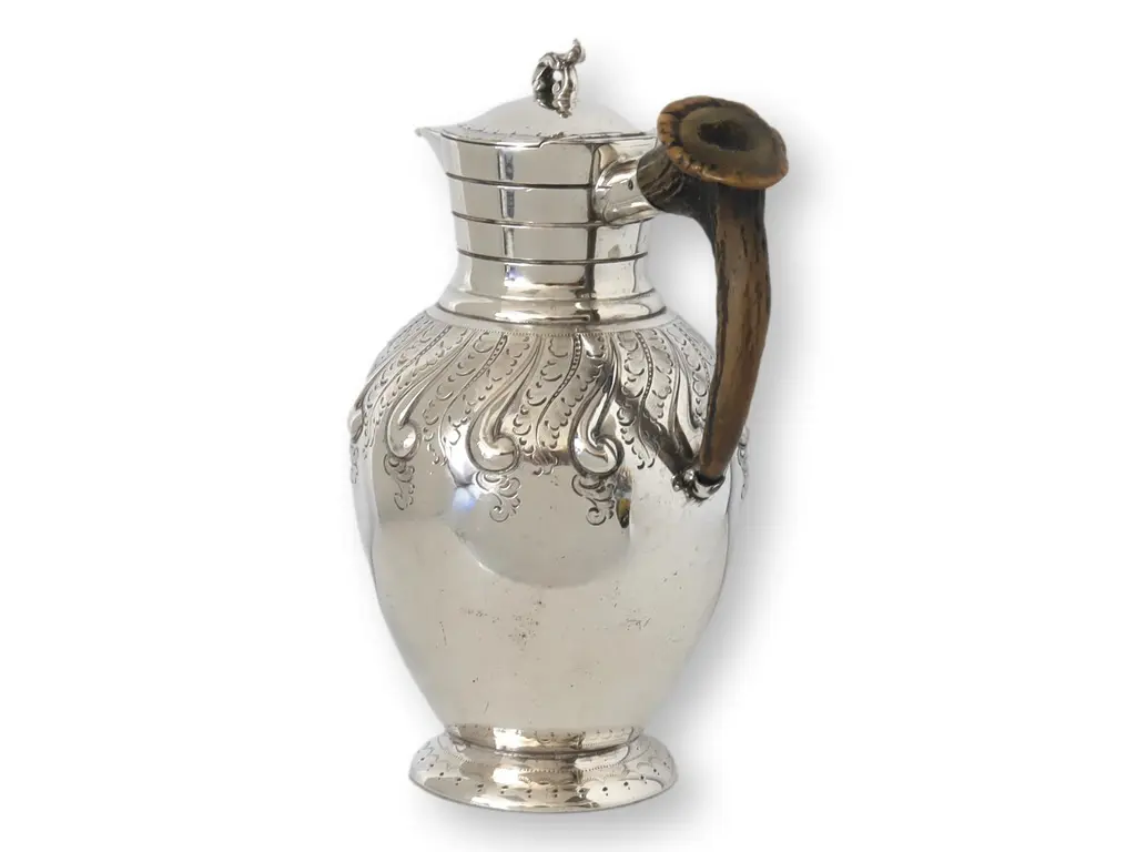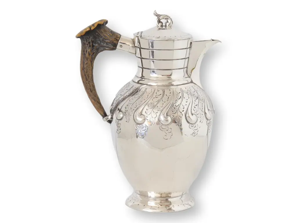 Antique English Wine Carafe with natural horn handle. A fusion of elegance and rustic charm, this wine carafe is crafted in fine silver-plate, showcasing exquisite English craftsmanship. Its distinguishing feature, a genuine antler handle, adds a touch of natural beauty. A testament to its authenticity and quality, the carafe is hallmarked on the bottom, making it a coveted piece for collectors and enthusiasts alike. Impressed English silver-plate marks/hallmarks.