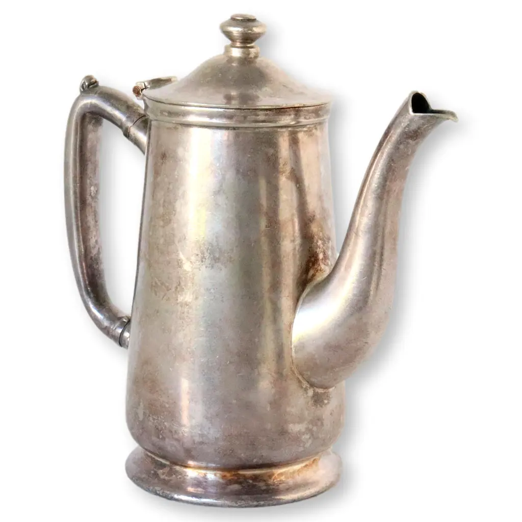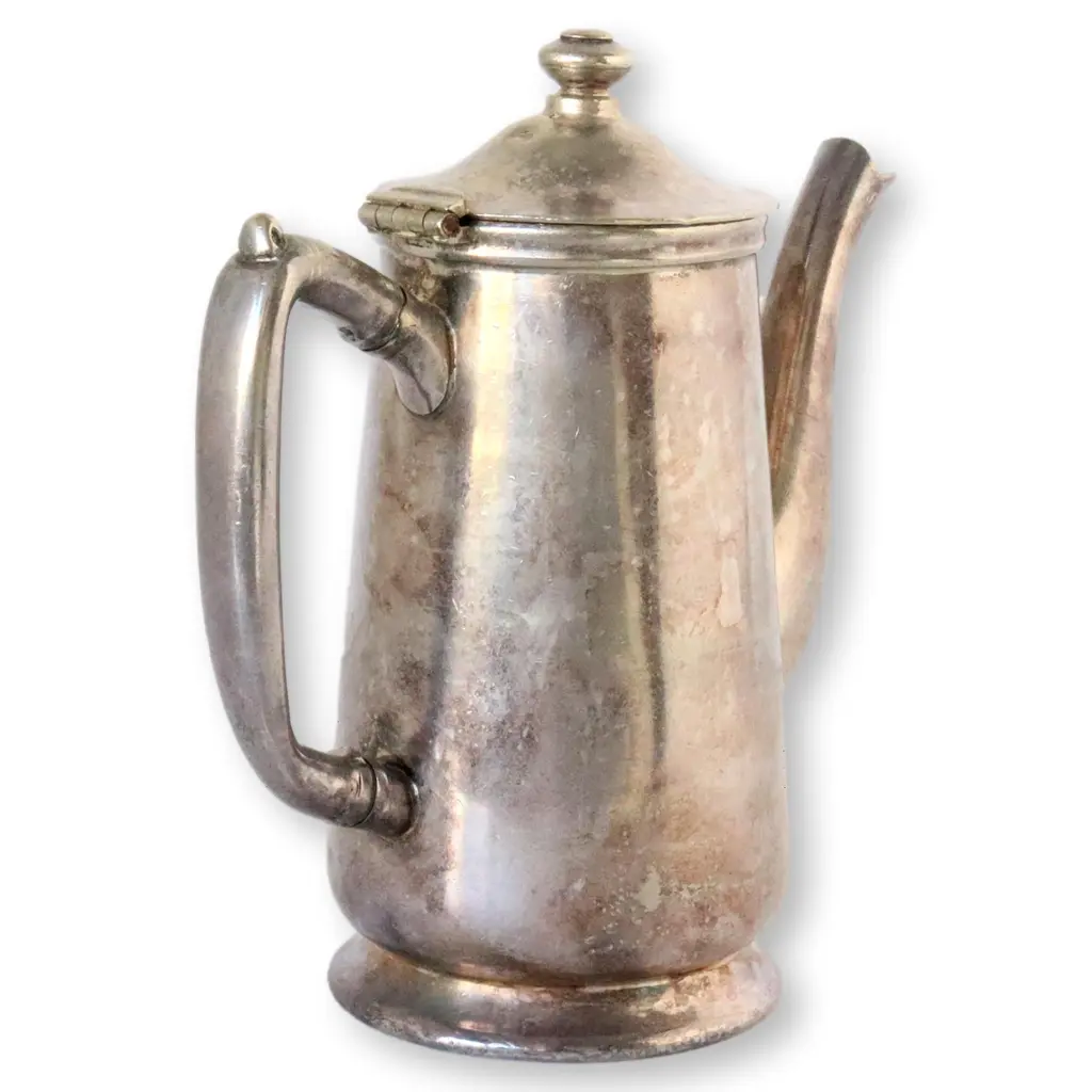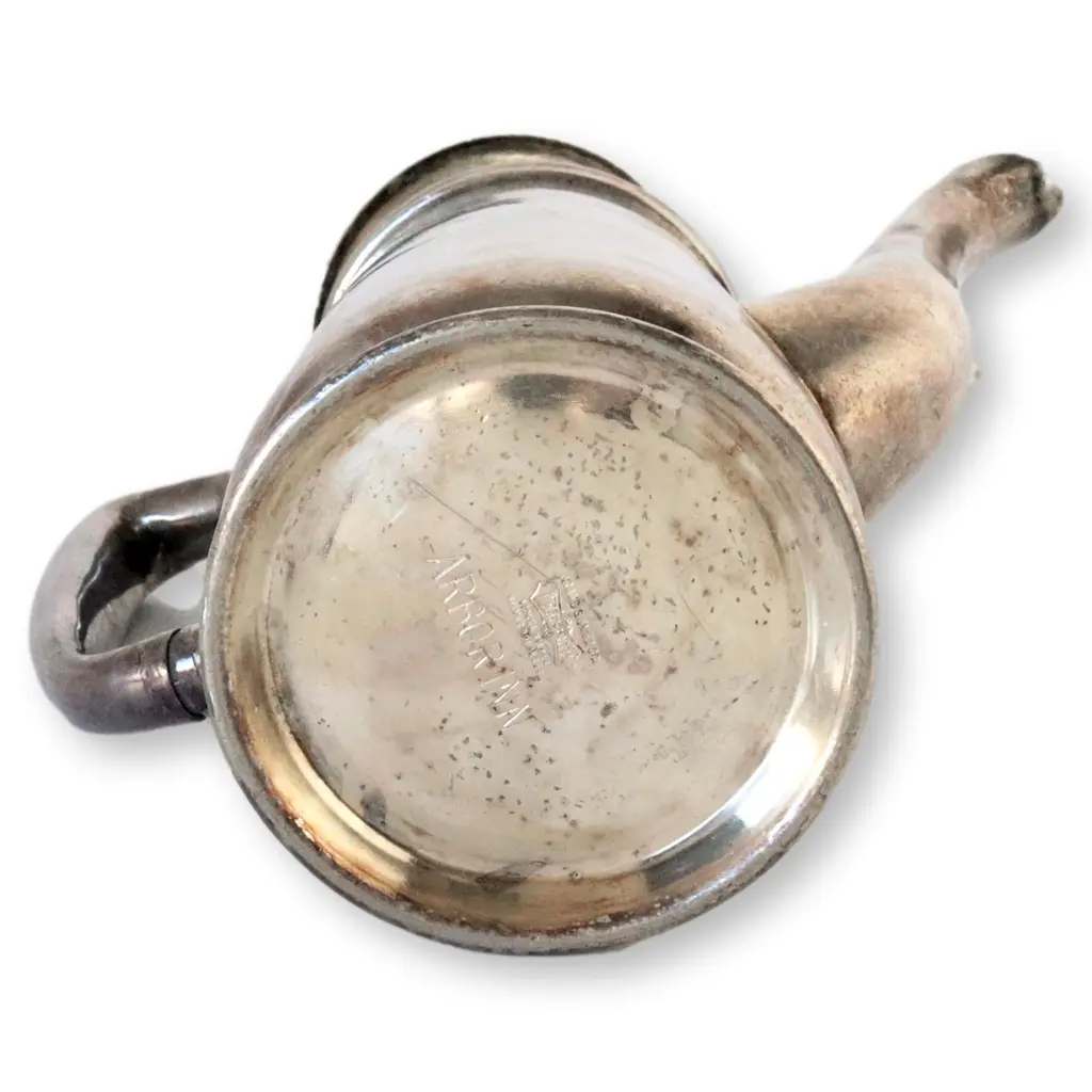 Very heavy silver-plate hotelware coffee/tea pot marked for "Arbor Inn". Current trends are to keep the age old patina, which is impossible to artificially duplicate. It could be highly polished if desired. Maker's mark on underside.