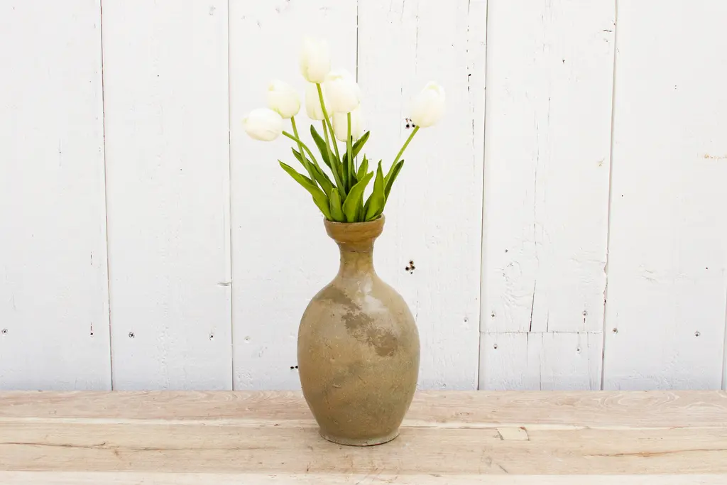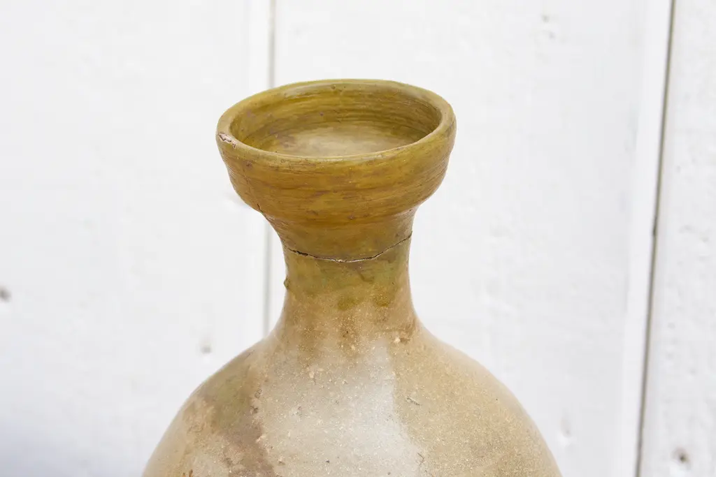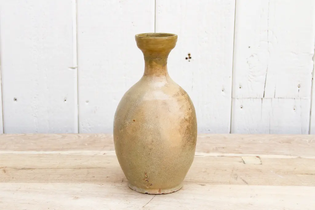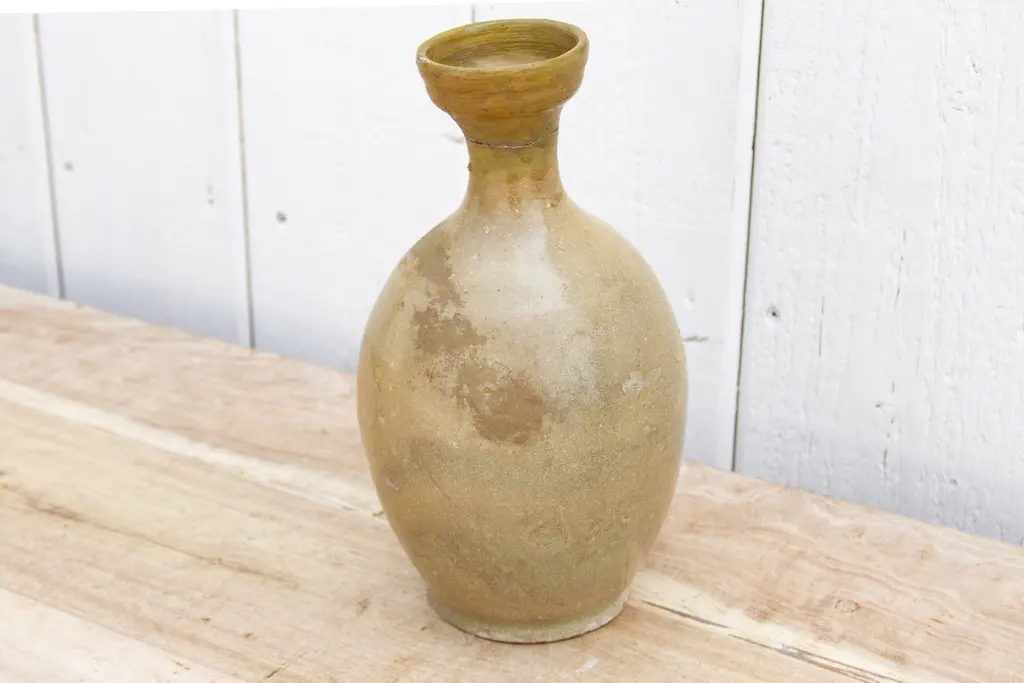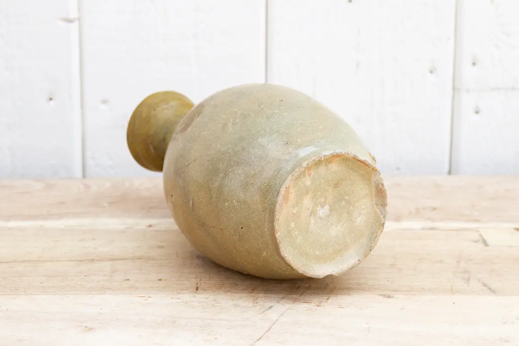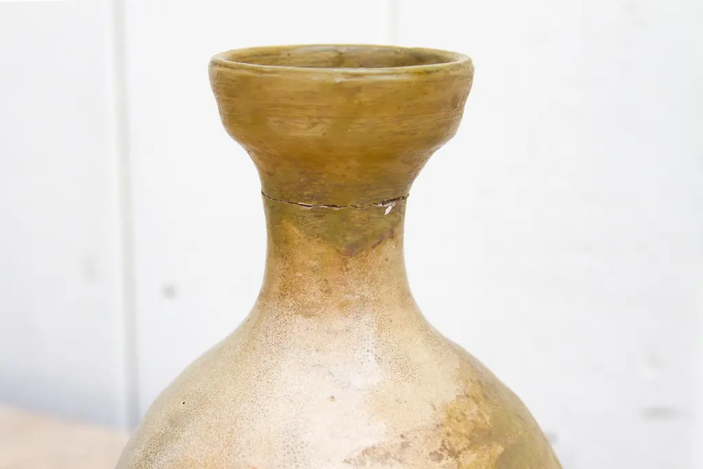 Exquisite artifact from the early Korean Yi Dynasty, behold this captivating bottle-vase adorned with a stunning celadon glaze. This remarkable piece, though displaying signs of its age and history. The neck has been broken off and shows visible repair. This antique glazed bottle features a rounded body with slim elongated neck, shows a chipped mouth rim indicating the natural wear and tear that comes with the passage of time.