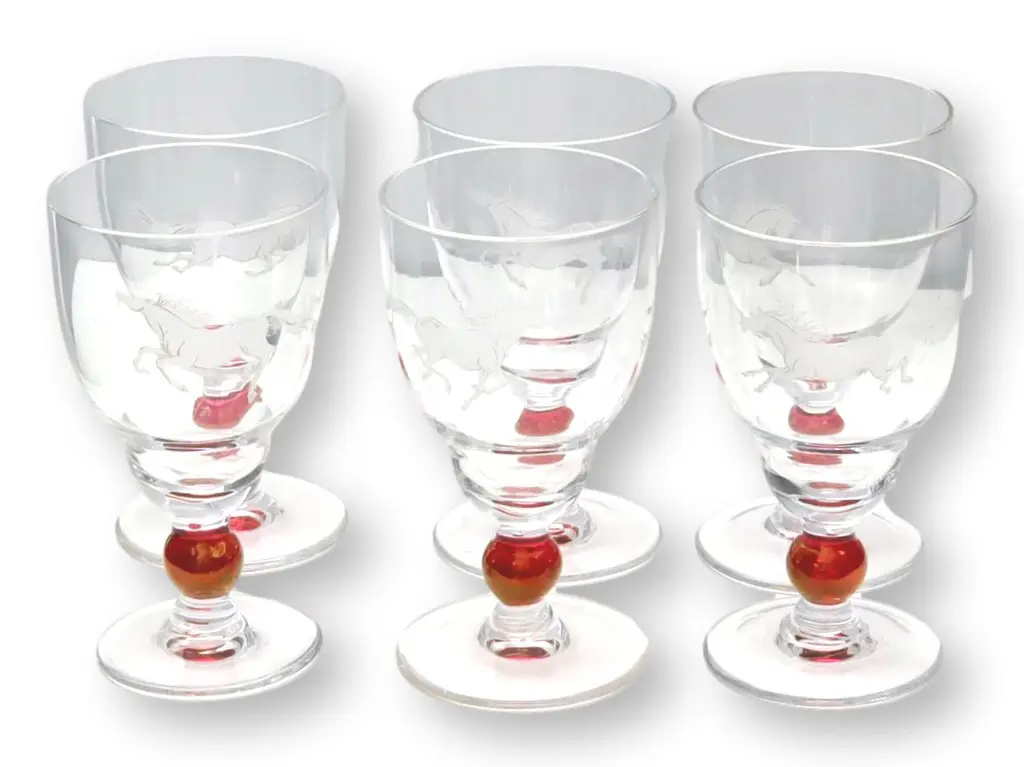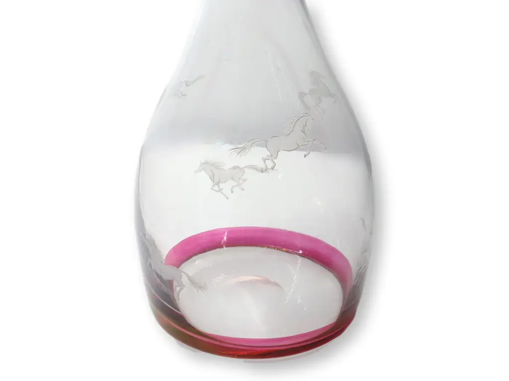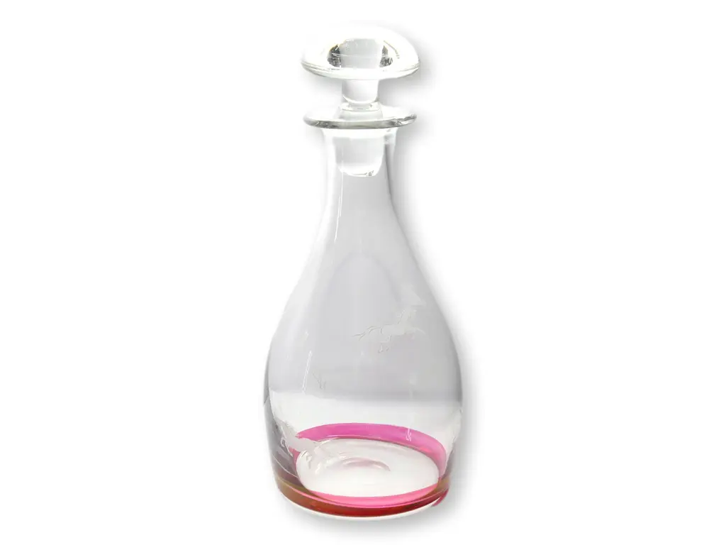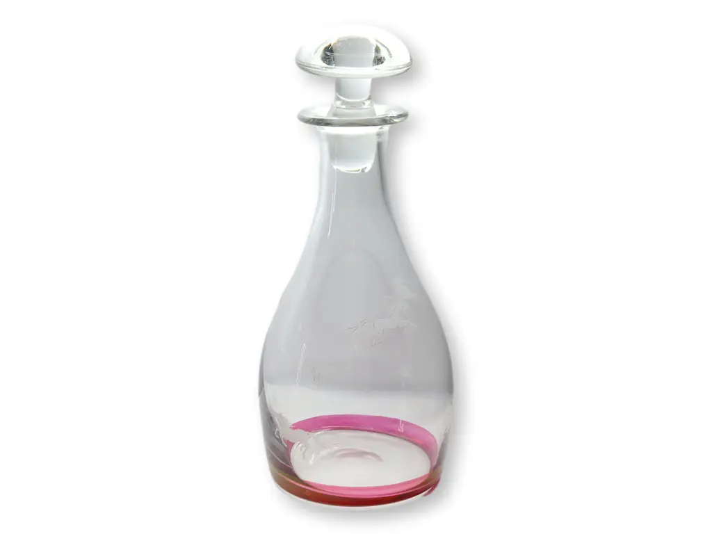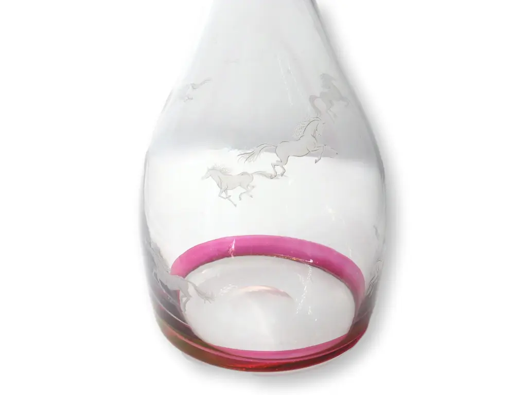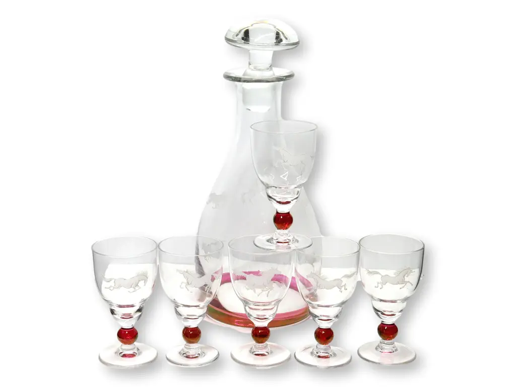 Embrace classic elegance with this Bohemian crystal clear and cranberry decanter set, featuring six glasses adorned with a small galloping horse design. The rich cranberry color complements the crystalline clarity, while the delicate horse motif adds a whimsical touch. Ideal for special gatherings or as a standout display piece, this set marries artistry and sophistication. Dimension: decanter, 4.25"Dia x 9.5"H; 6 glasses, 2"Dia x 3.5"H.