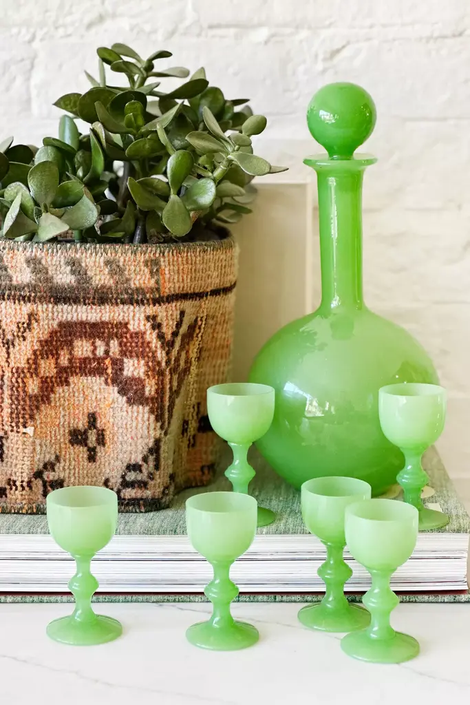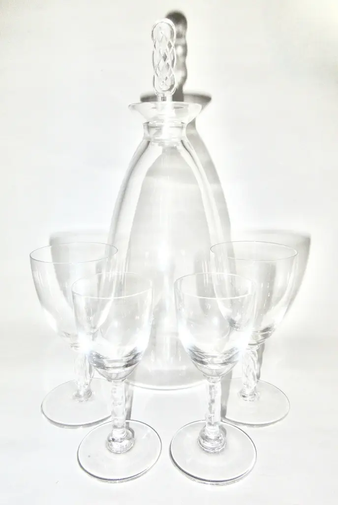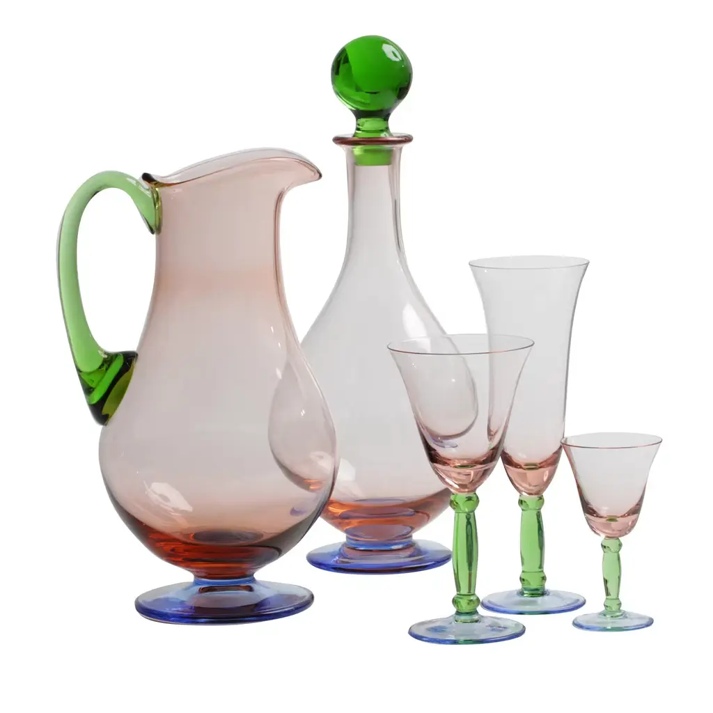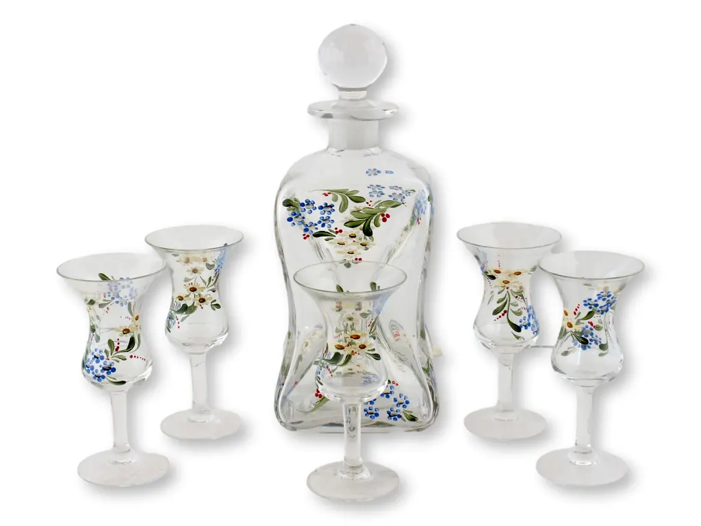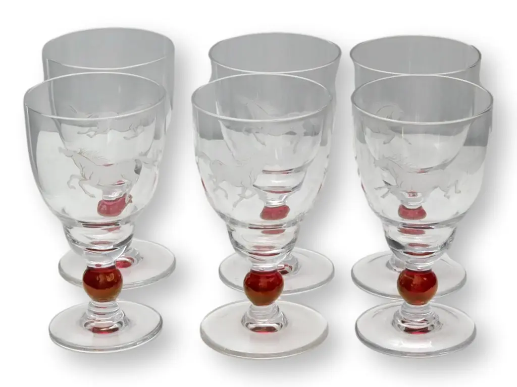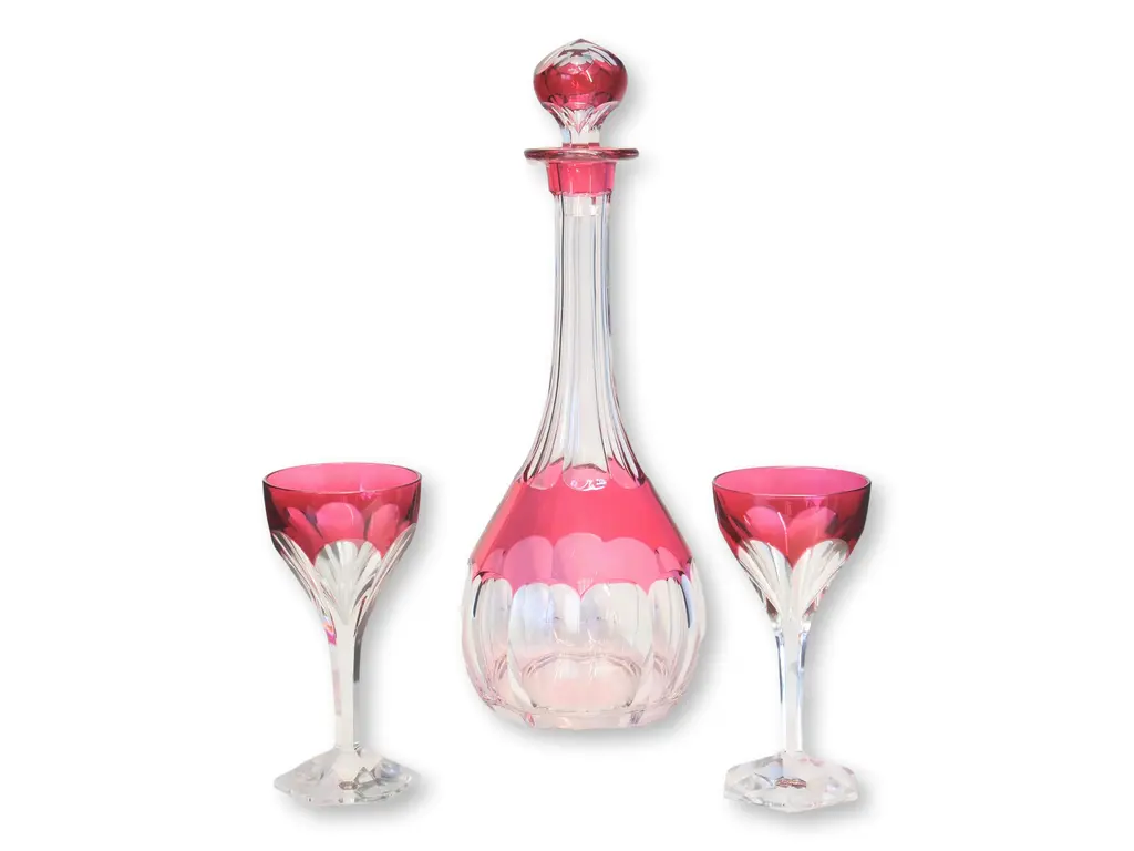 Embrace classic elegance with this Bohemian crystal clear and cranberry decanter set, featuring six glasses adorned with a small galloping horse design. The rich cranberry color complements the crystalline clarity, while the delicate horse motif adds a whimsical touch. Ideal for special gatherings or as a standout display piece, this set marries artistry and sophistication. Dimension: decanter, 4.25"Dia x 9.5"H; 6 glasses, 2"Dia x 3.5"H.