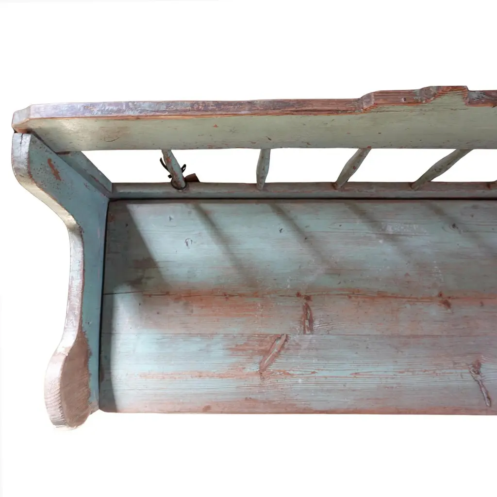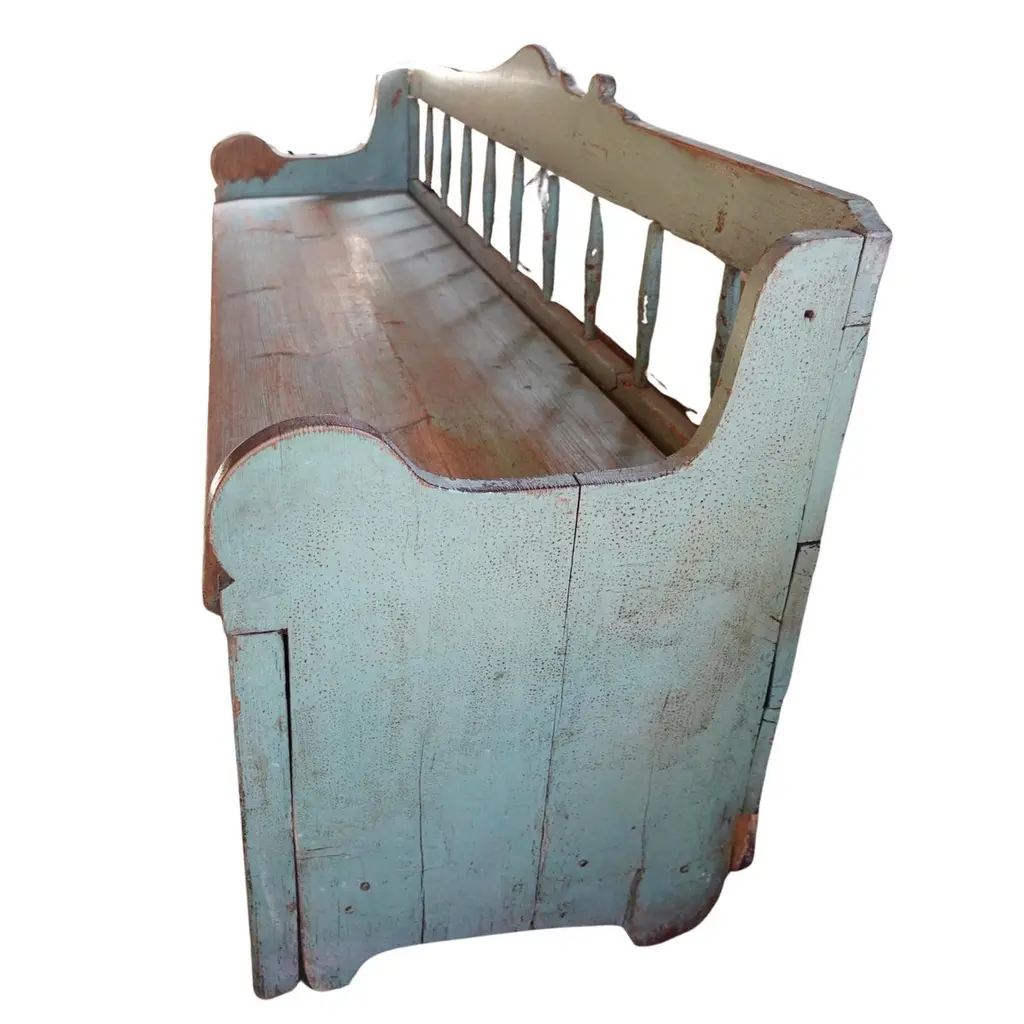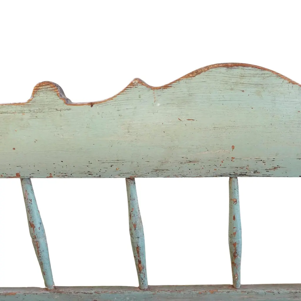 Antique early 19th century Swedish Farmhouse Folk Art BenchAnonymousSweden; ca. 1800Polychrome Pinewood Approximate size: 34 (h) x 70.5 (w) x 20 (d) in.; seat height: 18.5 in.This charming, early 19th-century Swedish farmhouse bench showcases a simple yet elegant Scandinavian folk aesthetic. Painted in a light, polychrome blue-green, the bench is crafted entirely from solid wood. Its timeworn patina reveals the beautiful wood grain, enhancing its authentic character. The design features a rectangular seat, flanked by scalloped arms and a backrest supported by intricately turned spindles characteristic of traditional Swedish or Nordic furniture. The bench's weathered finish, muted tones, and minimalist silhouette make it a versatile addition to spaces like entryways or mudrooms.Condition commensurate with age, inclusive of small paint losses, minor craquelure, rubbing, nicks, hairline cracks and minor scratches due to wear and use. Overall stable and solid.