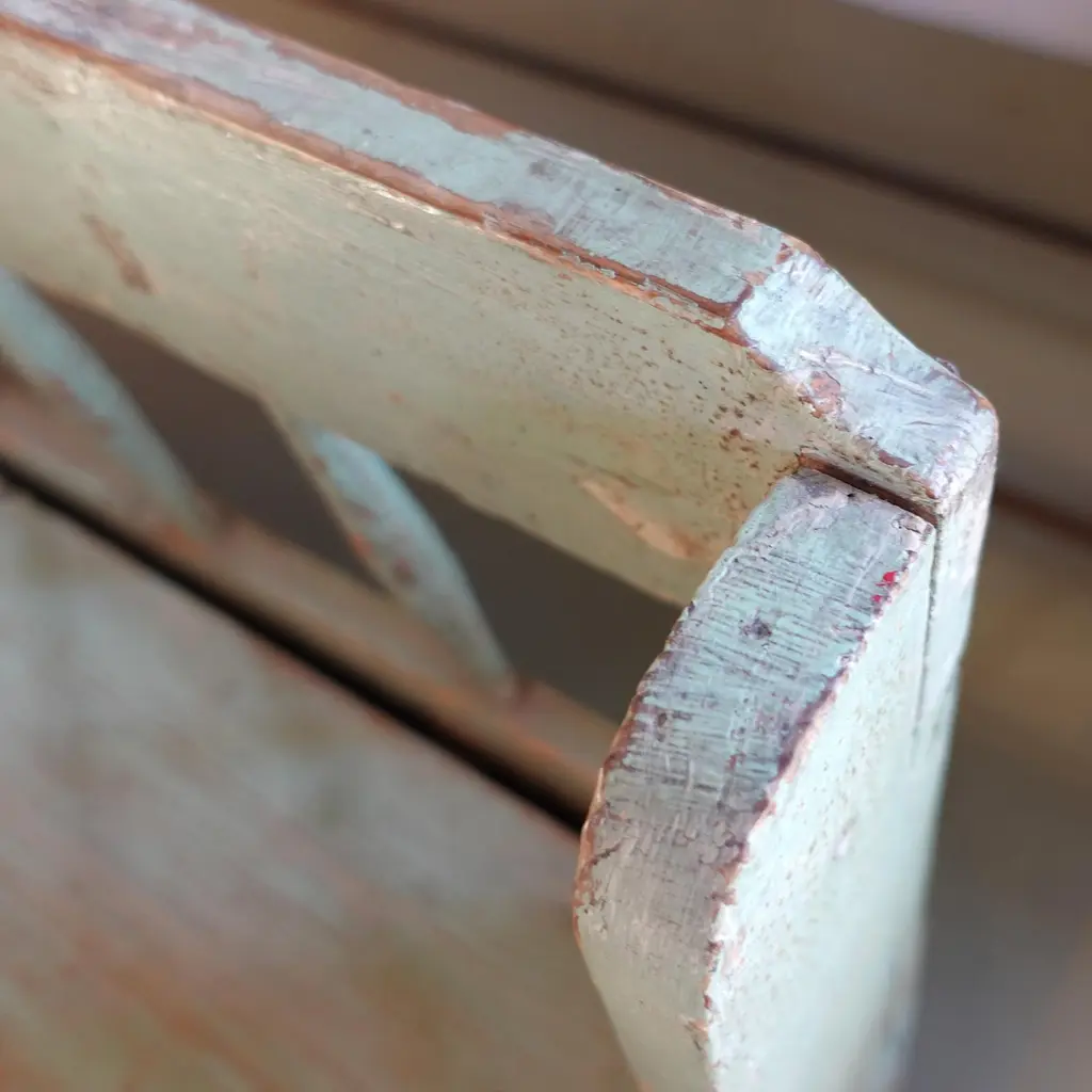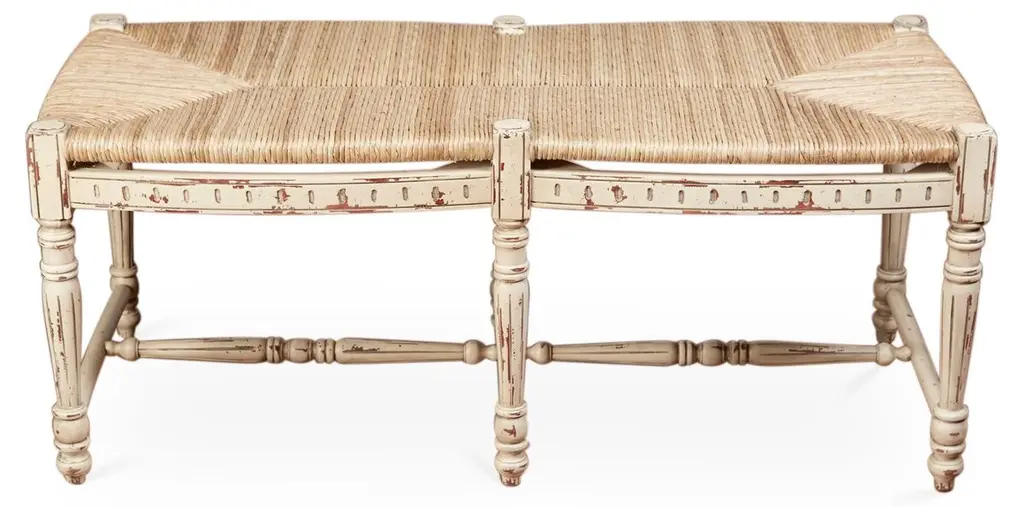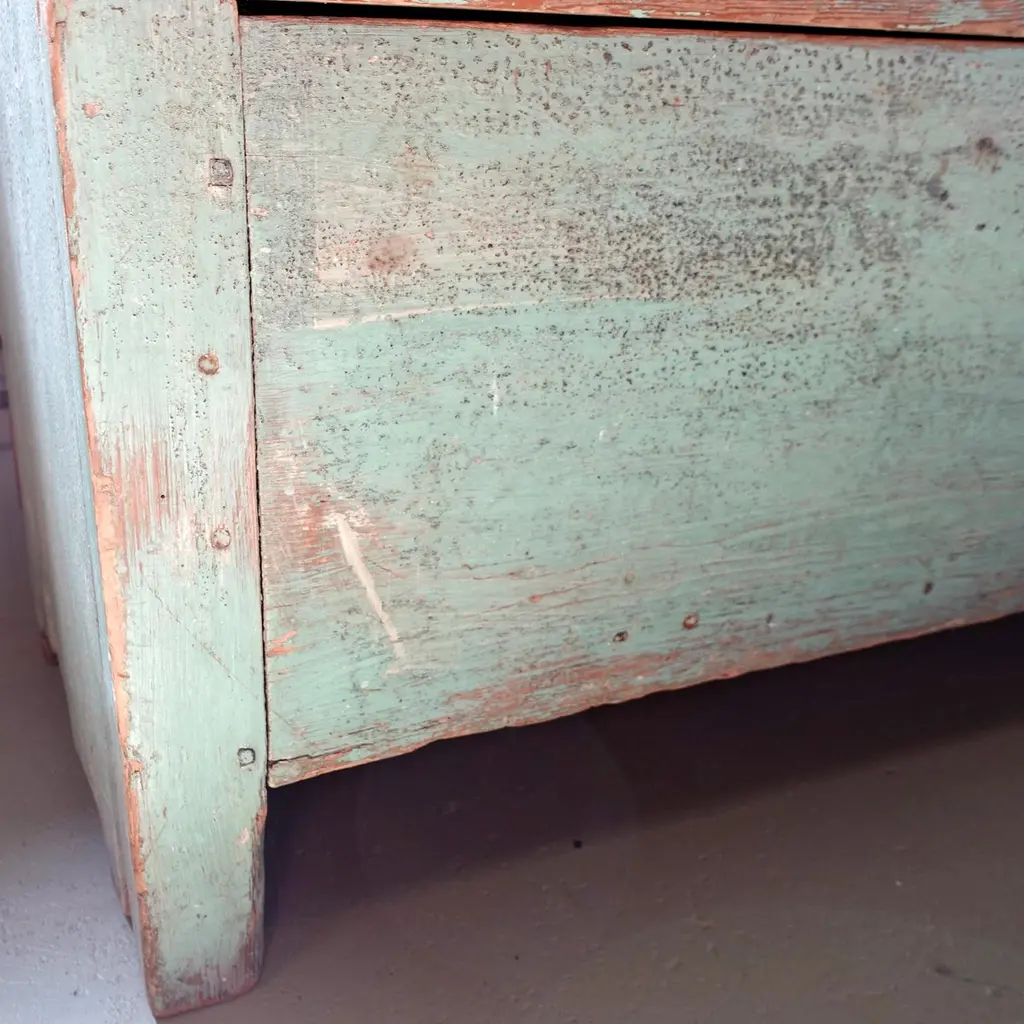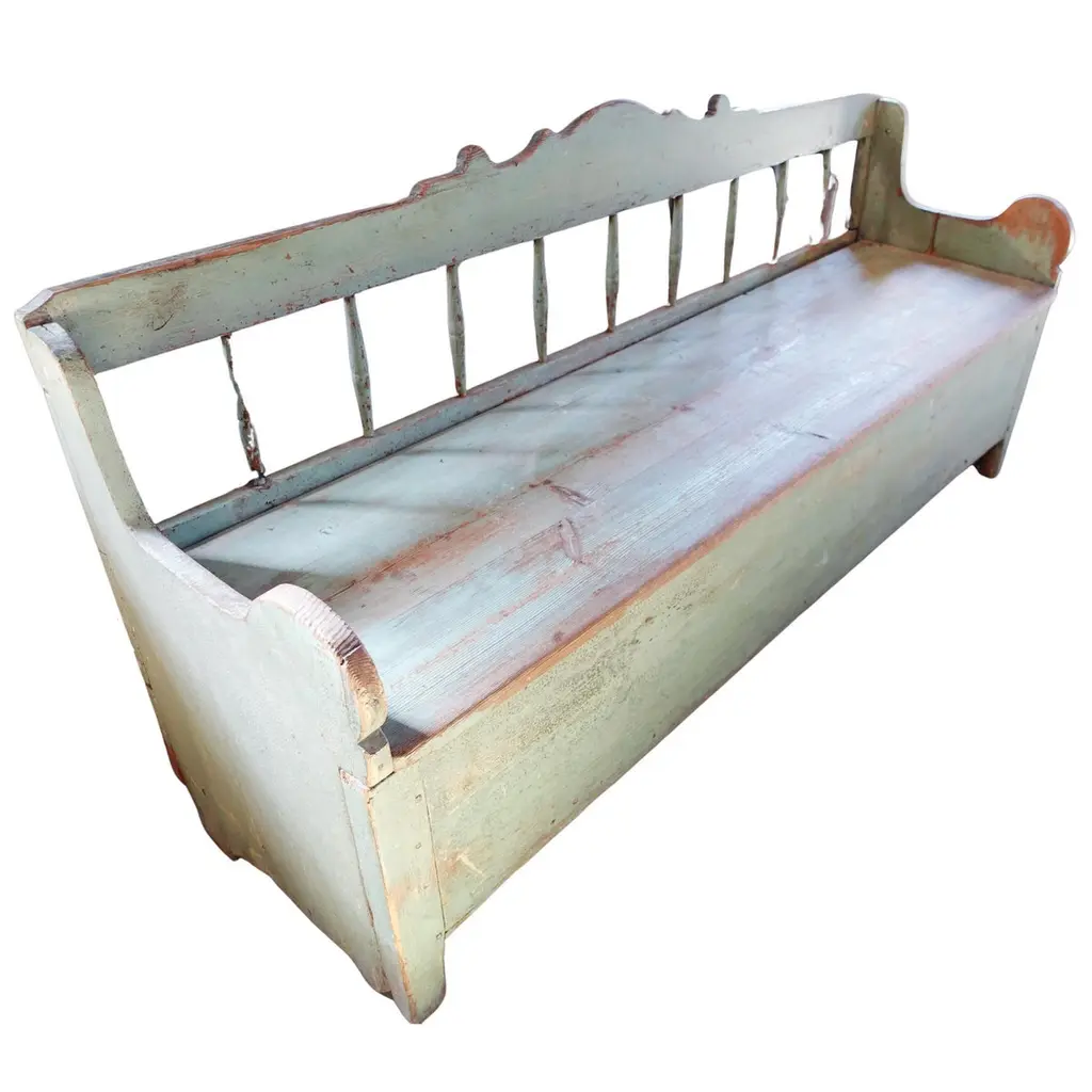 Antique early 19th century Swedish Farmhouse Folk Art BenchAnonymousSweden; ca. 1800Polychrome Pinewood Approximate size: 34 (h) x 70.5 (w) x 20 (d) in.; seat height: 18.5 in.This charming, early 19th-century Swedish farmhouse bench showcases a simple yet elegant Scandinavian folk aesthetic. Painted in a light, polychrome blue-green, the bench is crafted entirely from solid wood. Its timeworn patina reveals the beautiful wood grain, enhancing its authentic character. The design features a rectangular seat, flanked by scalloped arms and a backrest supported by intricately turned spindles characteristic of traditional Swedish or Nordic furniture. The bench's weathered finish, muted tones, and minimalist silhouette make it a versatile addition to spaces like entryways or mudrooms.Condition commensurate with age, inclusive of small paint losses, minor craquelure, rubbing, nicks, hairline cracks and minor scratches due to wear and use. Overall stable and solid.