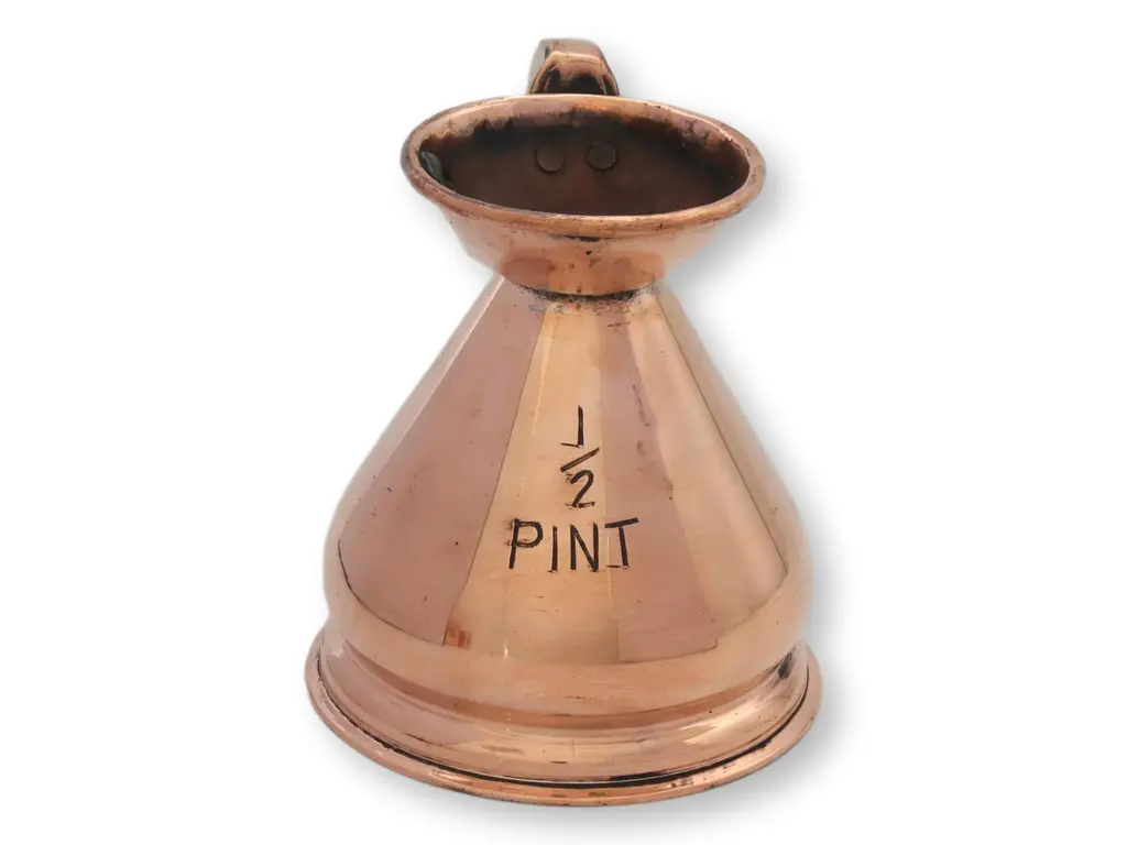 Rare-size antique English copper half-pint jug, a testament to traditional pub culture. Features original age patina, with '1/2 PINT' stamp, authenticating its use and capacity. Ideal for collectors or as a distinctive decorative piece. Not intended for culinary use, unless professionally retinned.