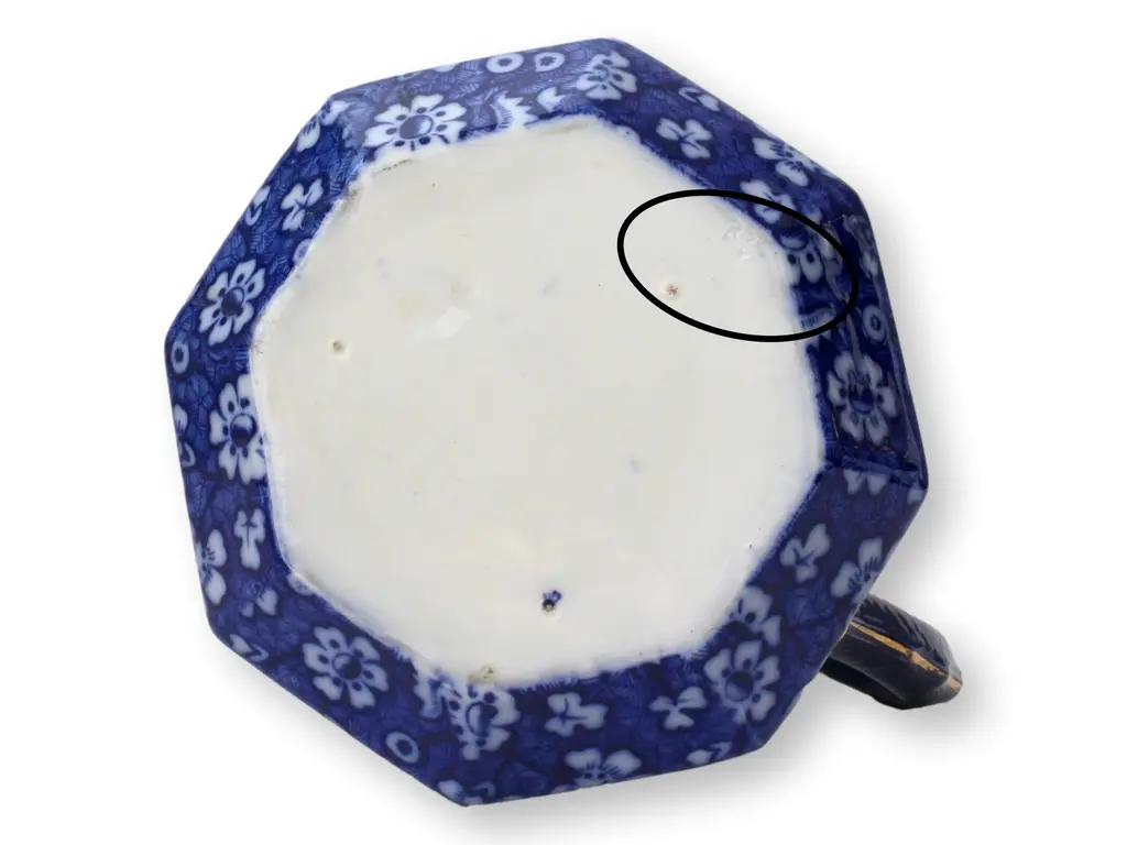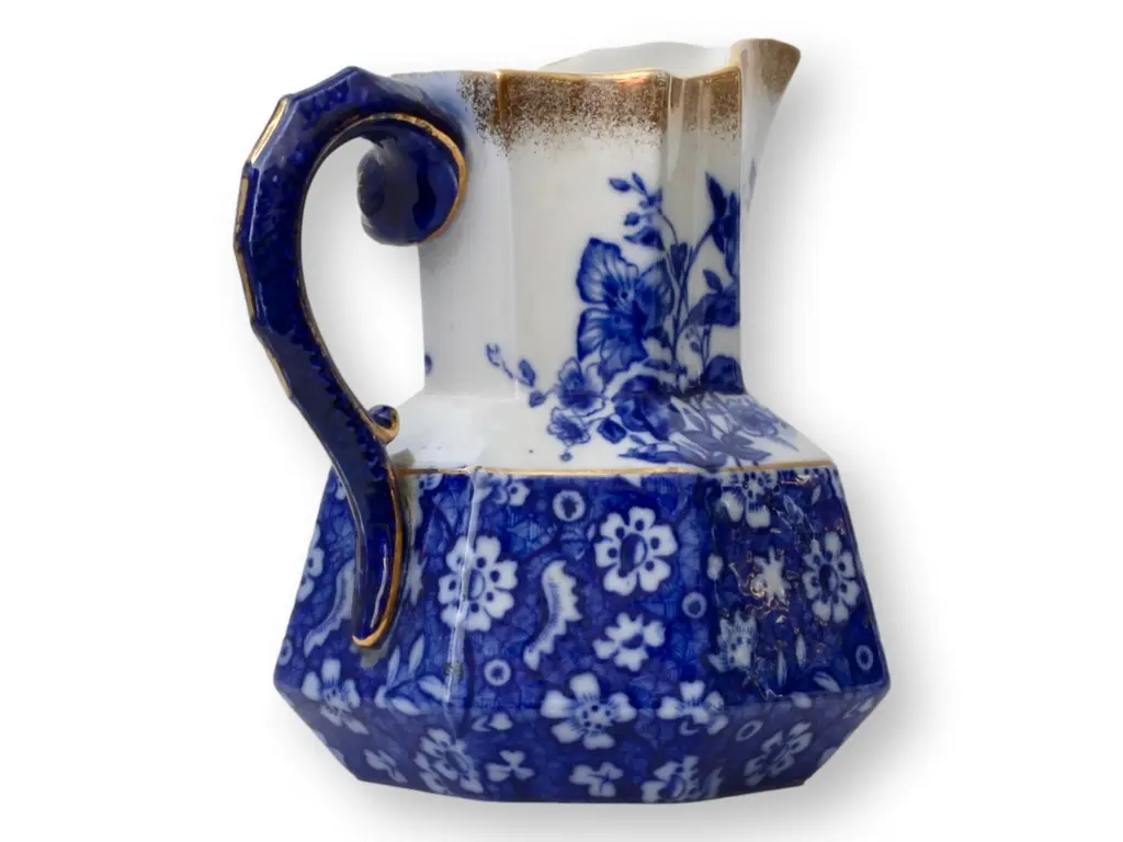 Antique English flow blue ironstone water pitcher with a striking octagonal base and rich cobalt transfer in a floral and butterfly motif. Likely mid-to-late 19th century, this piece features delicate gilded details and a graceful paneled form. Flow blue was especially popular during the Victorian era for its dreamy, blurred aesthetic. Beautiful on a vanity, table, or as a small vase. Small impressed factory number mark.