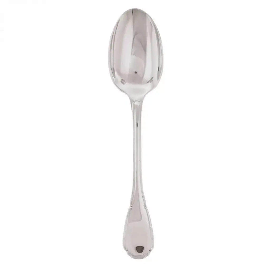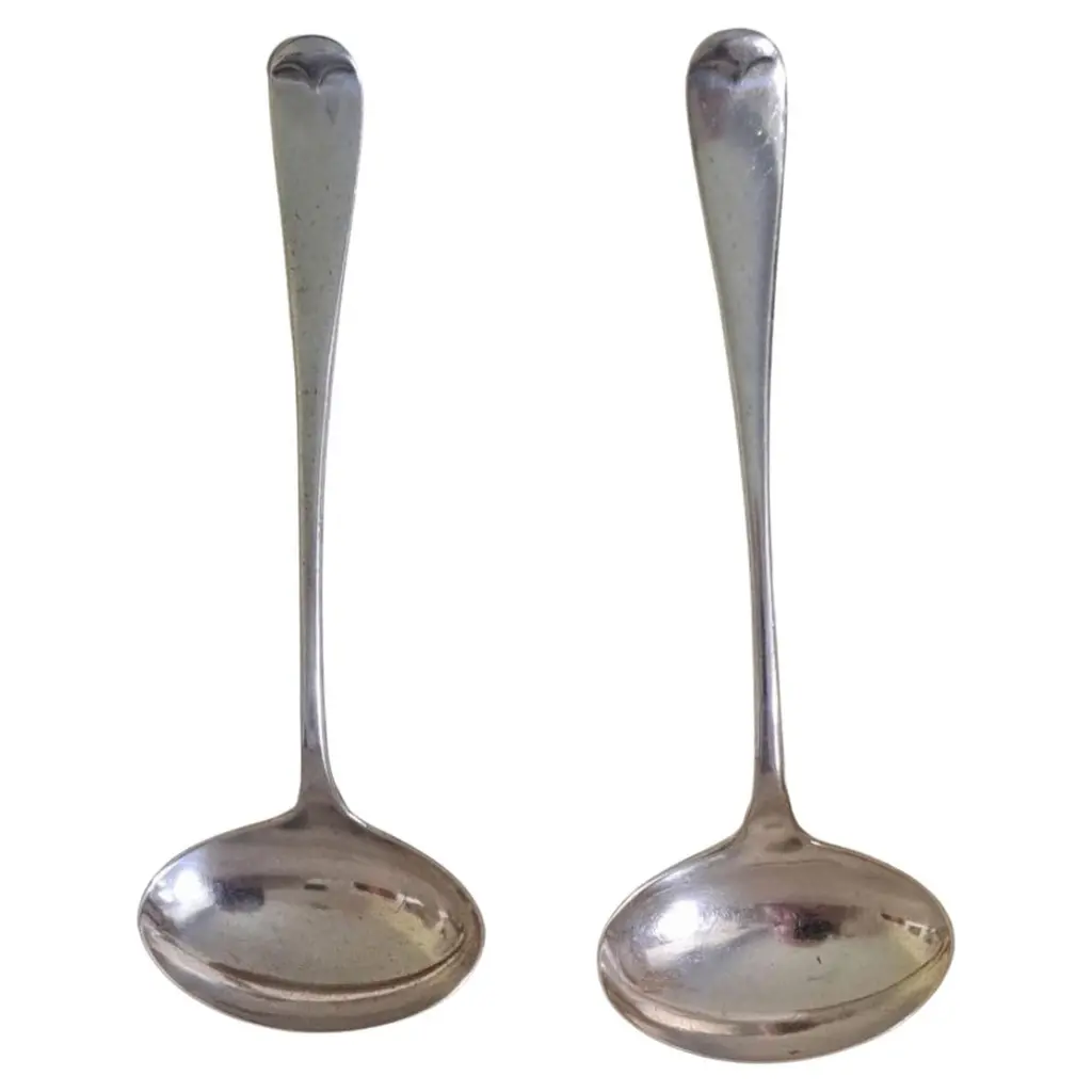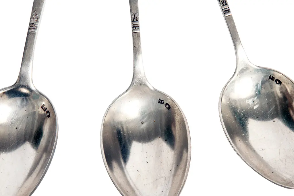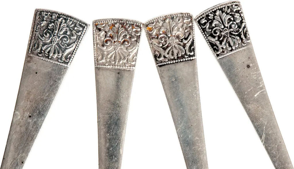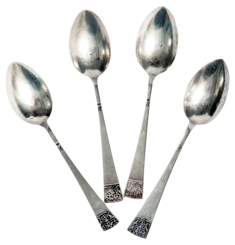 Set of four antique silver-plate soup spoons with motif on both sides. European mark on the bowl of the spoon.