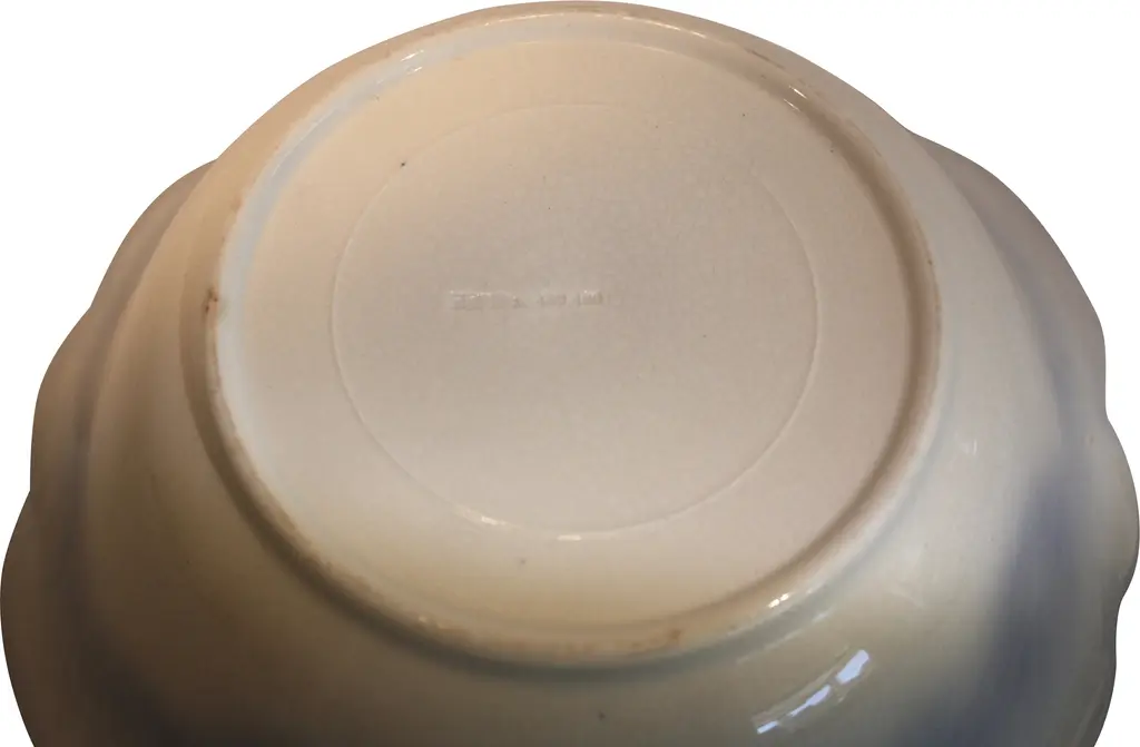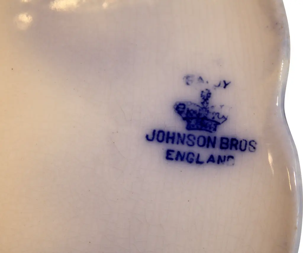 Antique English flow blue porcelain serving bowl with striking blue details on bright white base. Marked "Johnson Bros England" on the underside along with the RD number. Light age crazing.