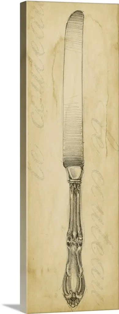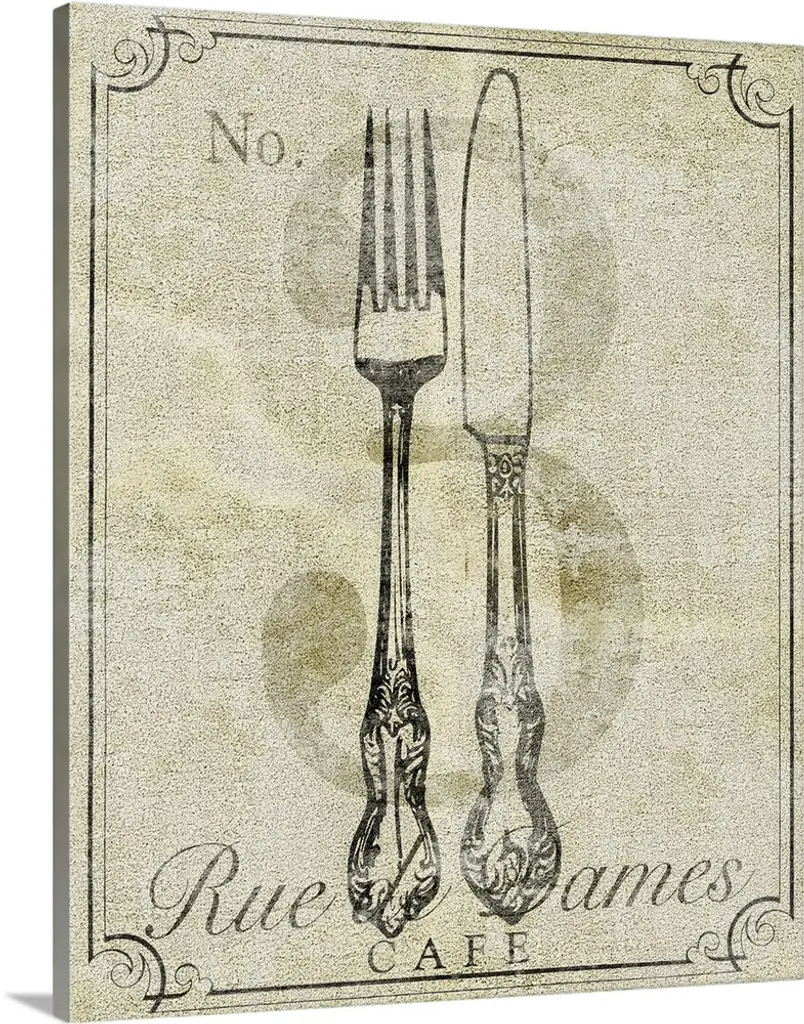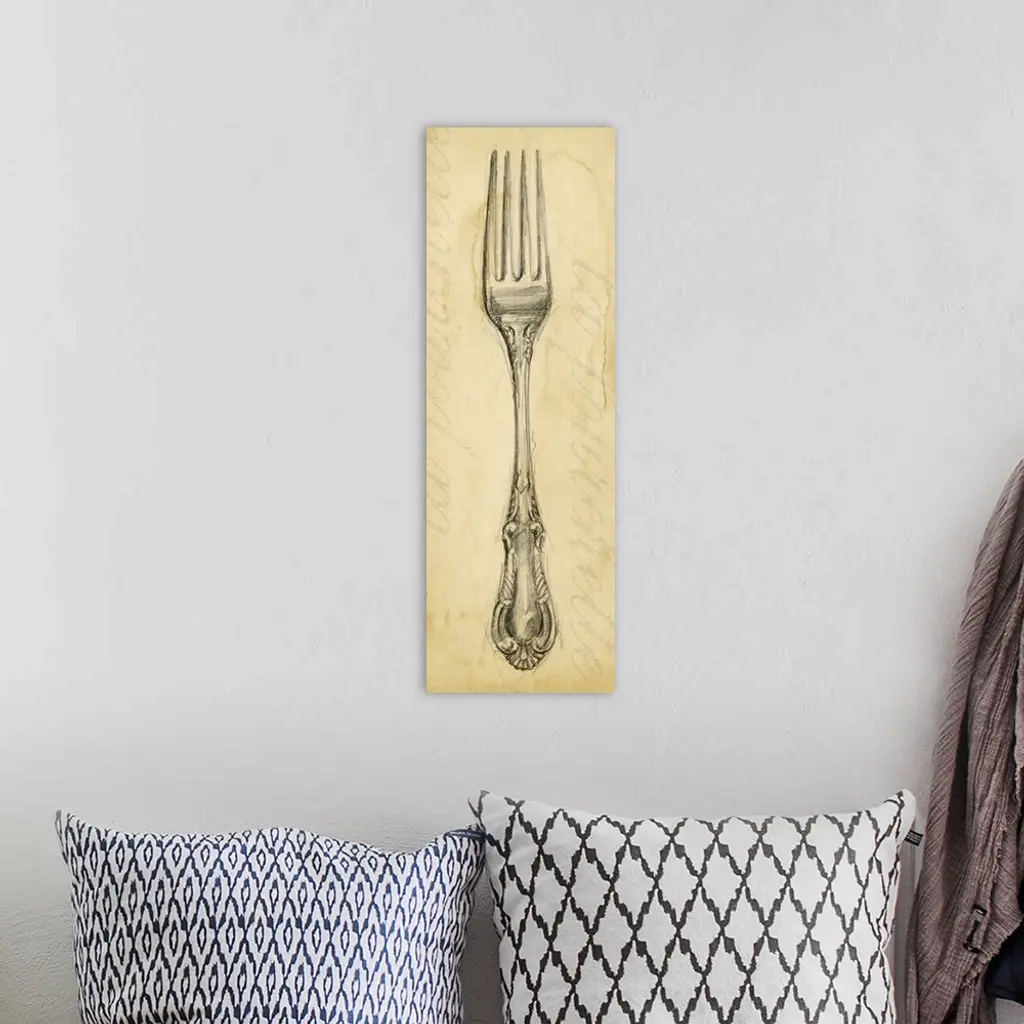 Long and narrow canvas with a drawing of a fork on top of an antiqued backdrop.