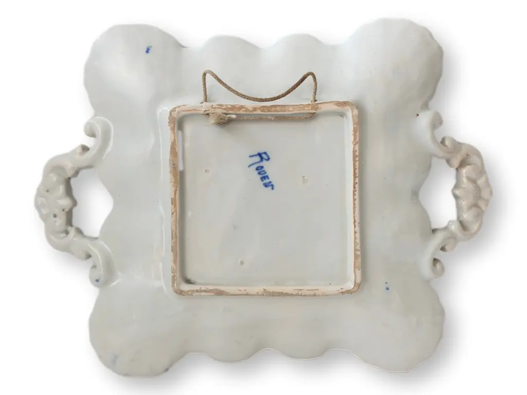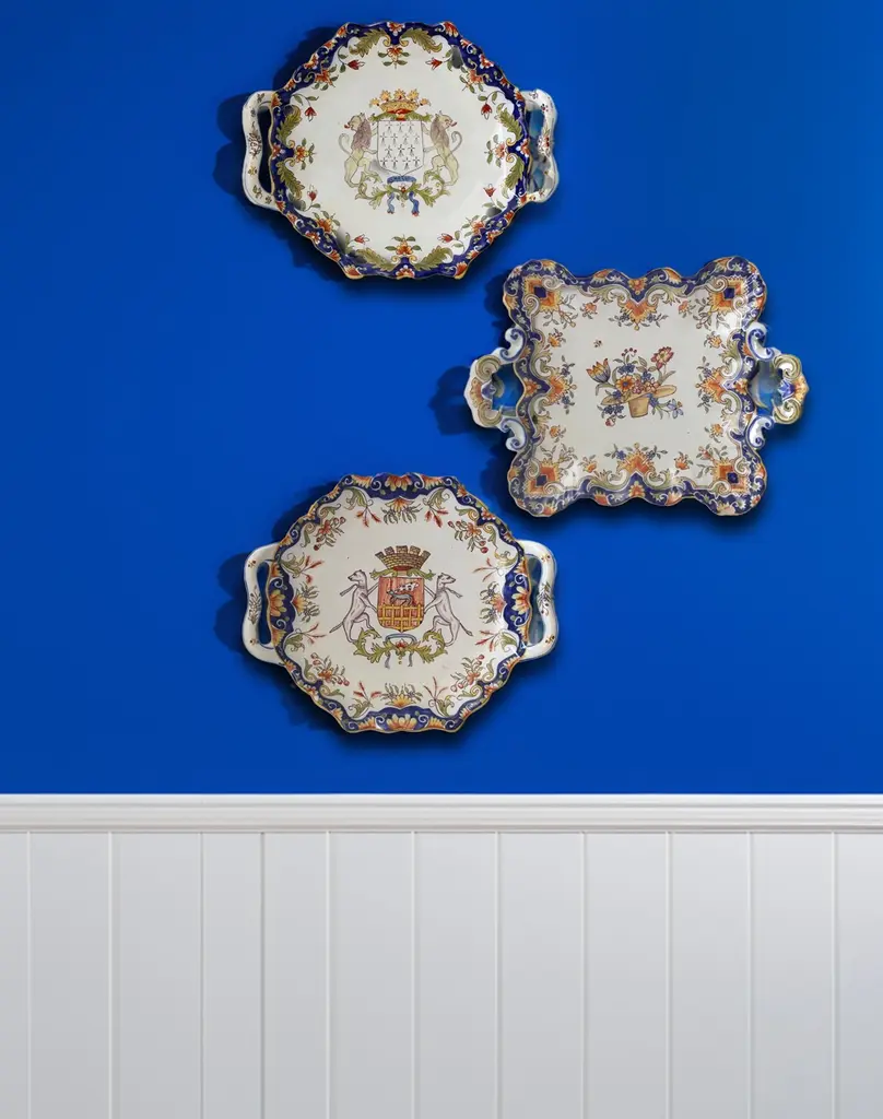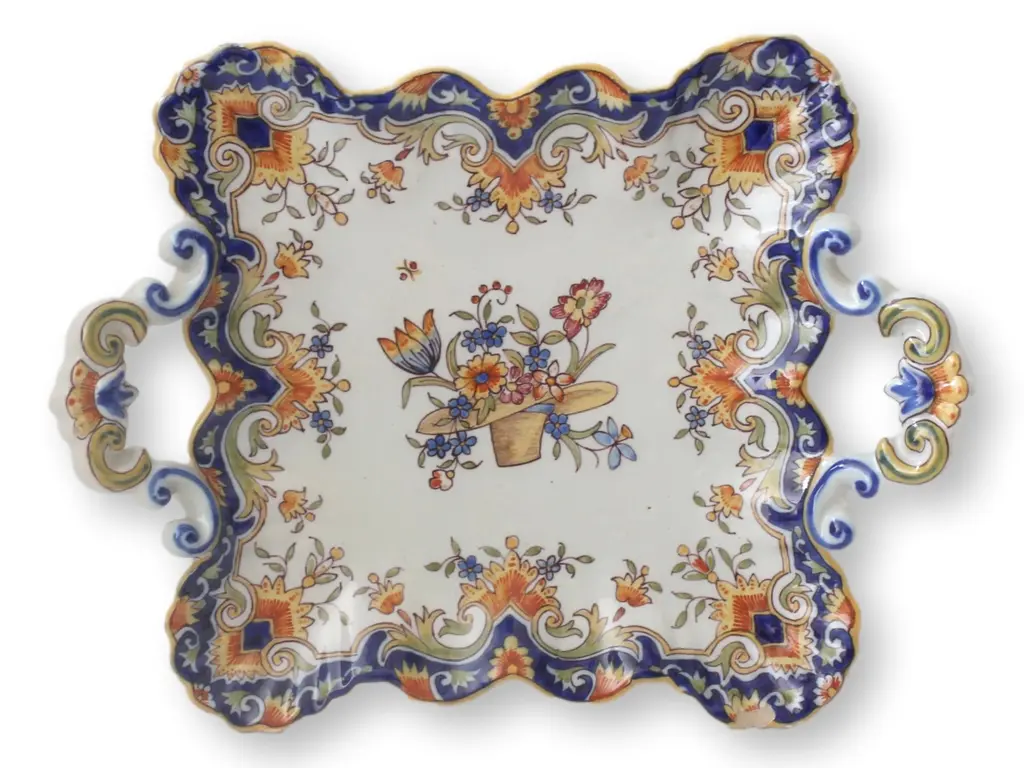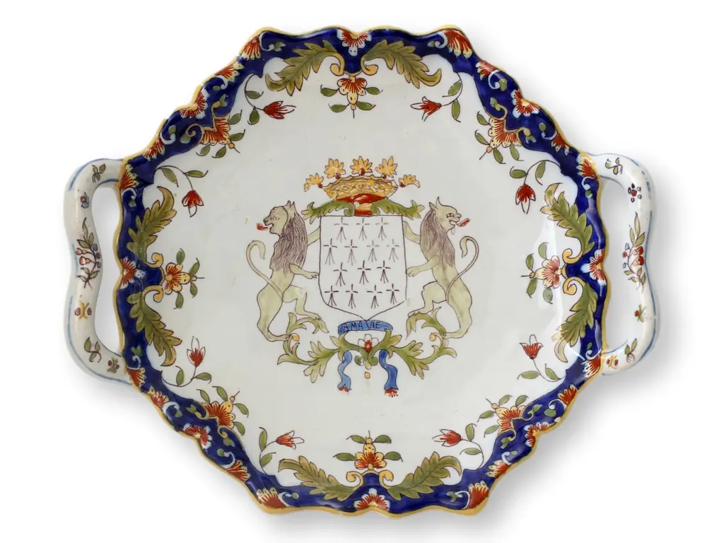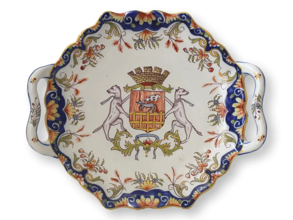 This stunning collection of antique French faience trays, From Fourmaintraux Fr��res faienceries, showcases exquisite hand-painted designs. Each tray features ornate patterns, vibrant colors, and charming heraldic or floral motifs. Versatile and elegant, these trays can be displayed as wall art or used for serving, making them a perfect addition to both decorative and functional settings. Dimensions: round plates, 10" x 8.25" x 1.75": rectangular plate, 11" x 11" x 1.75"