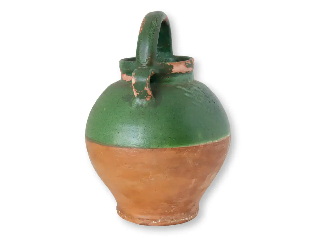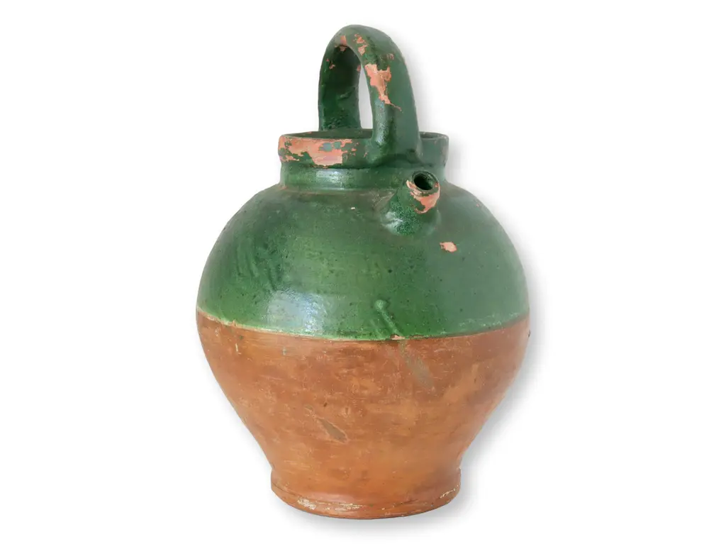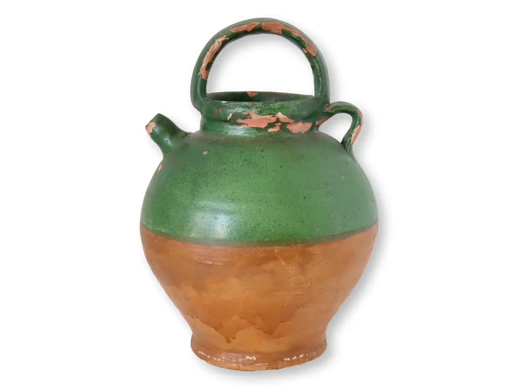 Antique French terra cotta water jug. Thick terra cotta clay keeps water cool in warm weather. This is typical of jugs traditionally used by orchard workers in France, the spout is used to drink from. Great coloring with the green color glaze that is much sought after by collectors. No maker's mark.