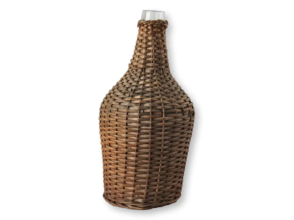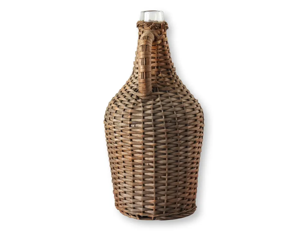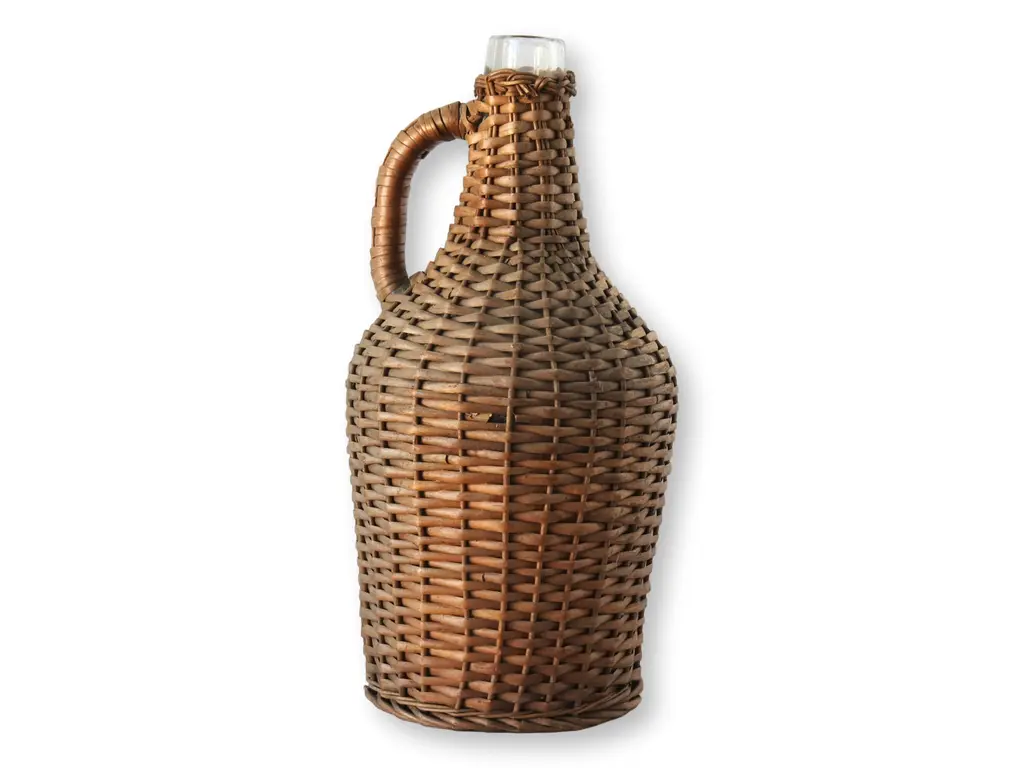 This antique French wicker-covered demijohn bottle is a rustic yet elegant piece from early 20th-century France. Originally used to store and transport wine or spirits, the glass bottle is encased in a tightly woven wicker exterior, adding durability and charm. The sturdy wicker handle enhances its functionality, while the bottle's timeless design makes it an ideal decor piece. Perfect for collectors or those seeking a touch of vintage French countryside style in their home.