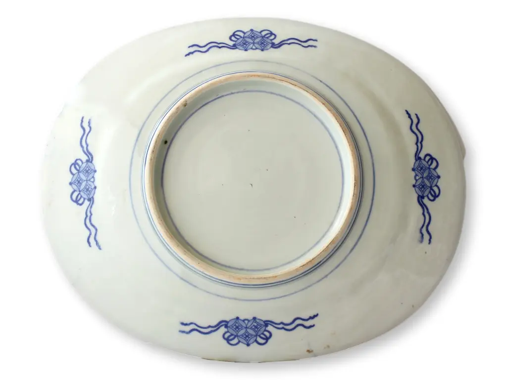 This exquisite antique Japanese celadon plate features a beautiful hand-painted floral motif, with vibrant blue flowers delicately arranged in a basket. The plate's celadon glaze creates a soft greenish hue, enhancing the intricate blue and white design. The reverse side is adorned with traditional Japanese motifs, adding to its decorative appeal. This plate is a stunning example of Imari craftsmanship, perfect for collectors or as a striking display piece in any home.