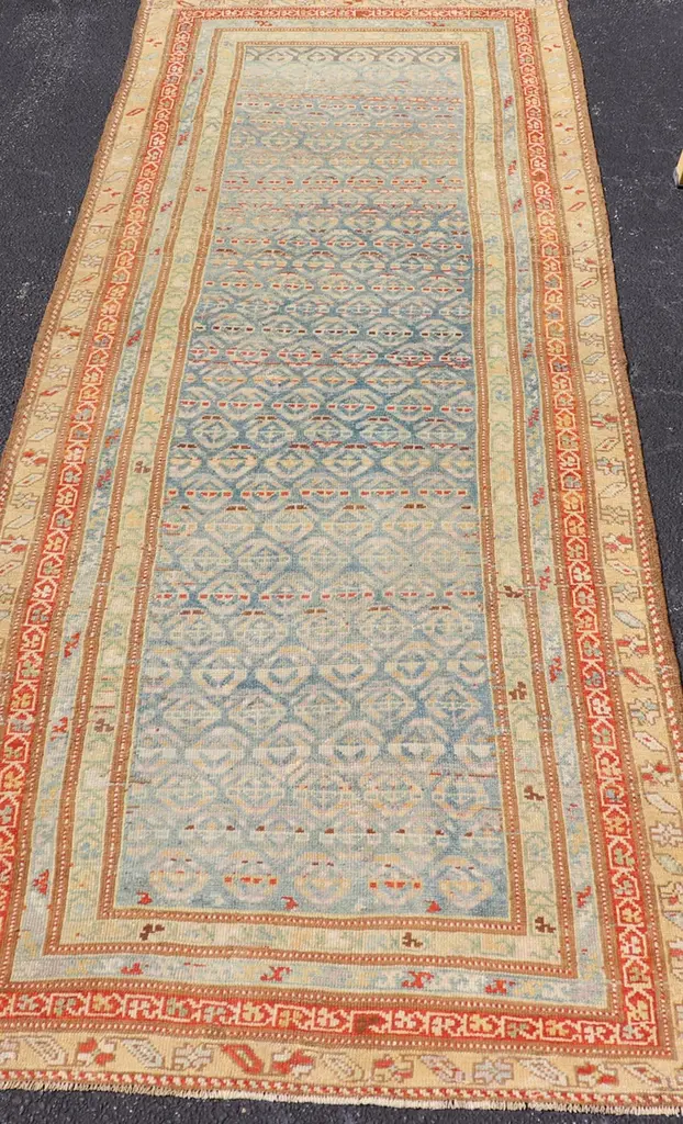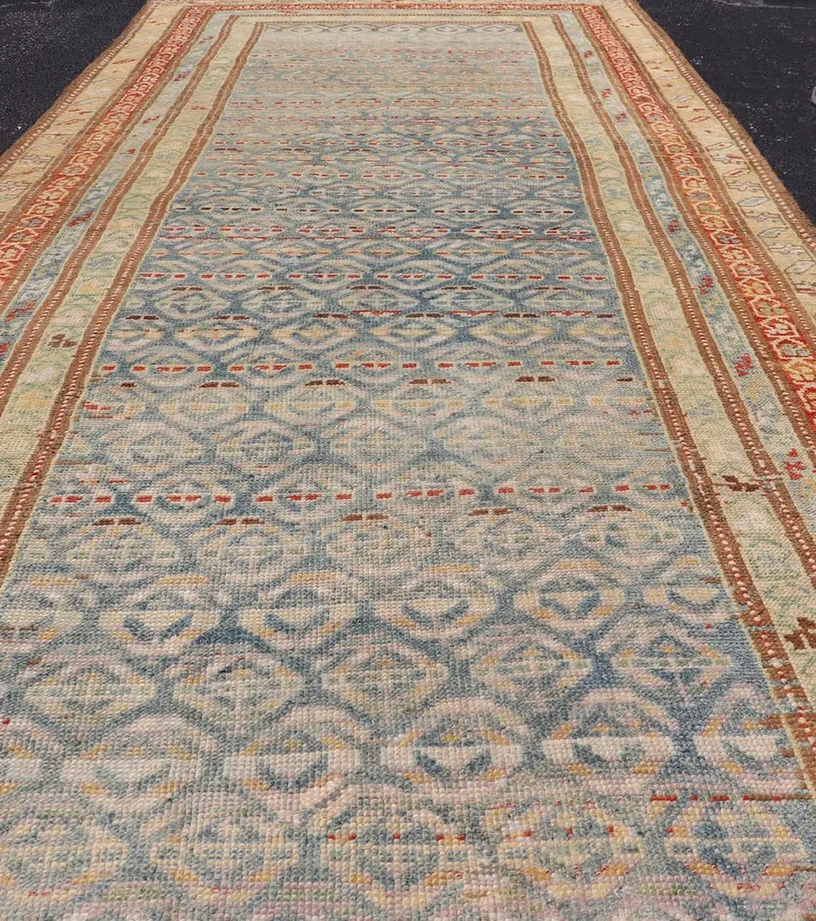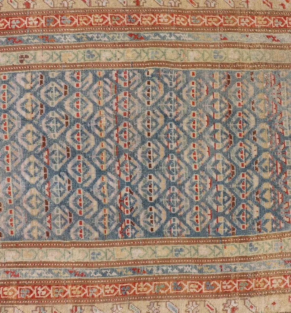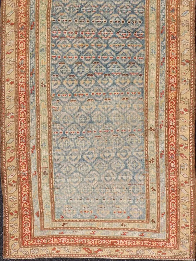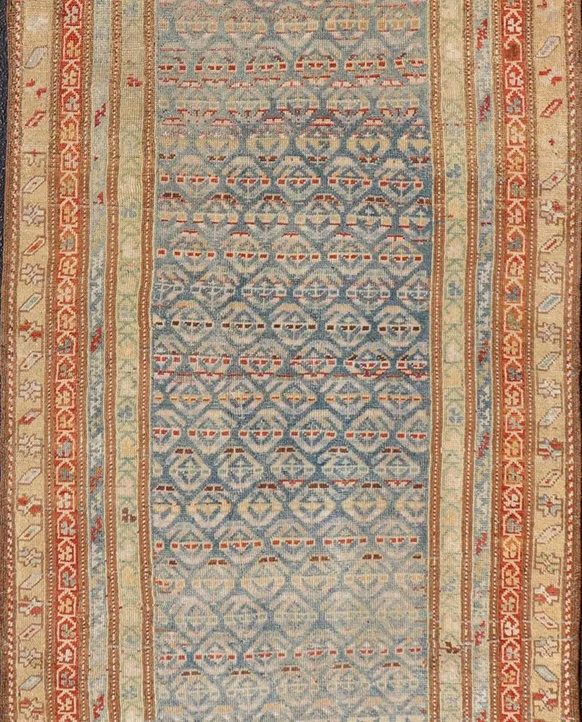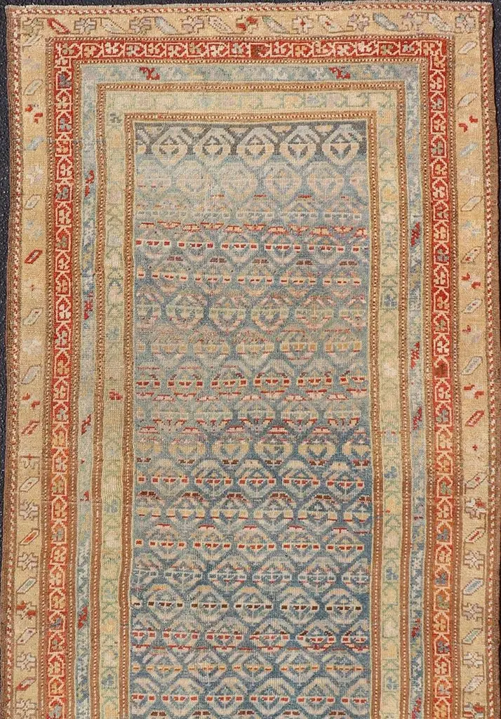 Measures: 3'6"X10'0" Antique Kurdish Runner With Geometric Motifs and Soft Color Palette 3'6"x10'0". Antique Kurdish Rug with Kurdish Design. Keivan Woven Arts/ Rug/ EN-15435, country of origin/type: Iran, circa 1900.This antique Kurdish runner features a captivating array of geometric motifs across its elongated field, reflecting the traditional artistry of Kurdish weavers. The harmonious blend of soft blues, pale beiges, and earthy reds creates a calming and inviting aesthetic. The field is adorned with repeating diamond-shaped patterns, symbolizing protection and unity, while subtle accents of light red add a gentle warmth to the design.The runner is framed by multiple borders, each intricately designed with small geometric shapes and stylized motifs, adding layers of detail to the overall composition. The craftsmanship in this handwoven piece showcases the durability and artistry for which Kurdish rugs are well known, using high-quality wool that ensures a soft and luxurious texture underfoot.