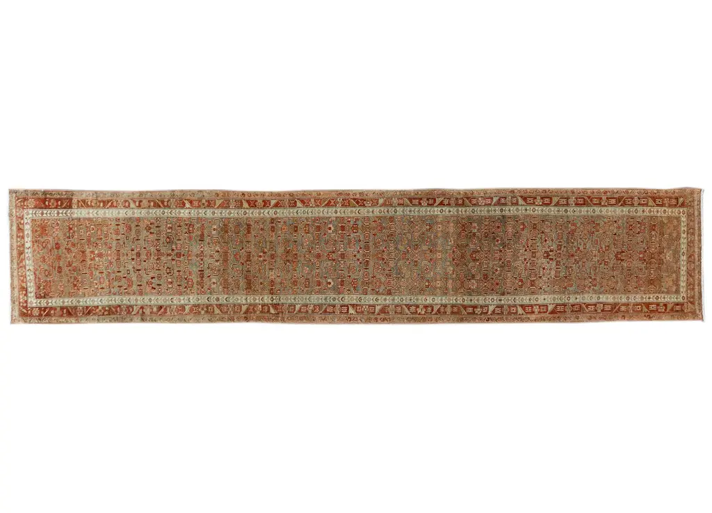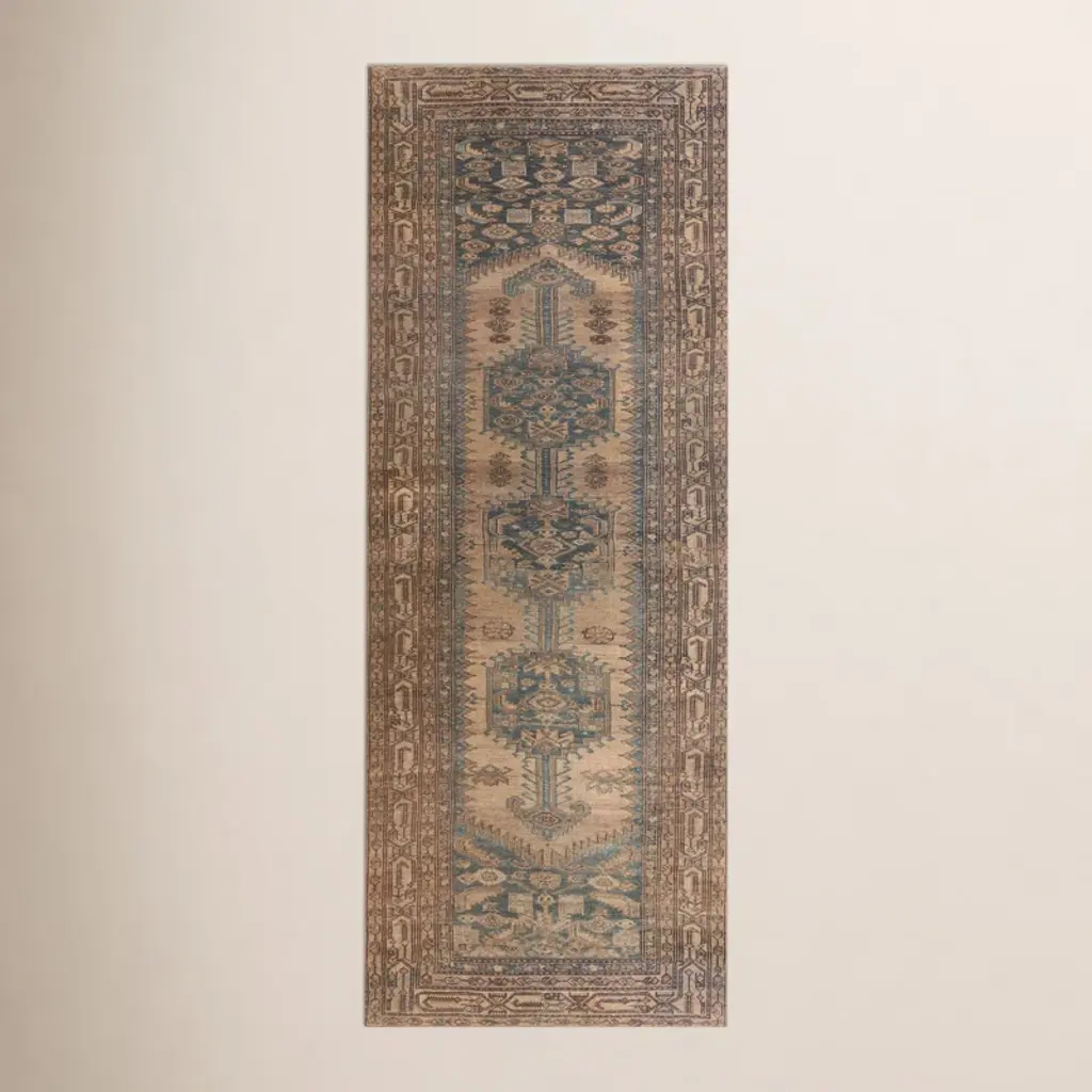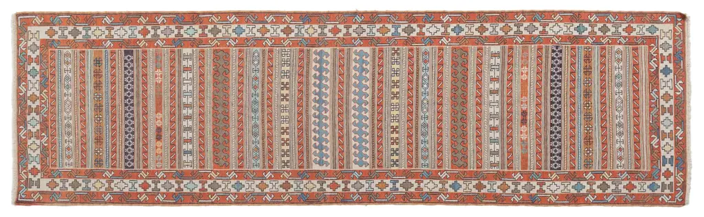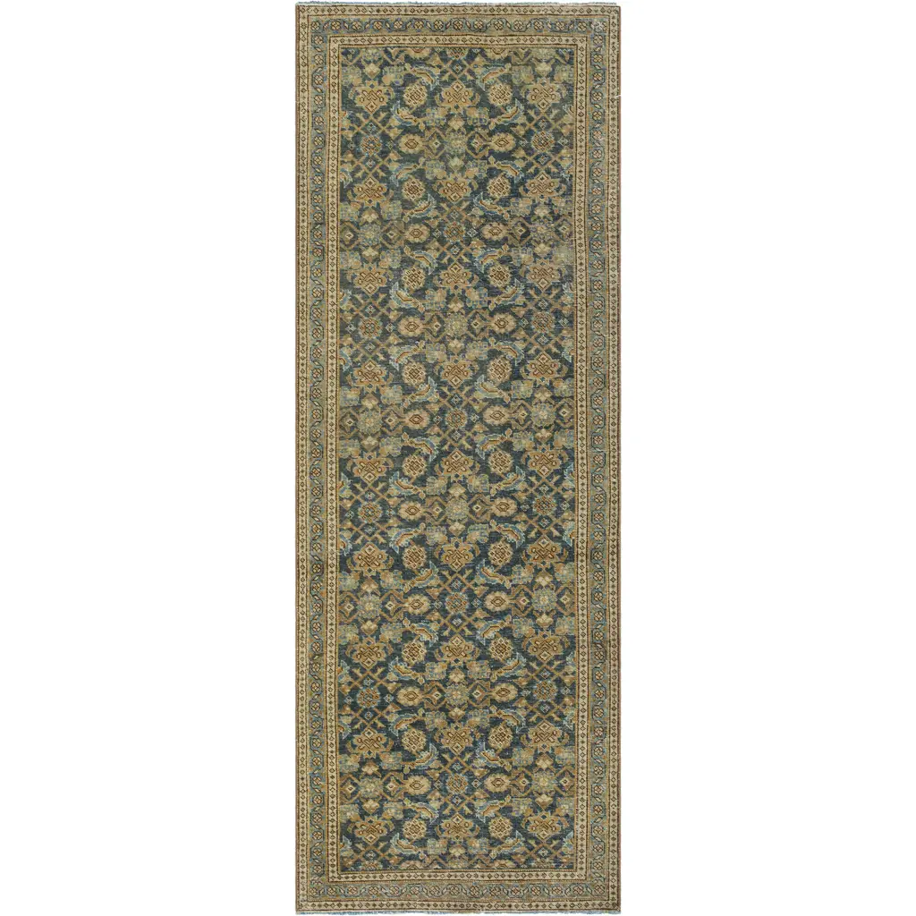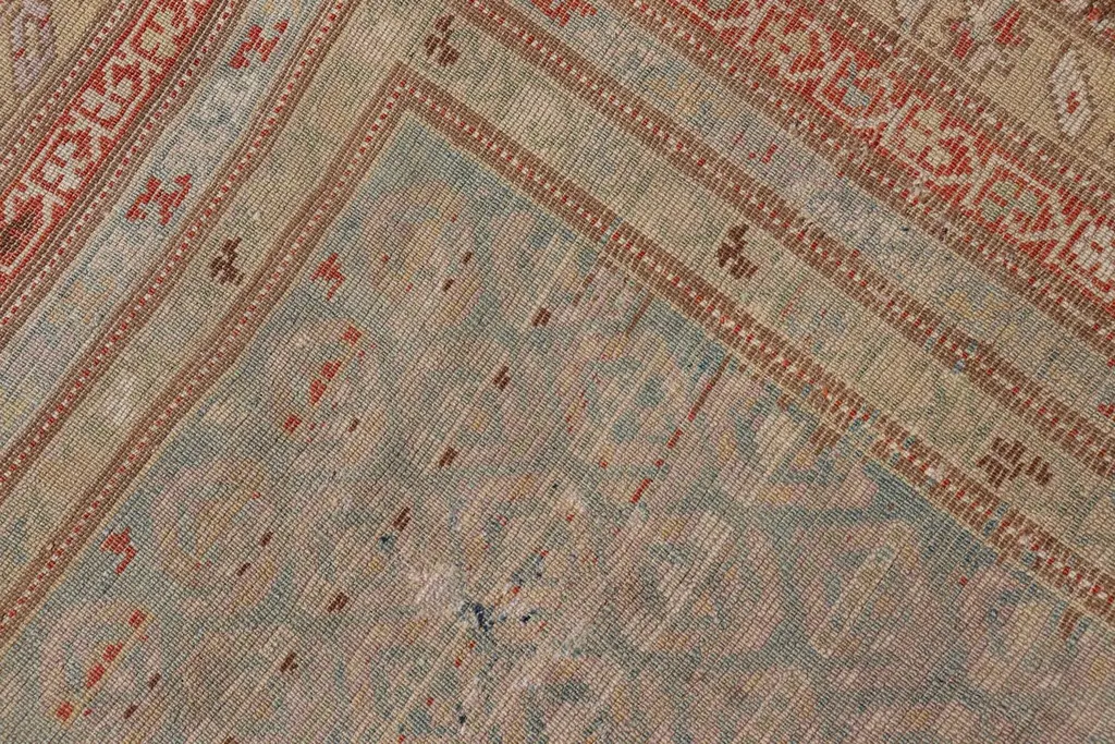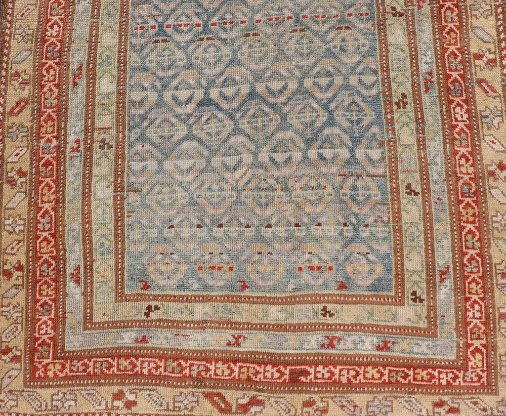 Measures: 3'6"X10'0" Antique Kurdish Runner With Geometric Motifs and Soft Color Palette 3'6"x10'0". Antique Kurdish Rug with Kurdish Design. Keivan Woven Arts/ Rug/ EN-15435, country of origin/type: Iran, circa 1900.This antique Kurdish runner features a captivating array of geometric motifs across its elongated field, reflecting the traditional artistry of Kurdish weavers. The harmonious blend of soft blues, pale beiges, and earthy reds creates a calming and inviting aesthetic. The field is adorned with repeating diamond-shaped patterns, symbolizing protection and unity, while subtle accents of light red add a gentle warmth to the design.The runner is framed by multiple borders, each intricately designed with small geometric shapes and stylized motifs, adding layers of detail to the overall composition. The craftsmanship in this handwoven piece showcases the durability and artistry for which Kurdish rugs are well known, using high-quality wool that ensures a soft and luxurious texture underfoot.