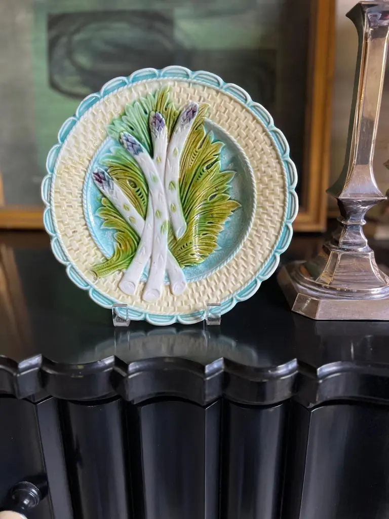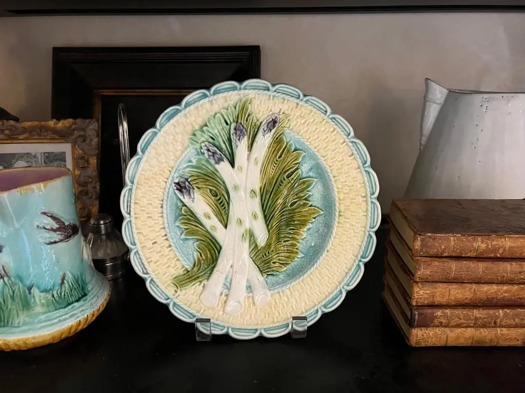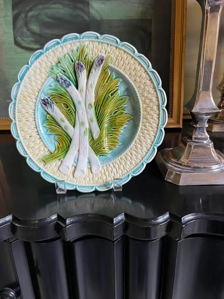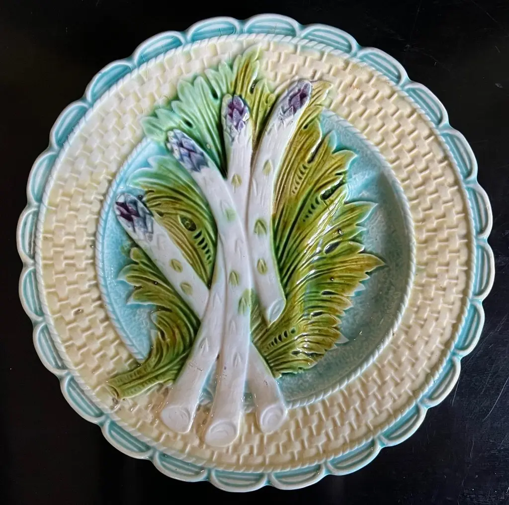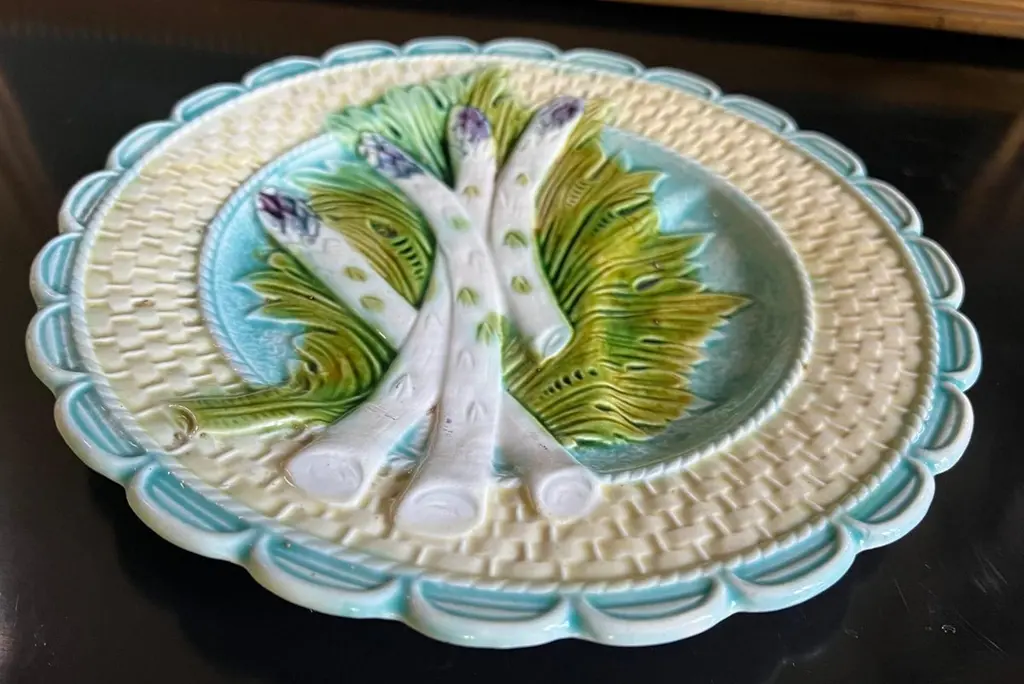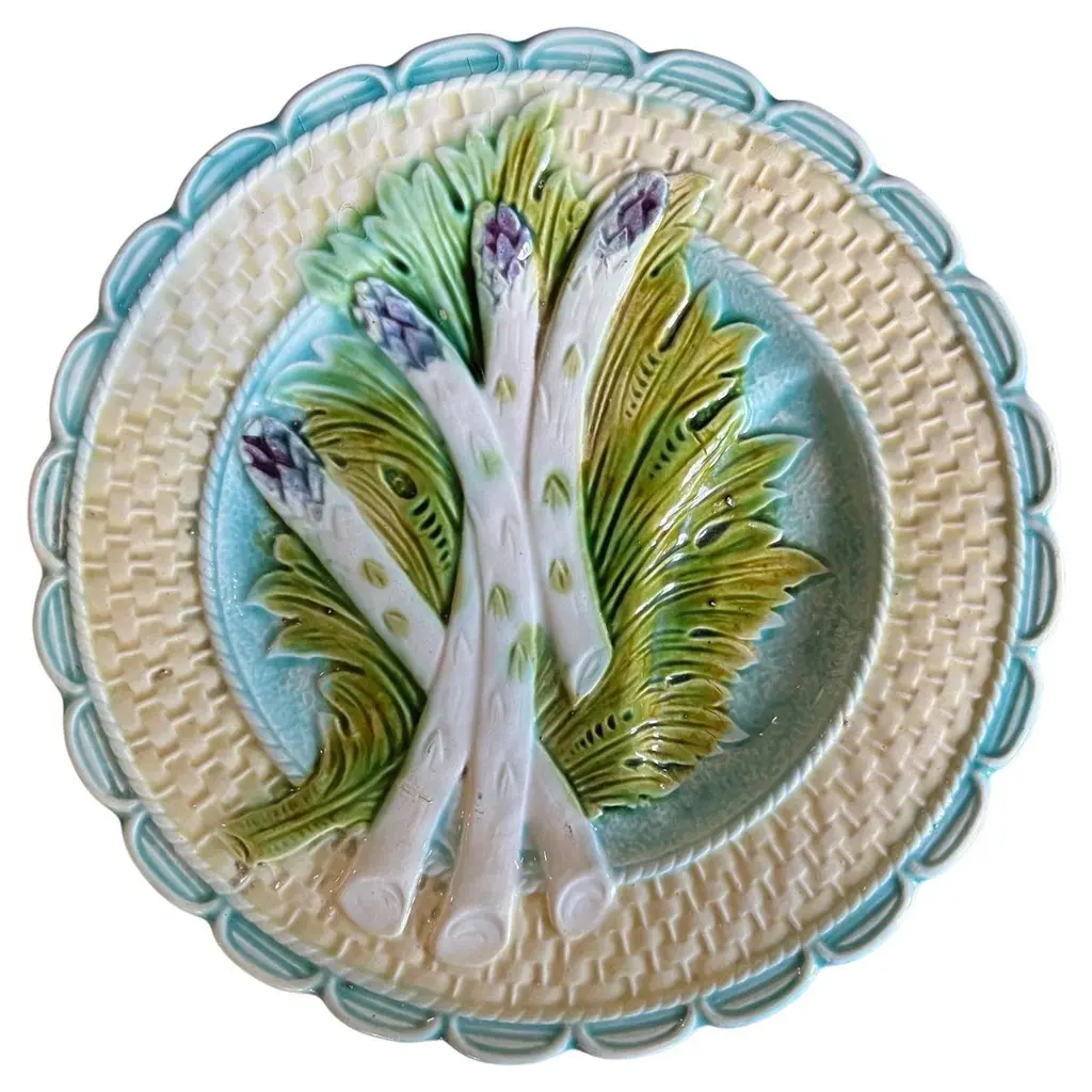 A French majolica asparagus plate from the Salins-les-Bains region of France, made in the late 19th century. The plate has four white asparagus with purple tips, laying on a bed of green leaves. The plate includes a sauce well and is numbered on the back by the painter.