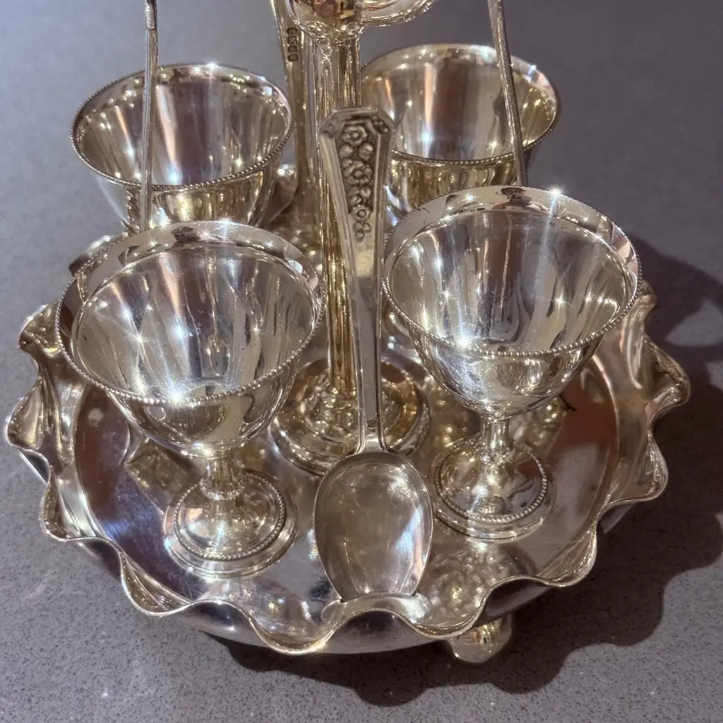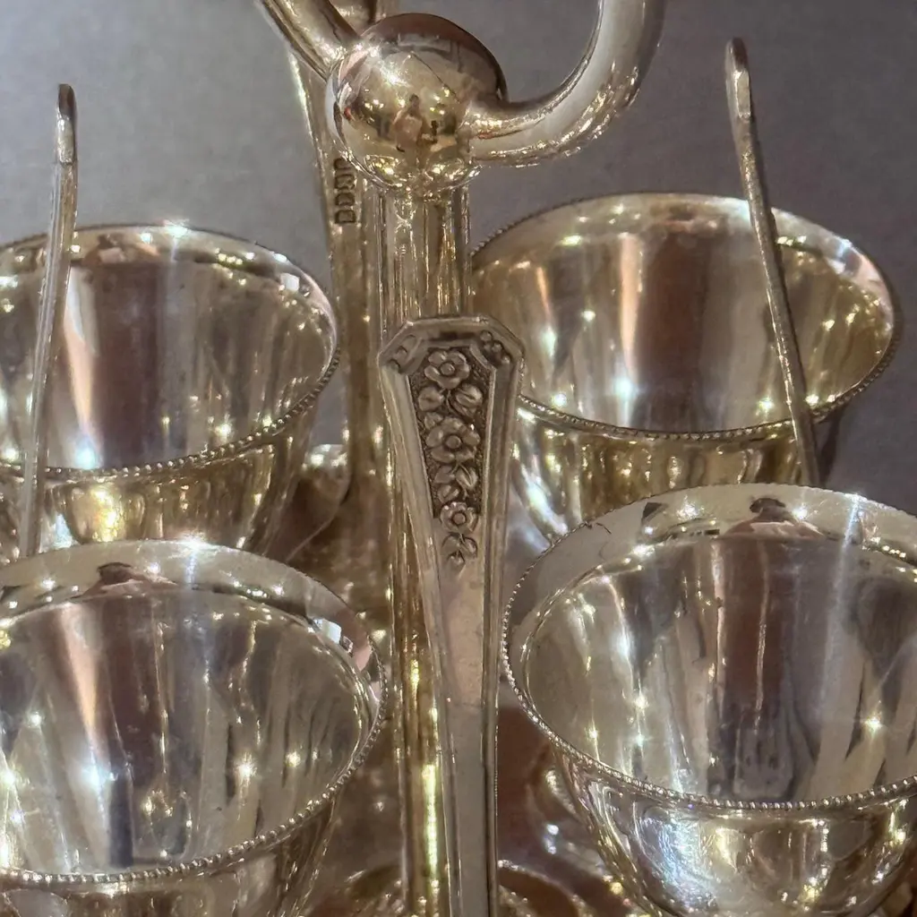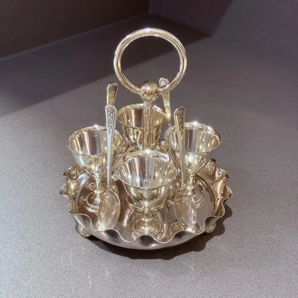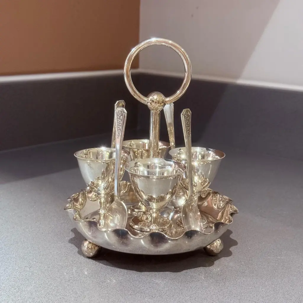 Antique Silver-Plated Egg Coddler Stand, Mappin & Webbs Princess Plate London & Sheffield, Art Deco, circa 1880This stunning antique silver-plated egg coddler stand by Mapple Princess Plate, London & Sheffield exemplifies the finest craftsmanship of the late 19th century. Designed in a refined Art Deco style circa 1880, this remarkable piece combines both functionality and aesthetic elegance.The set features four silver-plated egg holders with four matching spoons, all gracefully presented on a finely detailed pierced basket stand resting on four balled feet. The central ring handle provides balance and ease of serving, while the sculpted edge and polished finish add sophistication to the overall design.Each egg cup measures approximately 2 1/3" in height by 1 7/8" in diameter, and the basket itself measures 6 1/2" in height by 6 3/4" in width by 7 3/4" in depth. All components — including the basket, spoons, and egg holders — are clearly stamped with the maker’s marks, attesting to their authenticity and quality.This luxurious silver-plated set remains in excellent antique condition, with minor age-related patina that enhances its vintage charm. It makes a perfect addition to elegant breakfast tables, fine dining collections, or luxury interiors, and serves equally well as a decorative display piece.We offer professional polishing and engraving removal upon request (additional charge; shipping delay applies).A matching toast holder, two pots with pearl inlays, an extra tray, cream jug, salt shaker, and lidded bacon warmer server can also be included as part of a coordinated breakfast silver set, available at extra cost.Details:Maker: Mapple Princess Plate, London & SheffieldMaterial: Silver-Plated MetalPeriod: Circa 1880Style: Art Deco / VictorianIncludes: 4 Egg Holders, 4 Matching Spoons, Decorative StandCondition: Excellent Antique ConditionDimensions: H 6.5 in x W 6.75 in x D 7.75 inMarked: Fully stamped Mappin & Webbs (see photos)Antique Silver-Plated Egg Coddler, Mapple Princess Plate, Sheffield Silver, English Silver Breakfast Set, Victorian Silverware, Art Deco Tableware, Collectible Silver Gift, Fine Dining Accessory, Antique English Silver, Luxury Home Decor, Silver Egg Cups and Spoons, Decorative Silver Stand, British Silver Plate, Vintage Silver Set, Heirloom Quality Silver, Silver Gift for Collectors, Elegant Table Centerpiece.