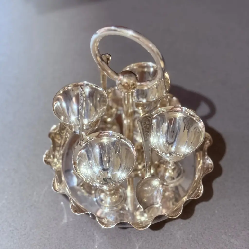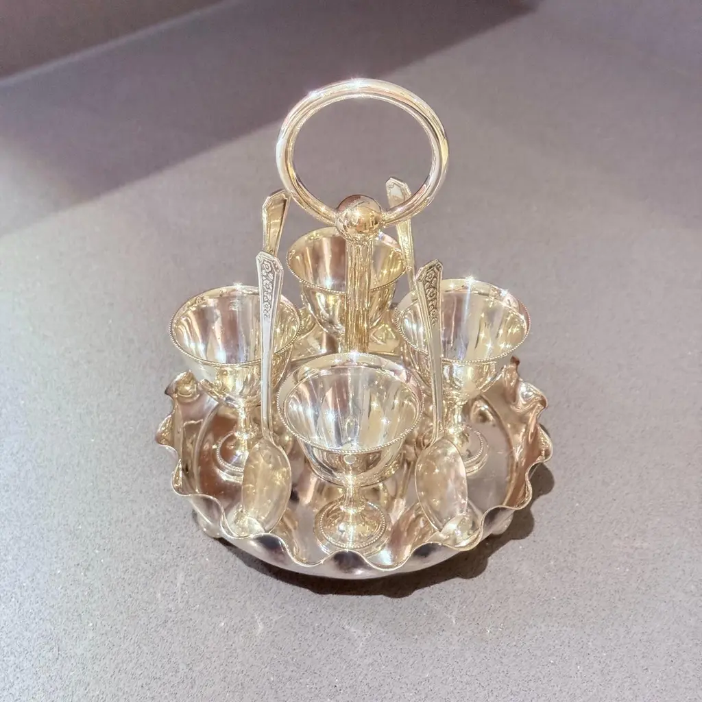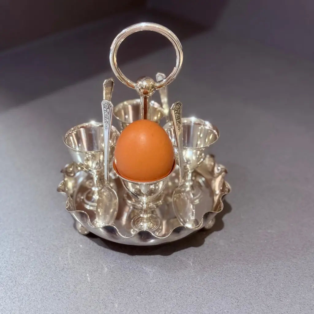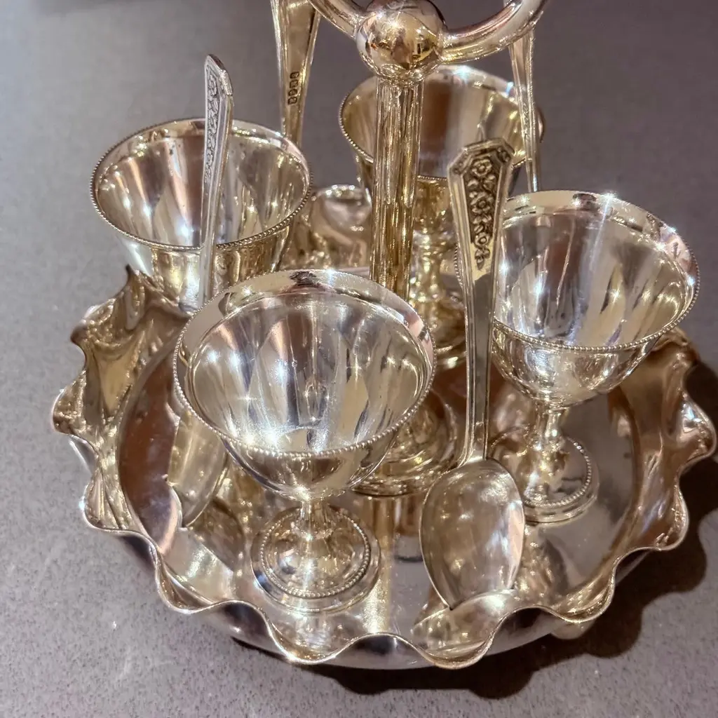 Antique Silver-Plated Egg Coddler Stand, Mappin & Webbs Princess Plate London & Sheffield, Art Deco, circa 1880This stunning antique silver-plated egg coddler stand by Mapple Princess Plate, London & Sheffield exemplifies the finest craftsmanship of the late 19th century. Designed in a refined Art Deco style circa 1880, this remarkable piece combines both functionality and aesthetic elegance.The set features four silver-plated egg holders with four matching spoons, all gracefully presented on a finely detailed pierced basket stand resting on four balled feet. The central ring handle provides balance and ease of serving, while the sculpted edge and polished finish add sophistication to the overall design.Each egg cup measures approximately 2 1/3" in height by 1 7/8" in diameter, and the basket itself measures 6 1/2" in height by 6 3/4" in width by 7 3/4" in depth. All components — including the basket, spoons, and egg holders — are clearly stamped with the maker’s marks, attesting to their authenticity and quality.This luxurious silver-plated set remains in excellent antique condition, with minor age-related patina that enhances its vintage charm. It makes a perfect addition to elegant breakfast tables, fine dining collections, or luxury interiors, and serves equally well as a decorative display piece.We offer professional polishing and engraving removal upon request (additional charge; shipping delay applies).A matching toast holder, two pots with pearl inlays, an extra tray, cream jug, salt shaker, and lidded bacon warmer server can also be included as part of a coordinated breakfast silver set, available at extra cost.Details:Maker: Mapple Princess Plate, London & SheffieldMaterial: Silver-Plated MetalPeriod: Circa 1880Style: Art Deco / VictorianIncludes: 4 Egg Holders, 4 Matching Spoons, Decorative StandCondition: Excellent Antique ConditionDimensions: H 6.5 in x W 6.75 in x D 7.75 inMarked: Fully stamped Mappin & Webbs (see photos)Antique Silver-Plated Egg Coddler, Mapple Princess Plate, Sheffield Silver, English Silver Breakfast Set, Victorian Silverware, Art Deco Tableware, Collectible Silver Gift, Fine Dining Accessory, Antique English Silver, Luxury Home Decor, Silver Egg Cups and Spoons, Decorative Silver Stand, British Silver Plate, Vintage Silver Set, Heirloom Quality Silver, Silver Gift for Collectors, Elegant Table Centerpiece.