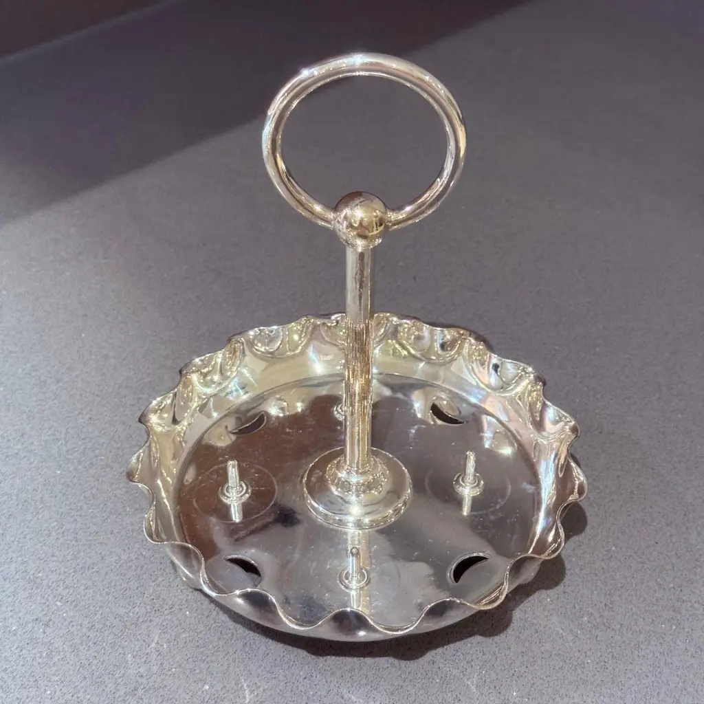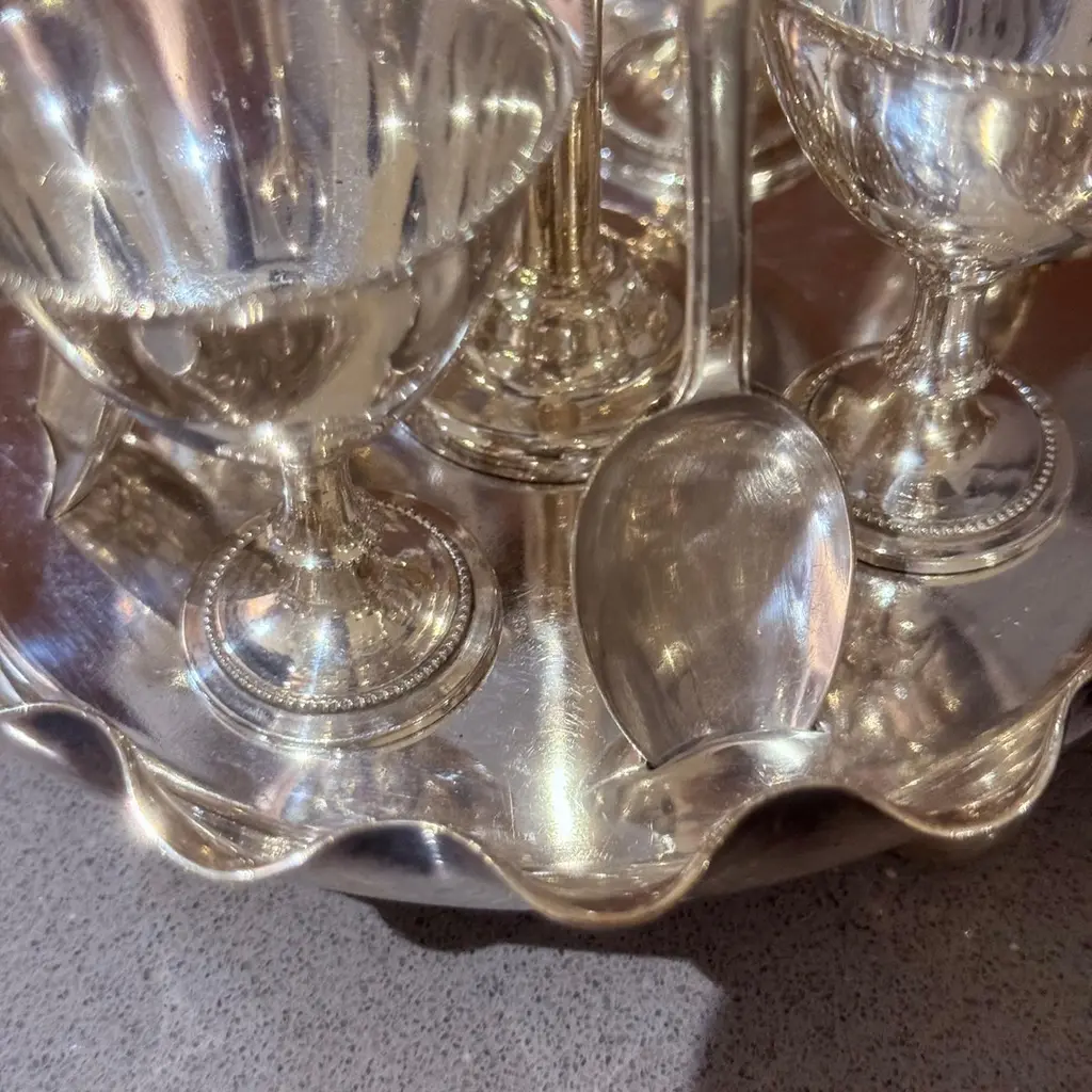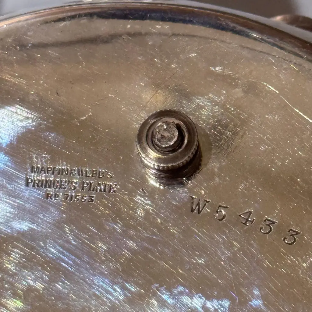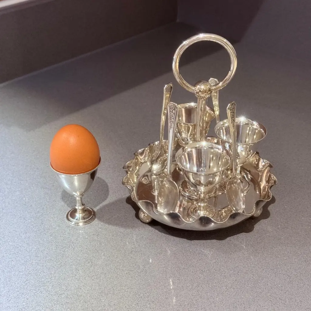 Antique Silver-Plated Egg Coddler Stand, Mappin & Webbs Princess Plate London & Sheffield, Art Deco, circa 1880This stunning antique silver-plated egg coddler stand by Mapple Princess Plate, London & Sheffield exemplifies the finest craftsmanship of the late 19th century. Designed in a refined Art Deco style circa 1880, this remarkable piece combines both functionality and aesthetic elegance.The set features four silver-plated egg holders with four matching spoons, all gracefully presented on a finely detailed pierced basket stand resting on four balled feet. The central ring handle provides balance and ease of serving, while the sculpted edge and polished finish add sophistication to the overall design.Each egg cup measures approximately 2 1/3" in height by 1 7/8" in diameter, and the basket itself measures 6 1/2" in height by 6 3/4" in width by 7 3/4" in depth. All components — including the basket, spoons, and egg holders — are clearly stamped with the maker’s marks, attesting to their authenticity and quality.This luxurious silver-plated set remains in excellent antique condition, with minor age-related patina that enhances its vintage charm. It makes a perfect addition to elegant breakfast tables, fine dining collections, or luxury interiors, and serves equally well as a decorative display piece.We offer professional polishing and engraving removal upon request (additional charge; shipping delay applies).A matching toast holder, two pots with pearl inlays, an extra tray, cream jug, salt shaker, and lidded bacon warmer server can also be included as part of a coordinated breakfast silver set, available at extra cost.Details:Maker: Mapple Princess Plate, London & SheffieldMaterial: Silver-Plated MetalPeriod: Circa 1880Style: Art Deco / VictorianIncludes: 4 Egg Holders, 4 Matching Spoons, Decorative StandCondition: Excellent Antique ConditionDimensions: H 6.5 in x W 6.75 in x D 7.75 inMarked: Fully stamped Mappin & Webbs (see photos)Antique Silver-Plated Egg Coddler, Mapple Princess Plate, Sheffield Silver, English Silver Breakfast Set, Victorian Silverware, Art Deco Tableware, Collectible Silver Gift, Fine Dining Accessory, Antique English Silver, Luxury Home Decor, Silver Egg Cups and Spoons, Decorative Silver Stand, British Silver Plate, Vintage Silver Set, Heirloom Quality Silver, Silver Gift for Collectors, Elegant Table Centerpiece.