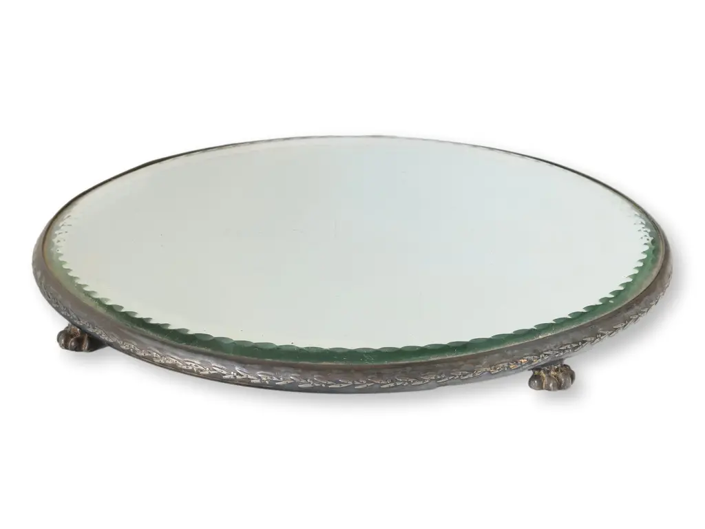 Antique silver-plate mirrored plateau with a beveled and beaded edge and delicate claw feet. A timeless way to elevate your centerpiece, barware, or candles, it also makes a stunning display for perfume bottles, vanity items, or jewelry. The mirror reflects light beautifully, and the silver rim shows age-appropriate patina that enhances its character and charm.