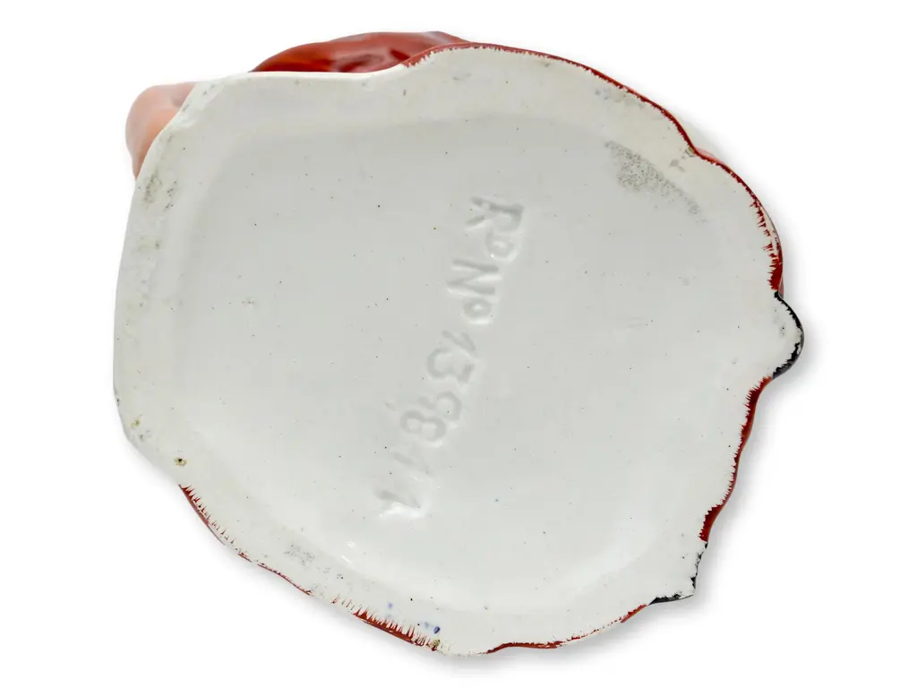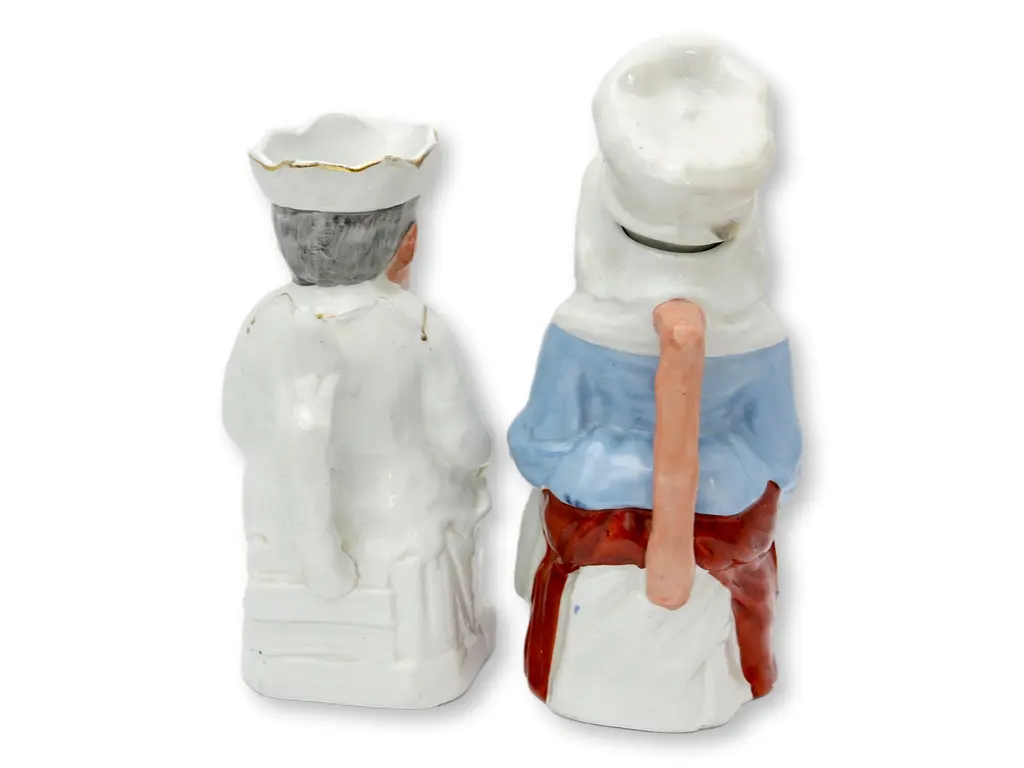 Rare pair of hand-painted antique Staffordshire Punch and Judy character pitchers. Judy has original bonnet lid. Dimensions: Punch pitcher, 6.25"L x 5"W x 9.5"H; Judy pitcher, 5.75"L x 5"W x 9.75"H. Registration number on bottom. Condition: Judy has a chip on her bonnet, crazing; Mr. Punch has light edge wear and crazing.