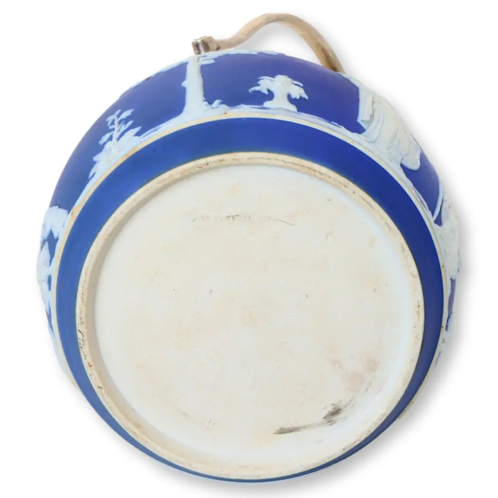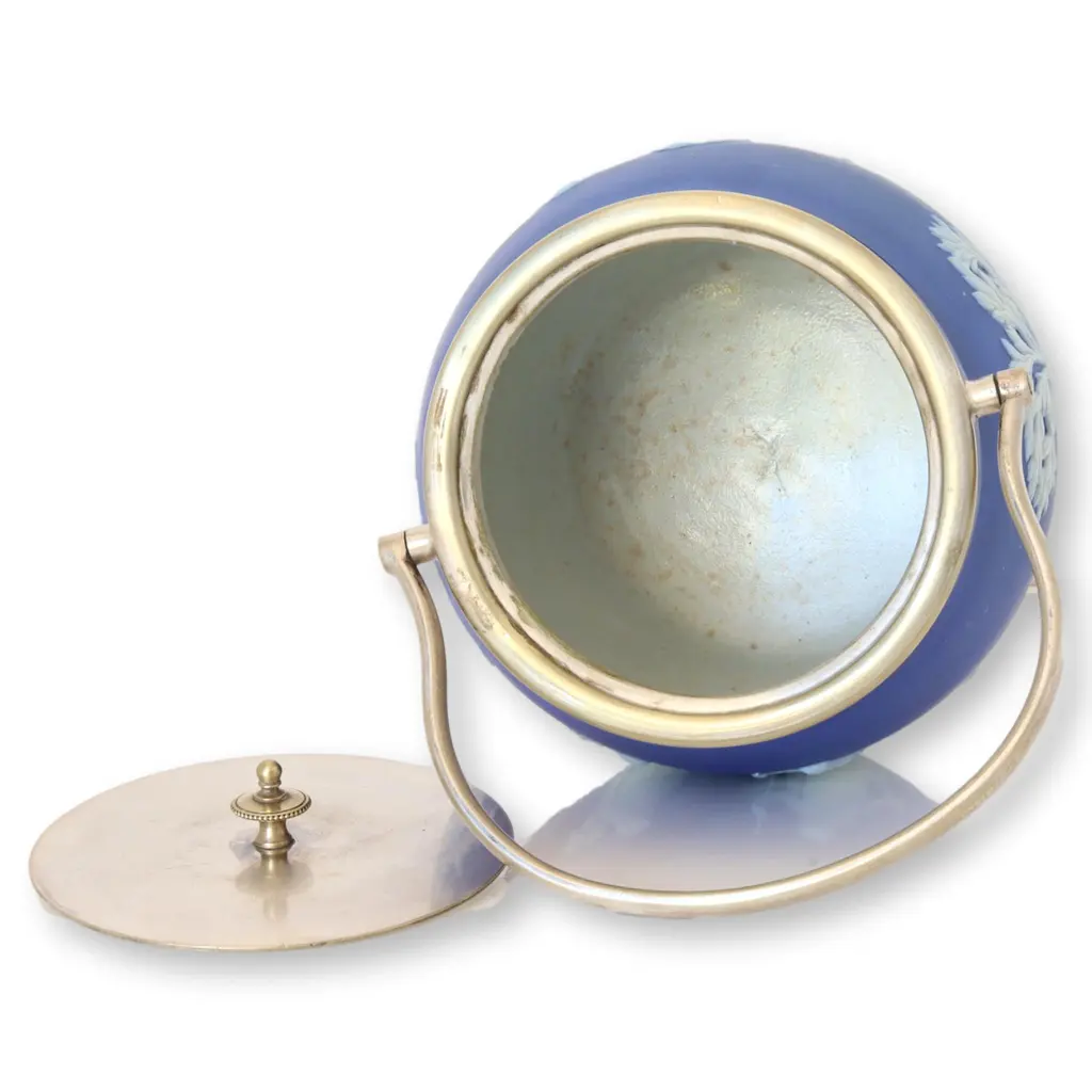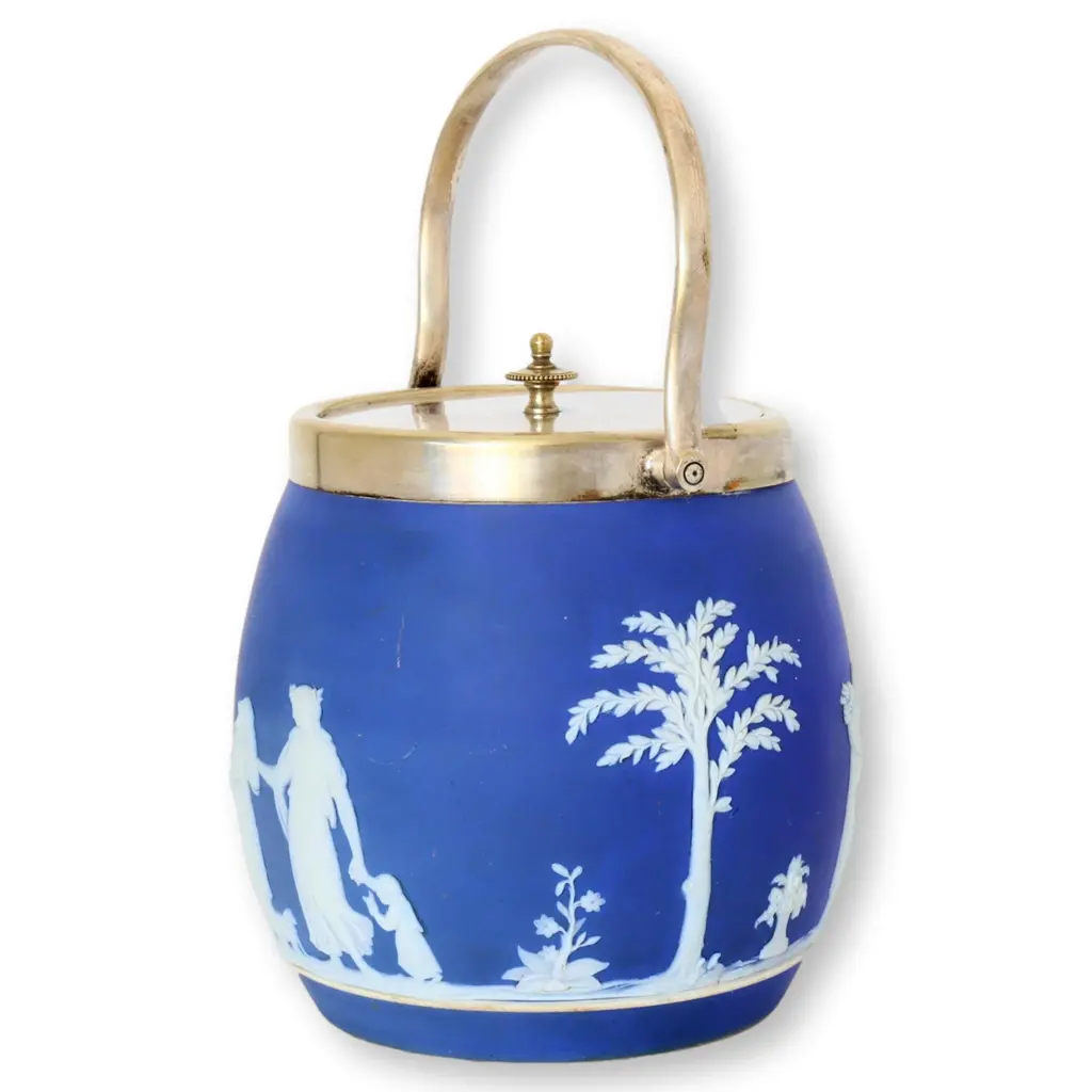 Lovely English Wedgwood Jasperware ceramic and silverplate biscuit barrel. These are more commonly used today as ice buckets. With handle up, 8.75"H. This is an older piece, as the clay underneath is white and the blue glaze is "dipped on" (hence the name dip glazed). The silver-plating is polished to a fine satin patina. Maker's mark on underside.