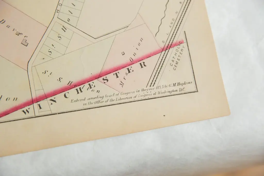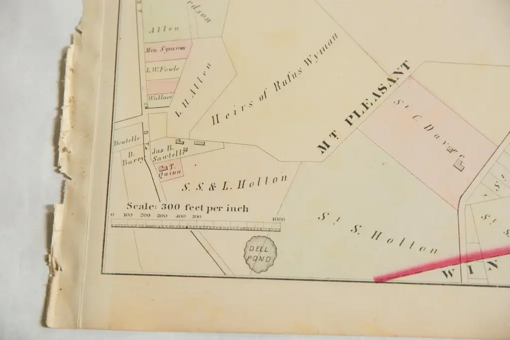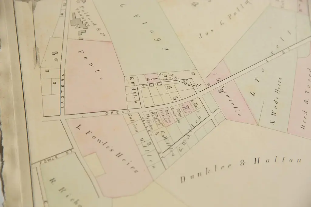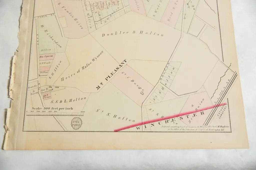 :: Antique G.M. Hopkins & Co. 1875 map of part of the town of Woburn, M.A. (Plate G). Of note are Mt. Pleasant, the S.O. Pollard & Co. Tannery, Dell Pond, and part of the B.L. and N. Rail Road. Map also includes the various landowners' names and property lines.