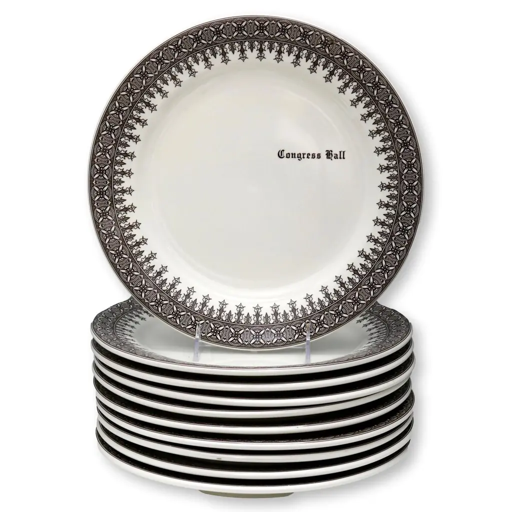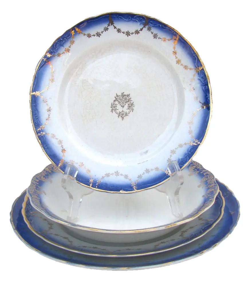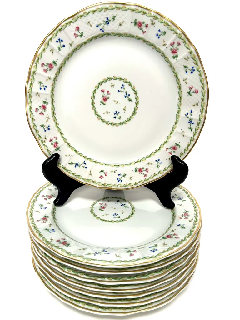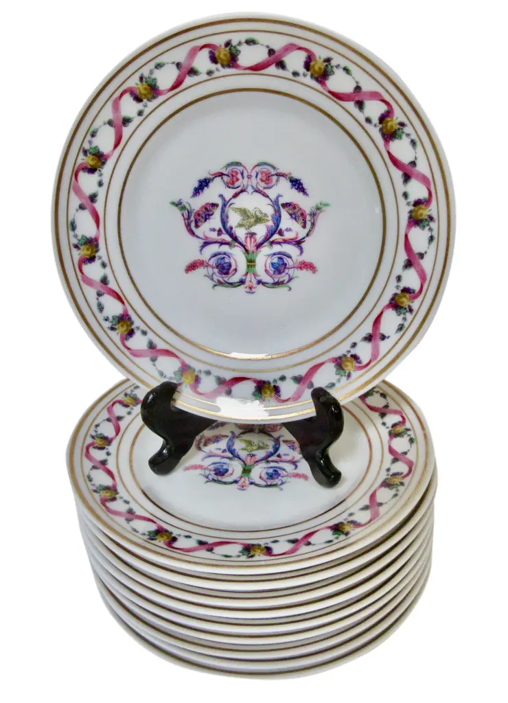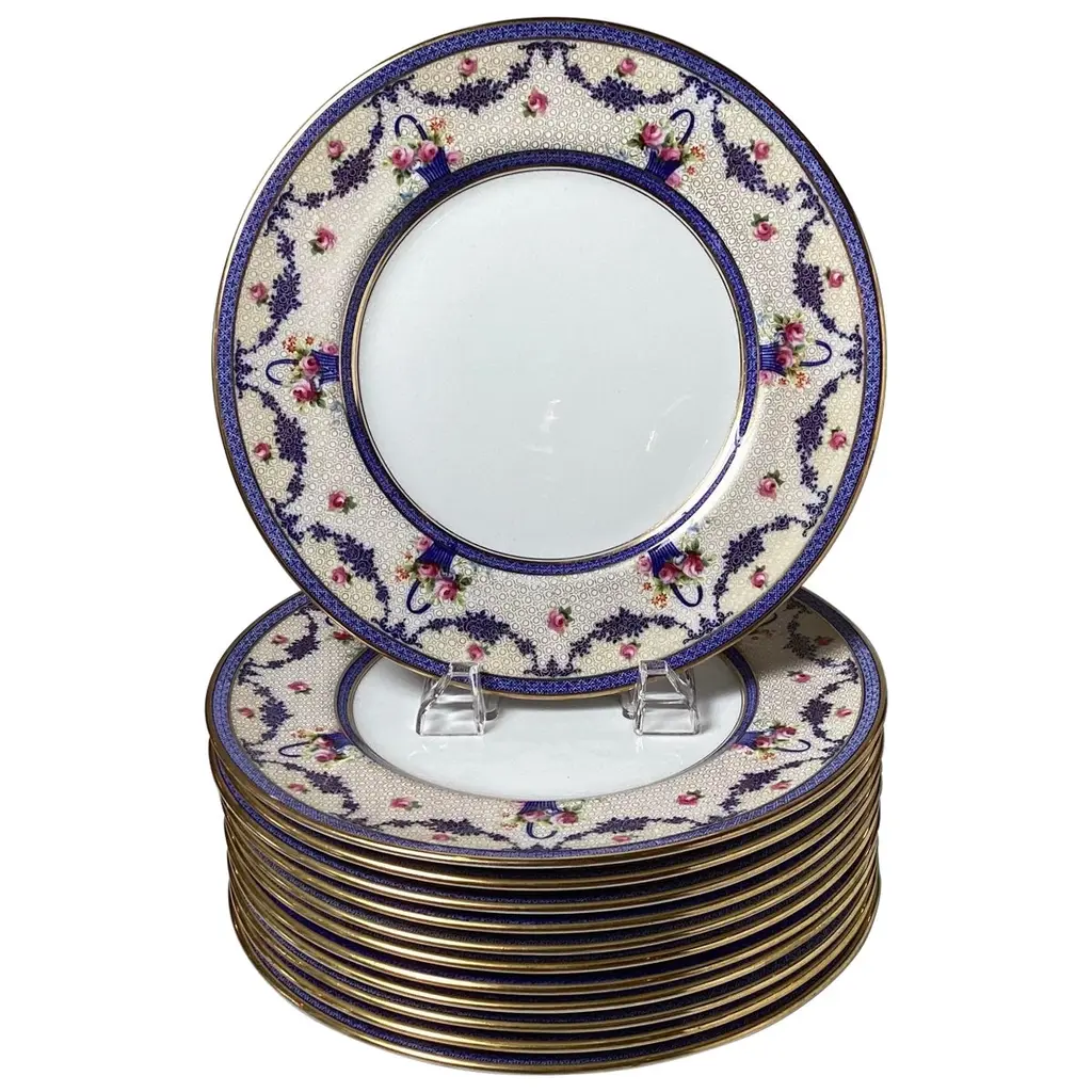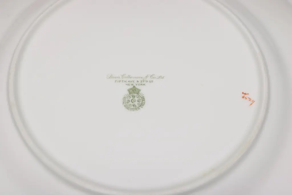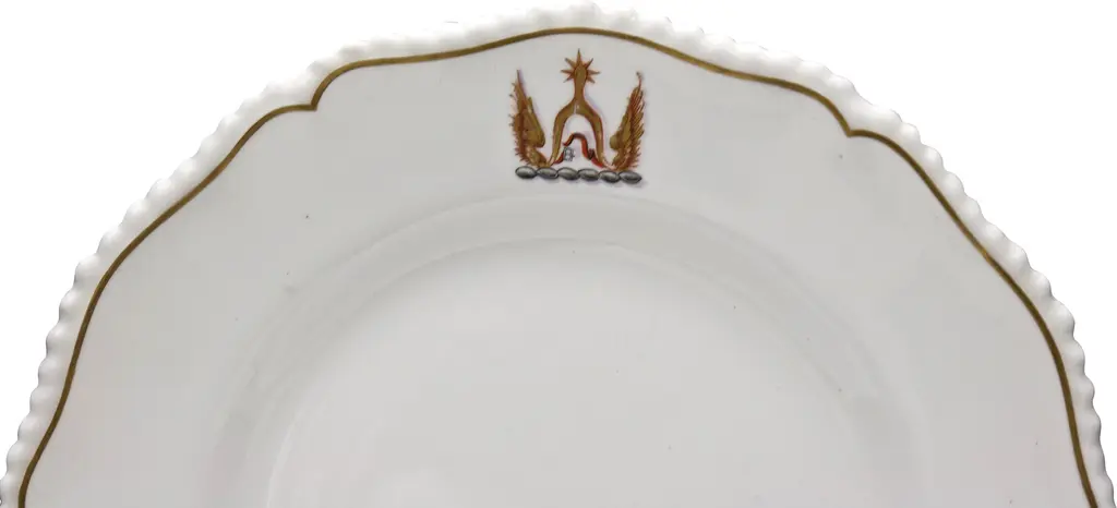 Antique Royal Worcester dinner plates with English family coat of arms. Excellent quality as expected of the Worcester factory with gadrooned and gilded edges. Light wear, minimal crazing. Makers mark on bottom.