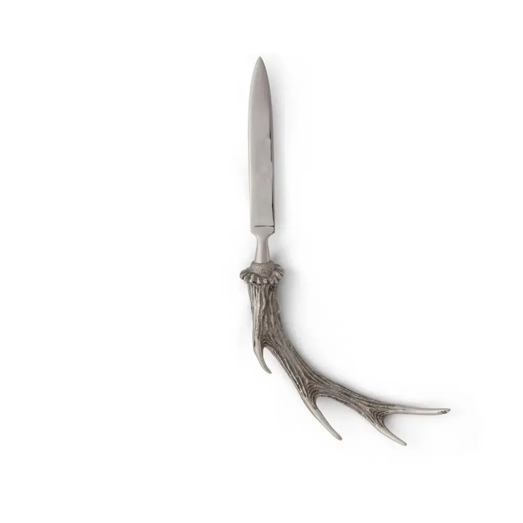Slice through any cake in style with this elegant and fun Antler Cake Knife from Arthur Court. The sleek blade extends from the antler's base, while divided points create a unique handhold.