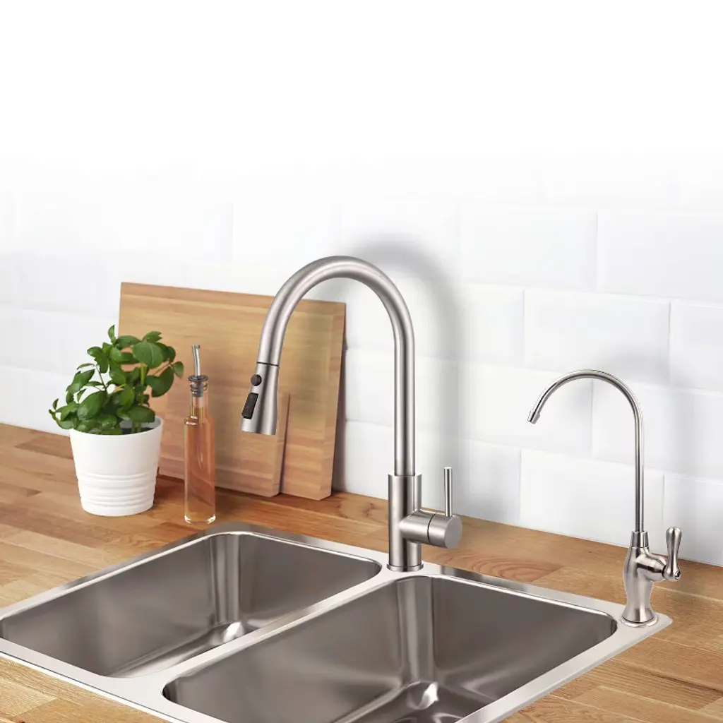 Premium ceramic disc operated, certified lead-free RO drinking water dispensing faucets. 1/4 inch input. Solid metal handle controls the smooth and durable 1/4 turn ceramic disc valve, allowing pure water to pour at any rate you desire. Swivel spout. These high quality faucets are worthy upgrades to consider. This Non-air gap faucet simply has one water line that goes up to the faucet. No gurgling sound bothers and there is less risk of clogging.
