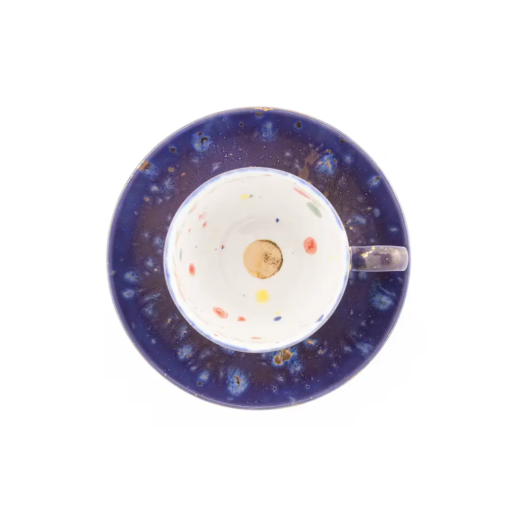 This delightful set of two espresso cups with coordinated saucers celebrate Baroque art with its use of bright golden details. A golden festoon adorns the interior right below the rim, shimmering gold leaf details also mottling the outer surfaces hand-painted in deep blue to arise the illusion of sipping espresso under a starry sky. Slight differences from the pictured item are to be expected and cherished.