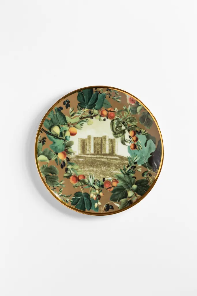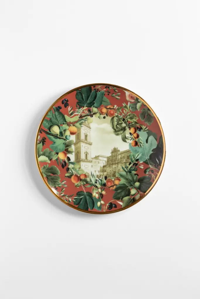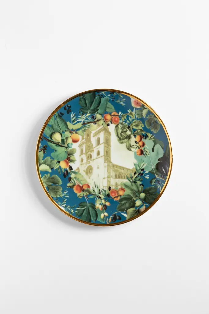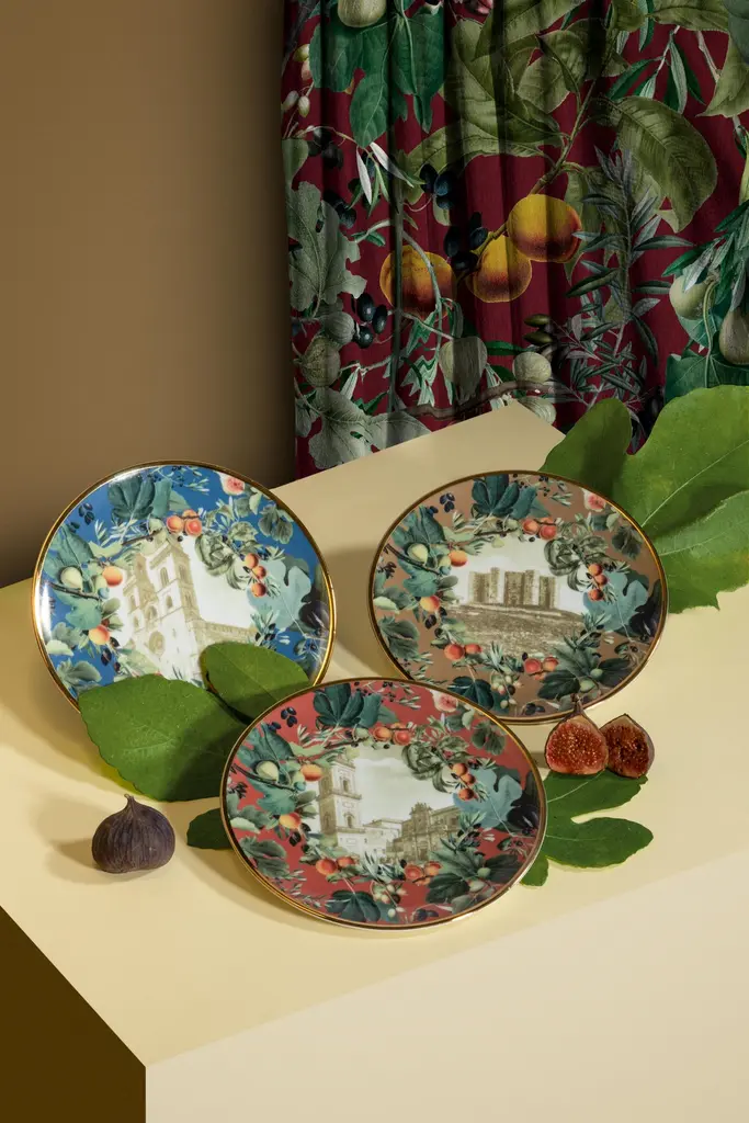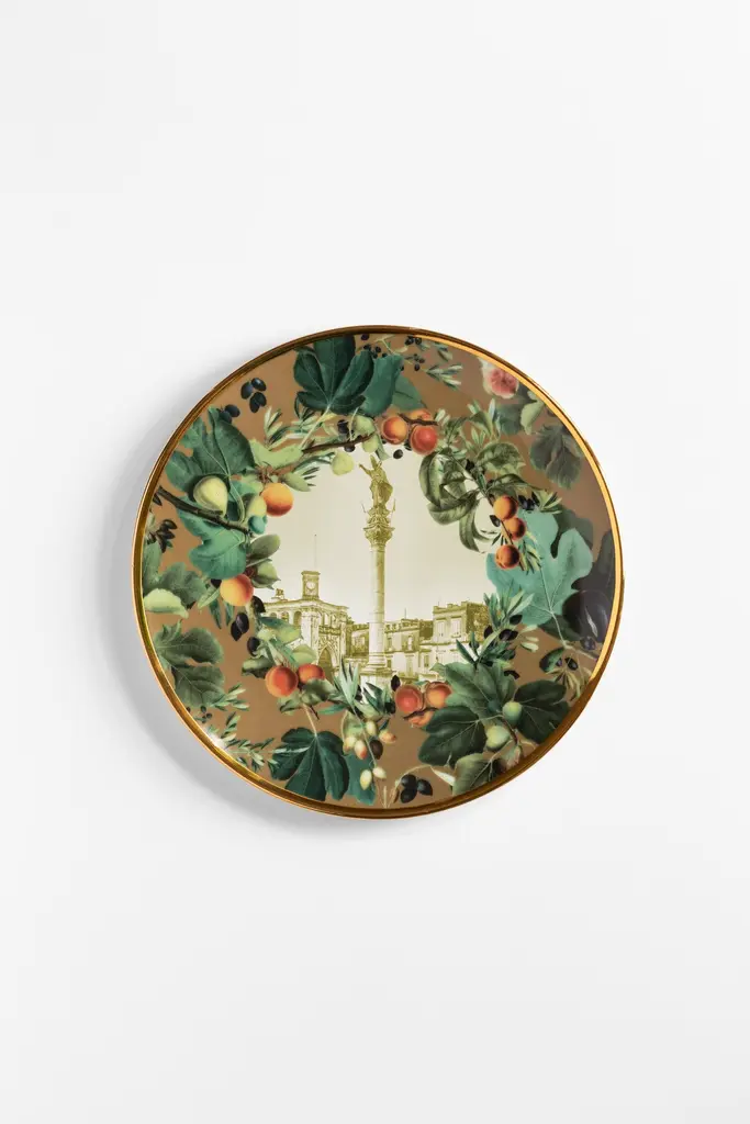 Inspired by Vito Nesta's home town, Puglia, in southern Italy, this unique set of plates is perfect to serve desserts. A large platter and six small plates to portion and serve cakes or the Apulia Panettone, created with the pastry chef Pantaleo Dell'Olio.The design is focused on Puglia's iconic monuments, surrounded by branches of branches of olive, fig and apricot trees.Measures: The platter is 32cm in diameter, the serving plates 21cm.