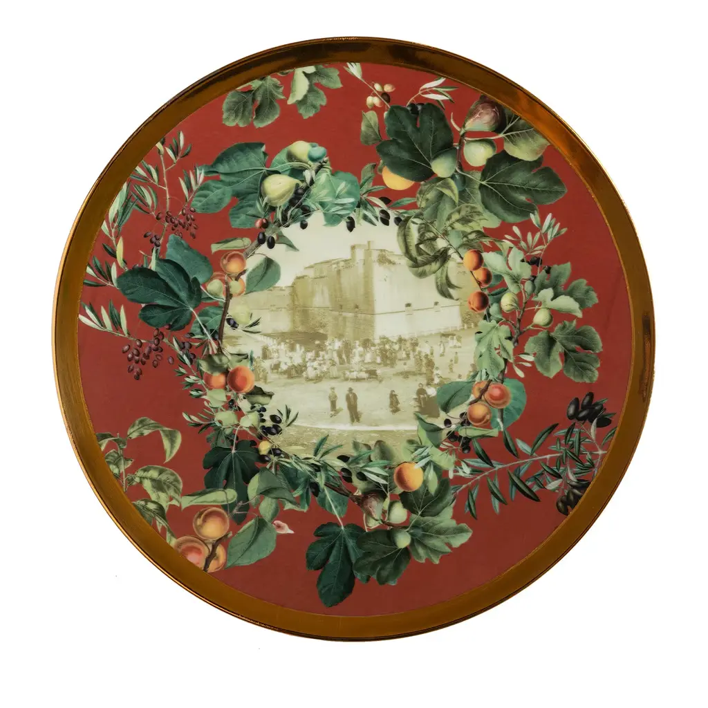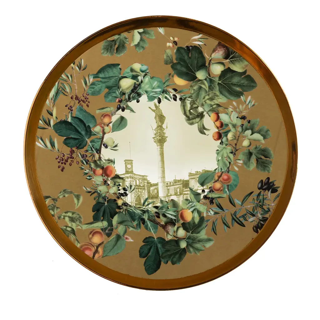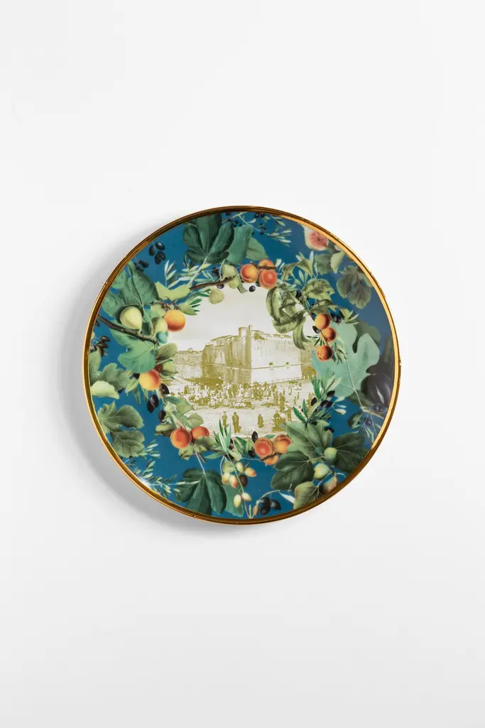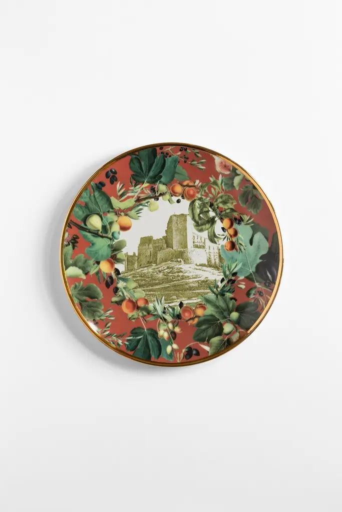 Inspired by Vito Nesta's home town, Puglia, in southern Italy, this unique set of plates is perfect to serve desserts. A large platter and six small plates to portion and serve cakes or the Apulia Panettone, created with the pastry chef Pantaleo Dell'Olio.The design is focused on Puglia's iconic monuments, surrounded by branches of branches of olive, fig and apricot trees.Measures: The platter is 32cm in diameter, the serving plates 21cm.
