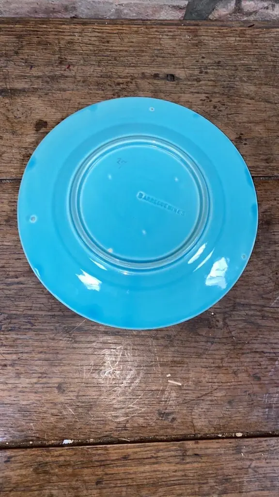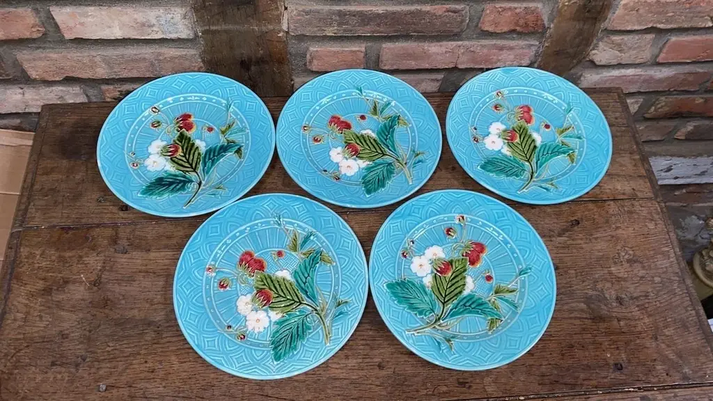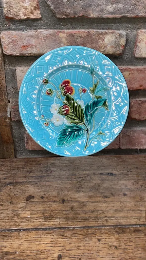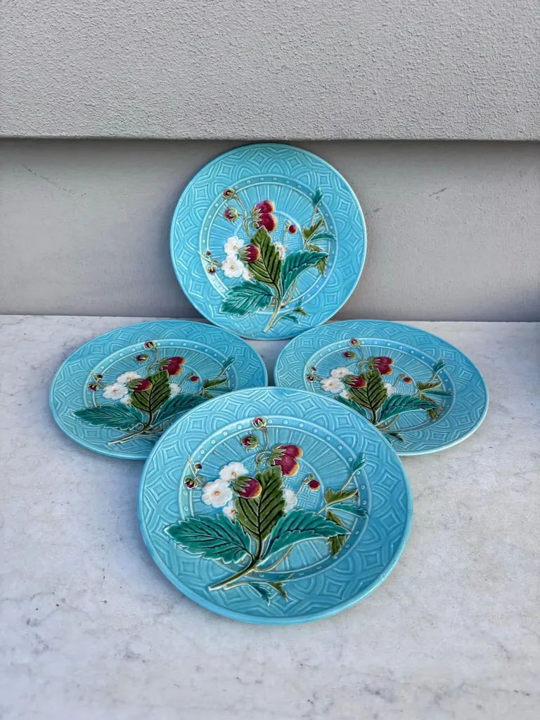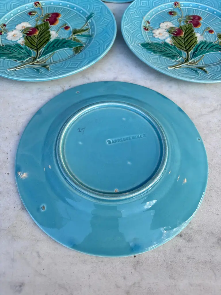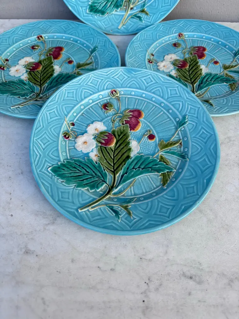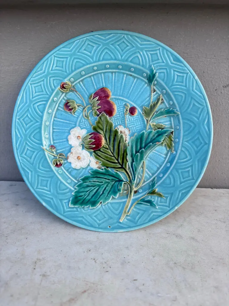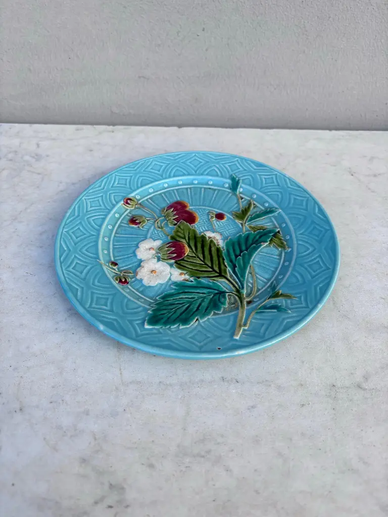 Aqua Majolica Strawberries Plate Sarreguemines, Circa 1880