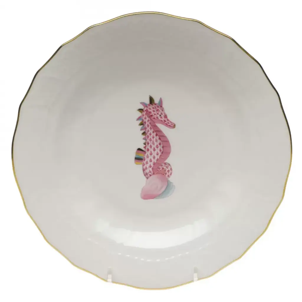 It was only a matter of time before Herend's figurines finally crossed over to dinnerware. The new Aquatic collection features four different motifs: a raspberry seahorse, a rust tulip shell, a green scallop shell and a blue starfish. Hand painted in Hungary. Now the biggest porcelain manufactory in Europe, Herend was founded in 1826 to produce earthenware in the small Hungarian village for which it was named. At the time, Hungary was flooded with low-cost pottery, but in 1839, Mor Fischer became the Manufactory’s new owner and he decided to focus on producing dinnerware replacement pieces for Europe’s royal families to complement their valuable porcelain patterns from Germany and the Far East. As his client base grew, Fischer commissioned his artists to begin designing dinnerware patterns of their own. Queen Victoria’s 1851 purchase of a large set for Windsor Castle was a milestone, setting the stage for aristocrats throughout Europe to clamor for Herend in their estates. In the 1850s, Herend added meticulously-crafted figurines to its creations. Herend’s trademark fishnet pattern, which is widely recognized and prized as Herend’s signature design, started in 1858 when an artist who was intrigued with a Chinese plate’s fish scale design painted it onto a rooster figurine to imitate feathers.